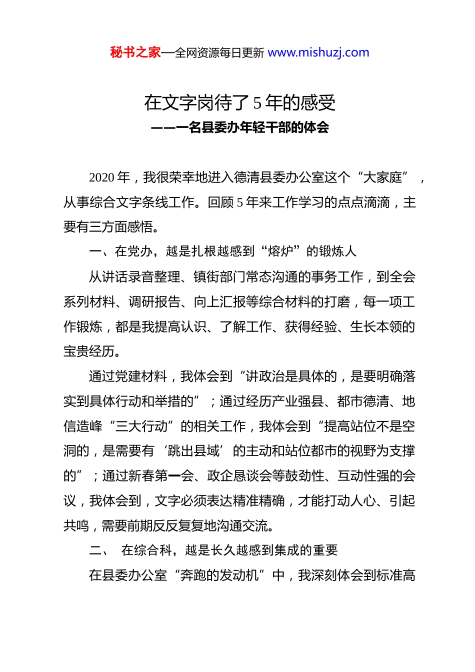 秘书之家—全网资源每日更新 www.mishuzj.com在文字岗待了 5 年的感受——一名县委办年轻干部的体会2020 年,我很荣幸地进入德清县委办公室这个“大家庭”,从事综合文字条线工作。回顾 5 年来工作学习的点点滴滴,主要有三方面感悟。一、在党办,越是扎根越感到“熔炉”的锻炼人从讲话录音整理、镇街部门常态沟通的事务工作,到全会系列材料、调研报告、向上汇报等综合材料的打磨,每一项工作锻炼,都是我提高认识、了解工作、获得经验、生长本领的宝贵经历。通过党建材料,我体会到“讲政治是具体的,是要明确落实到具体行动和举措的”;通过经历产业强县、都市德清、地信造峰“三大行动”的相关工作,我体会到“提高站位不是空洞的,是需要有‘跳出县域’的主动和站位都市的视野为支撑的”;通过新春第一会、政企恳谈会等鼓劲性、互动性强的会议,我体会到,文字必须表达精准精确,才能打动人心、引起共鸣,需要前期反反复复地沟通交流。二、 在综合科,越是长久越感到集成的重要在县委办公室“奔跑的发动机”中,我深刻体会到标准高秘书之家—全网资源每日更新 www.mishuzj.com担子重、覆盖面广,深刻体会到每个科室的职能差异、每颗“螺丝钉”的独一无二。作为众多“螺丝钉”中的其中一员,不仅要能落实好科室内的团队合作、共同进步,更要会利用科室间的职能优势,把上级的精神、部门镇街的实际、会议安排的目的、督查发现的问题、信息总结的经验做法等等,融入到文稿中,这样材料才会更有血肉、更加言之有物。三、在文字岗,越是深入越感到极致的魅力材料条线给我最大的体会是,“最好的文稿永远是下一稿”“最好的自己也一定是明天的自己”。每次文稿打磨或者知识库更新后,都能发现原有文稿的不足、都能找到可以改进的地方,在自己手中打磨了 N 稿的材料,到了领导那里,也可能只是达到了初步的要求。唯有在自身环节,把学习、领悟、转化、结合等方方面面做到极致,才能不断接近“以文辅政见成效”的标准要求。身处党办,需要有更高的格局和站位;身在综合条线,要时刻把握上情、中情、下情、外情;作为材料工作者,得有谋在关键处、参在点子上的能力水平。接下来,我将努力强化放眼全局想事、立足当前干事的意识,在分析研究上更精心、在文稿质量上更用心,在领会领导意图上更细心,努力干好每一天、干好每件事,争做出彩党办秘书之家—全网资源每日更新 www.mishuzj.com人。