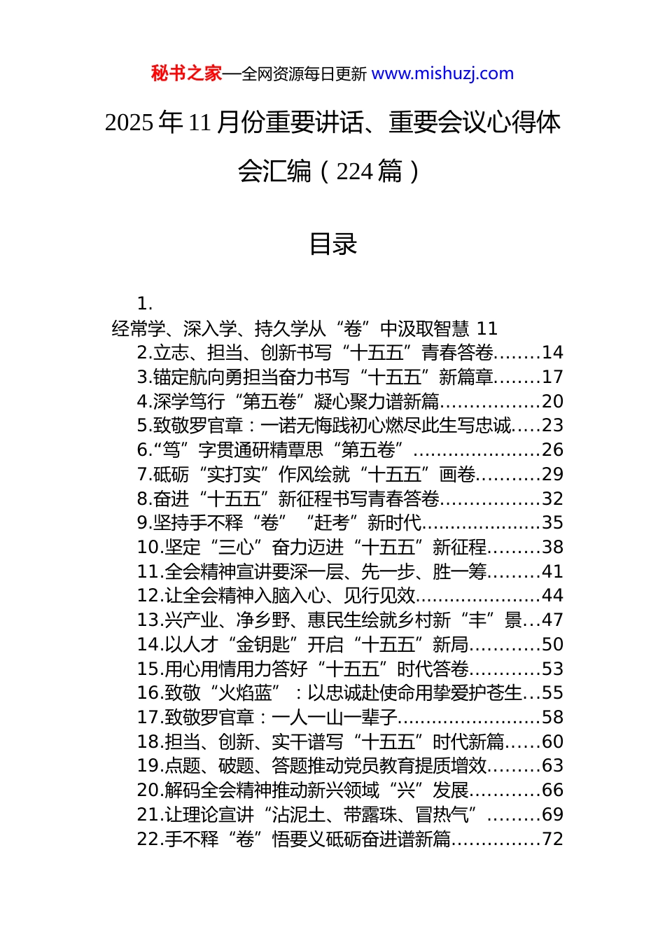 秘书之家—全网资源每日更新 www.mishuzj.com2025 年 11 月份重要讲话、重要会议心得体会汇编(224 篇)目录1.经常学、深入学、持久学从“卷”中汲取智慧 112.立志、担当、创新书写“十五五”青春答卷........143.锚定航向勇担当奋力书写“十五五”新篇章........174.深学笃行“第五卷”凝心聚力谱新篇.................205.致敬罗官章:一诺无悔践初心燃尽此生写忠诚.....236.“笃”字贯通研精覃思“第五卷”......................267.砥砺“实打实”作风绘就“十五五”画卷...........298.奋进“十五五”新征程书写青春答卷.................329.坚持手不释“卷”“赶考”新时代.....................3510.坚定“三心”奋力迈进“十五五”新征程.........3811.全会精神宣讲要深一层、先一步、胜一筹.........4112.让全会精神入脑入心、见行见效......................4413.兴产业、净乡野、惠民生绘就乡村新“丰”景...4714.以人才“金钥匙”开启“十五五”新局............5015.用心用情用力答好“十五五”时代答卷............5316.致敬“火焰蓝”:以忠诚赴使命用挚爱护苍生...5517.致敬罗官章:一人一山一辈子.........................5818.担当、创新、实干谱写“十五五”时代新篇......6019.点题、破题、答题推动党员教育提质增效.........6320.解码全会精神推动新兴领域“兴”发展............6621.让理论宣讲“沾泥土、带露珠、冒热气”.........6922.手不释“卷”悟要义砥砺奋进谱新篇...............72秘书之家—全网资源每日更新 www.mishuzj.com23.学好“第五卷”需以行践学............................7524.以奋进姿态走好“十五五”新征程...................7825.作风建设要融入日常、抓在经常、落在平常......8126.“接地气”宣讲以小见大让全会精神直抵人心....8427.“卷”启新知:从学懂到弄通再到做实的成长....8728.奋进“十五五”在新征程上展现新作为............9029.潜心研读“第五卷”凝心聚力启新程...............9430.全国消防日:坚持人民至上筑牢全民安全屏障...9731.让全会精神带着“烟火气”入心....................10132.学深悟透“卷”中意以青春担当走好赶考之路.10433.以高水平落实让“十五五”宏伟蓝图变细腻实景...........................................................................10734.以青春之名赴时代新程................................11035.在“枝叶关情”中感悟为民初心....................11336.真学第五卷奋进“在状态”..........................11637.常换位、不缺位、做到位书写担当为民新篇章.11938.怀梦想、勇拼搏、绽芳华奔赴“十五五”征程.12239.激发党员先锋力量奋进“十五五”新征程.......12540.锚定高标准落实绘就“十五五”实景长卷.......12941.拧紧“三根发条”推进作风建设常态长效.......13242.深学、细悟、笃行让全会精神走深走实..........13543.乡村振兴踏歌行绘就“十五五”新图景..........13844.致敬无名英雄:热血践忠诚生命铸丰碑..........14245.筑牢实体经济根基谱写“十五五”发展新篇....14646.把舵、扬帆、划桨助“十五五”航船破浪前行.14947.把理论光芒转化为推动高质量发展的不竭动能.15248.解锁福建舰挺进深蓝“密码”汲取奋进力量....15549.深读细悟笃行从“卷”中汲取力量.................15850.循“梅州足迹”把“土特产”做成“金饭碗”.16151.奋进“十五五”推动发展提质“步步高”.......16552.深学笃行“第五卷”砥砺“三心”谱新篇.......168秘书之家—全网资源每日更新 www.mishuzj.com53.循迹“岭南之行”绘就老区振兴“新景”.......17154.以有为青春奋进“十五五”新征程.................17455.执产业之笔绘宜居画卷铸治理之魂.................17756.铸魂、拓新、为民奋楫扬帆“十五五”新征程.18057.擘画“十五五”新蓝图谱写时代奋进新篇章....18358.奋进“十五五”新征程谱写现代化建设新篇章.18659.汲取“卷”中智慧以青春之力走好新赶考路....19060.理论宣讲要用心、用情、用力.......................19361.岭南之行:读懂“一馆一园一展”...