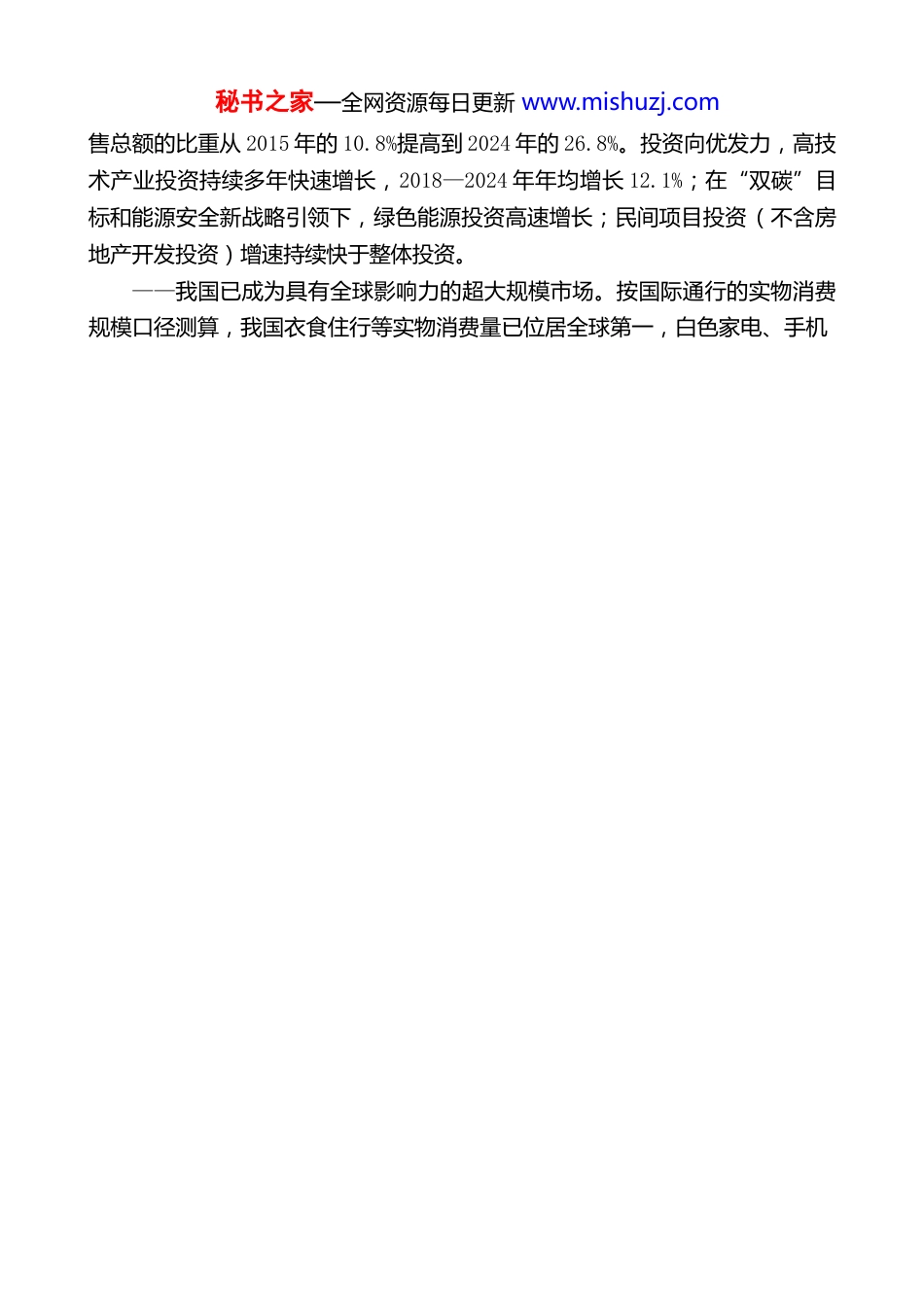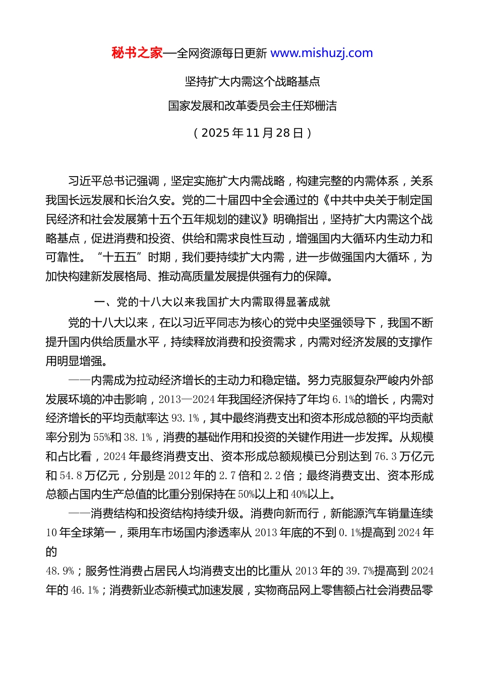 秘书之家—全网资源每日更新 www.mishuzj.com坚持扩大内需这个战略基点国家发展和改革委员会主任郑栅洁(2025 年 11 月 28 日)习近平总书记强调,坚定实施扩大内需战略,构建完整的内需体系,关系我国长远发展和长治久安。党的二十届四中全会通过的《中共中央关于制定国民经济和社会发展第十五个五年规划的建议》明确指出,坚持扩大内需这个战略基点,促进消费和投资、供给和需求良性互动,增强国内大循环内生动力和可靠性。“十五五”时期,我们要持续扩大内需,进一步做强国内大循环,为加快构建新发展格局、推动高质量发展提供强有力的保障。一、党的十八大以来我国扩大内需取得显著成就党的十八大以来,在以习近平同志为核心的党中央坚强领导下,我国不断提升国内供给质量水平,持续释放消费和投资需求,内需对经济发展的支撑作用明显增强。——内需成为拉动经济增长的主动力和稳定锚。努力克服复杂严峻内外部发展环境的冲击影响,2013—2024 年我国经济保持了年均 6.1%的增长,内需对经济增长的平均贡献率达 93.1%,其中最终消费支出和资本形成总额的平均贡献率分别为 55%和 38.1%,消费的基础作用和投资的关键作用进一步发挥。从规模和占比看,2024 年最终消费支出、资本形成总额规模已分别达到 76.3 万亿元和 54.8 万亿元,分别是 2012 年的 2.7 倍和 2.2 倍;最终消费支出、资本形成总额占国内生产总值的比重分别保持在 50%以上和 40%以上。——消费结构和投资结构持续升级。消费向新而行,新能源汽车销量连续10 年全球第一,乘用车市场国内渗透率从 2013 年底的不到 0.1%提高到 2024 年的48.9%;服务性消费占居民人均消费支出的比重从 2013 年的 39.7%提高到 2024年的 46.1%;消费新业态新模式加速发展,实物商品网上零售额占社会消费品零秘书之家—全网资源每日更新 www.mishuzj.com售总额的比重从 2015 年的 10.8%提高到 2024 年的 26.8%。投资向优发力,高技术产业投资持续多年快速增长,2018—2024 年年均增长 12.1%;在“双碳”目标和能源安全新战略引领下,绿色能源投资高速增长;民间项目投资(不含房地产开发投资)增速持续快于整体投资。——我国已成为具有全球影响力的超大规模市场。按国际通行的实物消费规模口径测算,我国衣食住行等实物消费量已位居全球第一,白色家电、手机秘书之家—全网资源每日更新 www.mishuzj.com人均消费量处于全球领先水平;按世界银行公布的购买力平价法计算,我国已成为全球第一大消费市场。我国有 14 亿多人口、庞大的中等收入群体,服务消费需求持续释放,消费同现代科技和生产方式进一步结合带动新兴消费较快增长,我国作为全球最具潜力的消费市场正在不断成长壮大。总的看,在重大政策、重大项目、重大工程等的带动下,我国内需规模持续扩大、质量持续提升、国际影响力持续增强,充分彰显了我国经济基础稳、优势多、韧性强、潜能大,体现了长期向好的支撑条件和基本趋势。党的十八大以来特别是在“十四五”时期,我国在扩大内需方面积极探索,形成了一些行之有效的经验做法。(一)坚持在实践中不断丰富完善扩大内需的政策体系。过去十几年,党中央、国务院部署实施促进消费带动转型升级十大行动、完善消费体制机制、促进民间投资健康发展等政策举措,2022 年制定实施的《扩大内需战略规划纲要(2022—2035 年)》,进一步明确了扩大内需的主要目标、重点任务和具体举措。2024 年党中央决策发行超长期特别国债,用于支持国家重大战略实施和重点领域安全能力建设(简称“两重”建设),支持大规模设备更新和消费品以旧换新(简称“两新”政策),持续扩大内需,有效应对外部冲击。(二)坚持把扩大内需和补短板惠民生结合起来。通过实施就业优先政策、完善社会保障体系等,持续增加城乡居民收入,2013—2024 年我国居民人均可支配收入年均实际增长 6.1%,人均消费支出年均实际增长 5.6%,其中人均教育文化娱乐、医疗保健消费支出年均分别增长 8%、9.7%。2025 年我国实施提振消费专项行动,在推动放松消费限制性措施、建立育儿补贴制度、逐步推行免费学前教育、完善节...