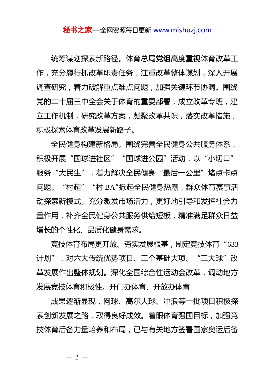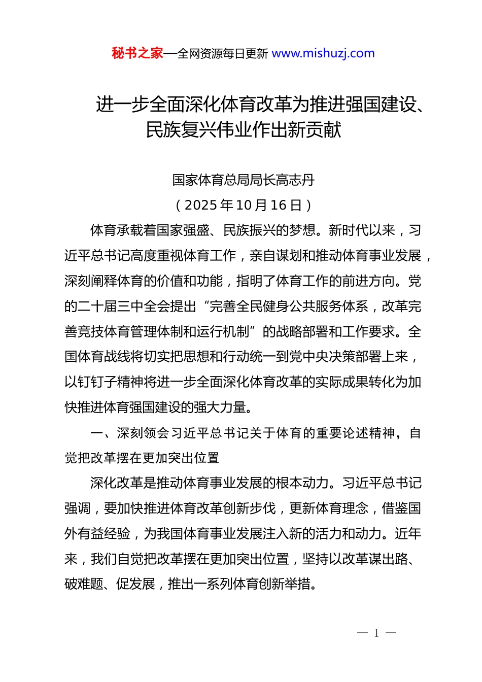 秘书之家—全网资源每日更新 www.mishuzj.com进一步全面深化体育改革为推进强国建设、民族复兴伟业作出新贡献国家体育总局局长高志丹(2025 年 10 月 16 日)体育承载着国家强盛、民族振兴的梦想。新时代以来,习近平总书记高度重视体育工作,亲自谋划和推动体育事业发展,深刻阐释体育的价值和功能,指明了体育工作的前进方向。党的二十届三中全会提出“完善全民健身公共服务体系,改革完善竞技体育管理体制和运行机制”的战略部署和工作要求。全国体育战线将切实把思想和行动统一到党中央决策部署上来,以钉钉子精神将进一步全面深化体育改革的实际成果转化为加快推进体育强国建设的强大力量。一、深刻领会习近平总书记关于体育的重要论述精神,自觉把改革摆在更加突出位置深化改革是推动体育事业发展的根本动力。习近平总书记强调,要加快推进体育改革创新步伐,更新体育理念,借鉴国外有益经验,为我国体育事业发展注入新的活力和动力。近年来,我们自觉把改革摆在更加突出位置,坚持以改革谋出路、破难题、促发展,推出一系列体育创新举措。— 1 —秘书之家—全网资源每日更新 www.mishuzj.com统筹谋划探索新路径。体育总局党组高度重视体育改革工作,充分履行抓改革职责任务,注重改革整体谋划,深入开展调查研究,着力破解重点难点问题,加强关键环节协调。围绕党的二十届三中全会关于体育的重要部署,成立改革专班,建立工作机制,研究改革方案,凝聚改革共识,落实改革措施,积极探索体育改革发展新路子。全民健身构建新格局。围绕完善全民健身公共服务体系,积极开展“国球进社区”“国球进公园”活动,以“小切口”服务“大民生”,着力解决全民健身“最后一公里”堵点卡点问题。“村超”“村 BA”掀起全民健身热潮,群众体育赛事活动探索新模式。充分激发市场活力,更好地引导和发挥社会力量作用,补齐全民健身公共服务供给短板,精准满足群众日益增长的个性化、品质化健身需求。竞技体育布局更开放。夯实发展根基,制定竞技体育“633计划”,对六大传统优势项目、三个基础大项、“三大球”改革发展作出整体规划。深化全国综合性运动会改革,调动地方发展竞技体育积极性。开门办体育、开放办体育成果逐渐显现,网球、高尔夫球、冲浪等一批项目积极探索创新发展之路,取得良好成效。着眼体育强国目标,加强竞技体育后备力量培养和布局,已与有关地方签署国家奥运后备— 2 —秘书之家—全网资源每日更新 www.mishuzj.com人才梯队共建协议。创设举办第一届全国青少年三大球运动会和第一届全国青少年田径运动会。体育产业带动新消费。大力发展赛事经济,加大优质赛事供给,着力打造一批观赏性强、参与性高的赛事。积极办好“体育赛事进景区、进街区、进商圈”活动和“跟着赛事去旅行”活动,充分发挥赛事价值、释放赛事效益。推动体育消费与旅游、文化等相关消费的深度融合,因地制宜举办消费季、消费月、消费周等活动,大力发展冰雪、水上、低空、山地等户外运动项目,打造特色、培育品牌,满足人民群众多样化体育消费需求。足球改革实现新进展。改革职业联赛管理体制,成立中国足球职业联赛联合会,实施职业联赛管办分离改革。推动青少年足球体教融合迈上新高度,会同教育部构建一体化后备人才培养机制,首次共同发布全国青少年足球竞赛日历,初步打通青少年足球人才升学通道。开展全国足球发展重点城市和西部地区体教融合足球青训体系建设试点。体育治理开创新局面。研制体育强国指标体系,科学全面反映体育强国建设进程。实施目标管理改革,强化过程管理,推动有效履职。规范完善全国性体育协会管理,“未立先破”导致的协会乱象得到有效纠治。加强体育法治建设,推动实施— 3 —秘书之家—全网资源每日更新 www.mishuzj.com体育仲裁制度,成立体育仲裁机构。加强对象棋、马拉松、山地越野跑等项目的监管,开展专项整顿规范,促进行业持续健康发展。二、准确把握体育事业发展面临的新形势新任务,坚持进一步全面深化体育改革的正确方向当前和今后一个时期是由体育大国向体育强国迈进的关键阶段,是巩固奥运强国地位的攻坚阶段,是我国体育事业战略机遇...