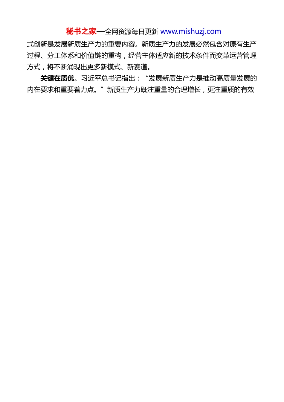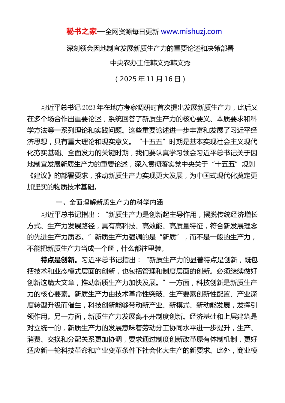 秘书之家—全网资源每日更新 www.mishuzj.com深刻领会因地制宜发展新质生产力的重要论述和决策部署中央农办主任韩文秀韩文秀(2025 年 11 月 16 日)习近平总书记 2023 年在地方考察调研时首次提出发展新质生产力,此后又在多个场合作出重要论述,系统回答了新质生产力的核心要义、本质要求和科学方法等一系列理论和实践问题。这些重要论述进一步丰富和发展了习近平经济思想,具有重大理论和现实意义。“十五五”时期是基本实现社会主义现代化夯实基础、全面发力的关键时期,我们要认真学习领会习近平总书记关于因地制宜发展新质生产力的重要论述,深入贯彻落实党中央关于“十五五”规划《建议》的部署要求,推动新质生产力实现更大发展,为中国式现代化奠定更加坚实的物质技术基础。一、全面理解新质生产力的科学内涵习近平总书记指出:“新质生产力是创新起主导作用,摆脱传统经济增长方式、生产力发展路径,具有高科技、高效能、高质量特征,符合新发展理念的先进生产力质态。”新质生产力强调的是“新质”,而不是一般的生产力,不能把新质生产力当成一个筐,什么都往里装。特点是创新。习近平总书记指出:“新质生产力的显著特点是创新,既包括技术和业态模式层面的创新,也包括管理和制度层面的创新。必须继续做好创新这篇大文章,推动新质生产力加快发展。”一方面,科技创新是新质生产力的核心要素。新质生产力由技术革命性突破、生产要素创新性配置、产业深度转型升级而催生,科技创新能够带动新产业、新模式、新动能发展,发挥引领作用。另一方面,新质生产力发展离不开制度创新。经济基础和上层建筑是对立统一的,新质生产力的发展意味着劳动分工协同水平进一步提升,生产、消费、交换和分配关系更加协调,要求通过制度创新改革原有体制机制,更好适应新一轮科技革命和产业变革条件下社会化大生产的新要求。此外,商业模秘书之家—全网资源每日更新 www.mishuzj.com式创新是发展新质生产力的重要内容。新质生产力的发展必然包含对原有生产过程、分工体系和价值链的重构,经营主体适应新的技术条件而变革运营管理方式,将不断涌现出更多新模式、新赛道。关键在质优。习近平总书记指出:“发展新质生产力是推动高质量发展的内在要求和重要着力点。”新质生产力既注重量的合理增长,更注重质的有效秘书之家—全网资源每日更新 www.mishuzj.com提升,关键在质优。一方面,新质生产力是“质态”而非“业态”。新质生产力强调的是社会生产函数的深刻改变和社会化大生产水平的提高,而不仅是某个或某些具体产业的发展,无论工业、农业、服务业都可以发展新质生产力。例如,无人机植保就是典型的农业新质生产力。另一方面,实现“质优”要求加快转变发展方式。生产力是质和量的辩证统一,提高生产力水平既要在“量”上扩大先进生产要素投入,更要在“质”上优化要素组合、提高要素投入产出效率。发展新质生产力,要加快转变发展方式,推动质量变革、效率变革、动力变革,推动经济发展从量变向质变跃升。此外,新质生产力以全要素生产率大幅提升为标志。全要素生产率反映资本、劳动等要素投入之外,由技术进步、管理优化等带来的产出增长。每一种要素本身的质量和能级提升,以及各要素资源的配置组合优化,都会有力带动全要素生产率大幅提升。本质是先进生产力。习近平总书记指出,新质生产力“以劳动者、劳动资料、劳动对象及其优化组合的跃升为基本内涵”,“本质是先进生产力”。新质生产力的“先进”表现为三个方面:一是更高素质的劳动者。劳动者的活劳动是创造价值的唯一源泉,复杂劳动创造的价值数倍于简单劳动。发展新质生产力,劳动者需要掌握更多的知识、技术、管理能力,劳动的复杂程度随之提高,从而创造出更多的价值。二是更高科技含量的劳动资料。劳动资料是劳动者与劳动对象之间的媒介,代表着生产力发展水平,用什么劳动资料从事生产是各时代的重要区别之一。马克思曾指出,机器替代手工劳动是工业革命的核心特征。当前人工智能等新技术在越来越多的领域替代和改造传统生产工具,这是人类社会迈向数智时代的重要标志。三是更广范围的劳动对象。劳动对...