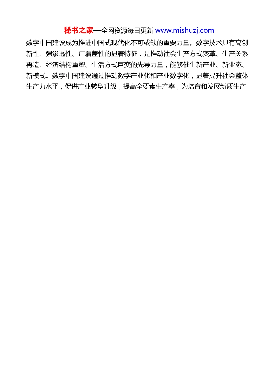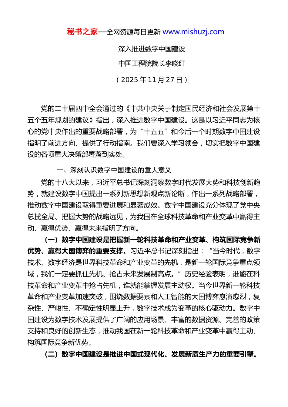 秘书之家—全网资源每日更新 www.mishuzj.com深入推进数字中国建设中国工程院院长李晓红(2025 年 11 月 27 日)党的二十届四中全会通过的《中共中央关于制定国民经济和社会发展第十五个五年规划的建议》指出,深入推进数字中国建设。这是以习近平同志为核心的党中央作出的重要战略部署,为“十五五”和今后一个时期数字中国建设指明了前进方向、提供了行动指南。我们要深入学习领会,切实把数字中国建设的各项重大决策部署落到实处。一、深刻认识数字中国建设的重大意义党的十八大以来,习近平总书记深刻洞察数字时代发展大势和科技创新趋势,就建设数字中国提出一系列新思想新观点新论断,作出一系列战略部署,推动数字中国建设取得重要进展和显著成效。数字中国建设充分体现了党中央总揽全局、把握大势的战略远见,为我国在全球科技革命和产业变革中赢得主动、赢得优势、赢得未来指明了方向。(一)数字中国建设是把握新一轮科技革命和产业变革、构筑国际竞争新优势、赢得大国博弈的重要支撑。习近平总书记深刻指出:“当今时代,数字技术、数字经济是世界科技革命和产业变革的先机,是新一轮国际竞争重点领域,我们一定要抓住先机、抢占未来发展制高点。”历史经验表明,谁能在科技革命和产业变革中抢占先机,谁就能掌握发展主动权。当今世界新一轮科技革命和产业变革加速突破,围绕数据要素和人工智能的大国博弈愈演愈烈,复杂性、严峻性、不确定性明显上升,数字技术成为变革的核心驱动力。数字中国建设为数字技术发展提供了广阔的应用场景、丰富的数据资源、完善的政策支持和良好的创新生态,推动我国在新一轮科技革命和产业变革中赢得主动、构筑国际竞争新优势。(二)数字中国建设是推进中国式现代化、发展新质生产力的重要引擎。秘书之家—全网资源每日更新 www.mishuzj.com数字中国建设成为推进中国式现代化不可或缺的重要力量。数字技术具有高创新性、强渗透性、广覆盖性的显著特征,是推动社会生产方式变革、生产关系再造、经济结构重塑、生活方式巨变的先导力量,能够催生新产业、新业态、新模式。数字中国建设通过推动数字产业化和产业数字化,显著提升社会整体生产力水平,促进产业转型升级,提高全要素生产率,为培育和发展新质生产秘书之家—全网资源每日更新 www.mishuzj.com力提供坚实支撑、注入强大动能,是推进中国式现代化、实现高质量发展的重要引擎。(三)数字中国建设是深化国际交流合作、推动构建人类命运共同体的必然选择。全球数字化、网络化、智能化快速发展既面临前所未有的机遇,也面临着数字鸿沟扩大、网络安全风险上升、规则体系不健全等突出挑战。我国拥有超大的规模优势、领先的技术设施和丰富的应用场景,在数字化发展过程中不断孕育创新的理念、技术和模式,为全球应对共同的数字化挑战提供中国方案、贡献中国智慧。建设数字中国,打造开放共赢的数字领域国际合作格局,彰显了中国主动顺应全球数字化浪潮、积极参与全球治理的大国担当。二、数字中国建设取得的重大成就和当前面临的主要挑战在以习近平同志为核心的党中央坚强领导下,我国牢牢把握数字化、网络化、智能化发展机遇,全面深化数据要素市场化配置改革,加快数字化绿色化协同转型发展,推动数字中国建设取得显著成就。(一)数字技术创新取得新突破。数字领域突破一批关键核心技术,“缺芯少魂”等突出问题逐步解决,人工智能综合实力实现整体性、系统性跃升。“东数西算”成为国家重大生产力布局的战略工程,算力和数据基础设施加快布局,在规模、技术等方面实现长足发展。(二)数字经济发展动能更加强劲。实体经济和数字技术融合程度显著加深,智能化转变、数字化改造加速推进,数据产业逐步壮大,全国一体化数据市场正在加快构建。数据基础制度不断完善,深入开展数据应用示范场景建设,数据要素的放大、叠加、倍增作用日益凸显。(三)数字公共服务更加可感可及。数字技术显著提升公共服务的可及性和公平普惠水平,教育、医疗、社保、养老等数字化水平不断提升。数字化打破了传统公共服务中的“流程壁垒”、“数据壁垒”,越来越多的事项实现“数据多跑路、群众少...