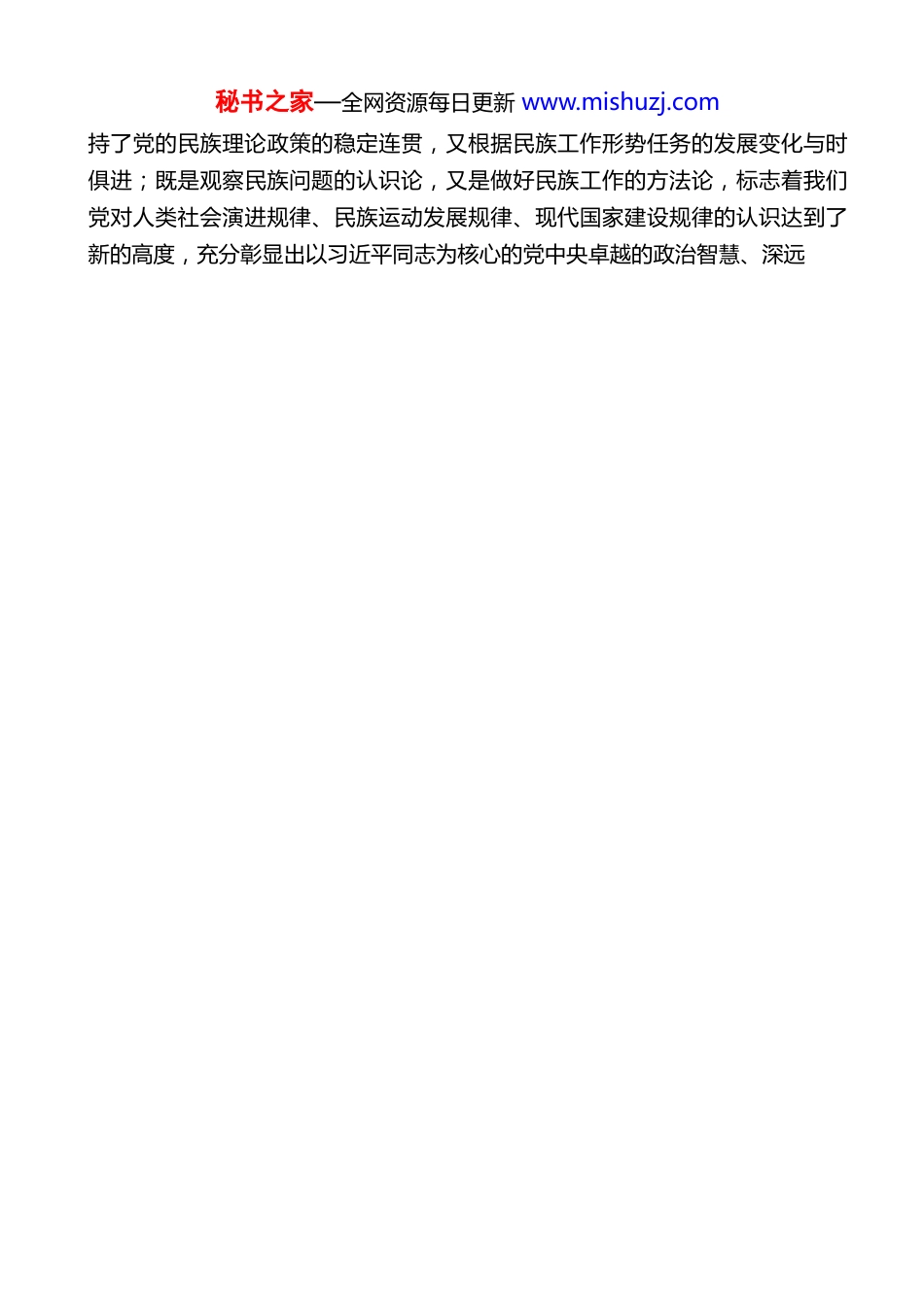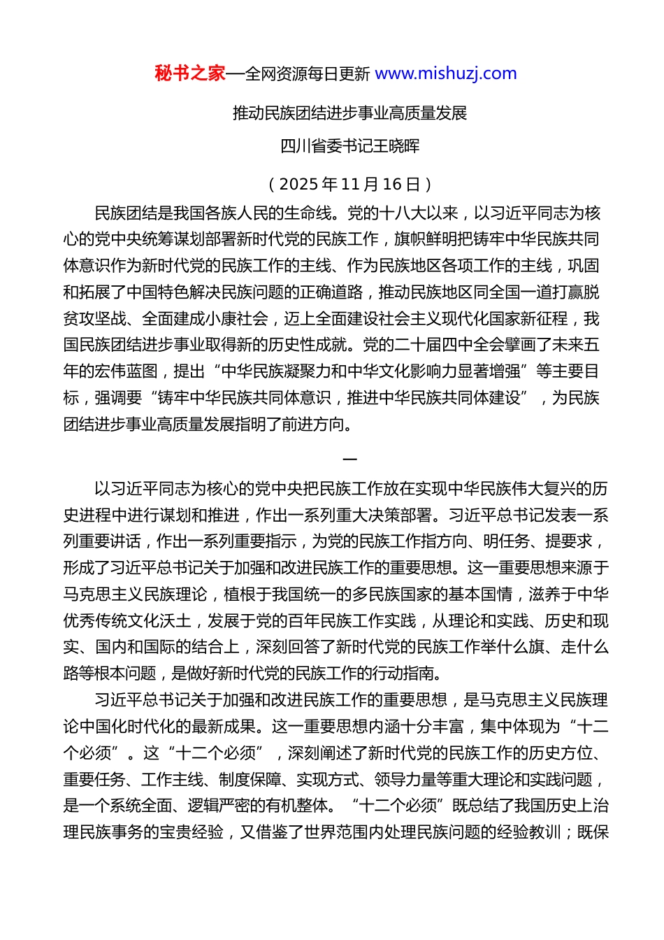 秘书之家—全网资源每日更新 www.mishuzj.com推动民族团结进步事业高质量发展四川省委书记王晓晖(2025 年 11 月 16 日)民族团结是我国各族人民的生命线。党的十八大以来,以习近平同志为核心的党中央统筹谋划部署新时代党的民族工作,旗帜鲜明把铸牢中华民族共同体意识作为新时代党的民族工作的主线、作为民族地区各项工作的主线,巩固和拓展了中国特色解决民族问题的正确道路,推动民族地区同全国一道打赢脱贫攻坚战、全面建成小康社会,迈上全面建设社会主义现代化国家新征程,我国民族团结进步事业取得新的历史性成就。党的二十届四中全会擘画了未来五年的宏伟蓝图,提出“中华民族凝聚力和中华文化影响力显著增强”等主要目标,强调要“铸牢中华民族共同体意识,推进中华民族共同体建设”,为民族团结进步事业高质量发展指明了前进方向。一以习近平同志为核心的党中央把民族工作放在实现中华民族伟大复兴的历史进程中进行谋划和推进,作出一系列重大决策部署。习近平总书记发表一系列重要讲话,作出一系列重要指示,为党的民族工作指方向、明任务、提要求,形成了习近平总书记关于加强和改进民族工作的重要思想。这一重要思想来源于马克思主义民族理论,植根于我国统一的多民族国家的基本国情,滋养于中华优秀传统文化沃土,发展于党的百年民族工作实践,从理论和实践、历史和现实、国内和国际的结合上,深刻回答了新时代党的民族工作举什么旗、走什么路等根本问题,是做好新时代党的民族工作的行动指南。习近平总书记关于加强和改进民族工作的重要思想,是马克思主义民族理论中国化时代化的最新成果。这一重要思想内涵十分丰富,集中体现为“十二个必须”。这“十二个必须”,深刻阐述了新时代党的民族工作的历史方位、重要任务、工作主线、制度保障、实现方式、领导力量等重大理论和实践问题,是一个系统全面、逻辑严密的有机整体。“十二个必须”既总结了我国历史上治理民族事务的宝贵经验,又借鉴了世界范围内处理民族问题的经验教训;既保秘书之家—全网资源每日更新 www.mishuzj.com持了党的民族理论政策的稳定连贯,又根据民族工作形势任务的发展变化与时俱进;既是观察民族问题的认识论,又是做好民族工作的方法论,标志着我们党对人类社会演进规律、民族运动发展规律、现代国家建设规律的认识达到了新的高度,充分彰显出以习近平同志为核心的党中央卓越的政治智慧、深远秘书之家—全网资源每日更新 www.mishuzj.com的战略考量、宏大的视野格局,必须深刻掌握其蕴含的马克思主义道理学理哲理和立场观点方法,在学深悟透、融会贯通上下功夫。铸牢中华民族共同体意识,是习近平总书记深刻把握中国历史文化和民族发展规律作出的重大原创性论断,也是习近平总书记关于加强和改进民族工作的重要思想的核心要义,是贯穿党的民族工作始终的政治主线和政治标准。总书记 2024 年 9 月在全国民族团结进步表彰大会上发表的重要讲话,从各民族血脉相融、信念相同、文化相通、经济相依、情感相亲 5 个方面,系统阐明了中华民族共同体的源与流、根与魂,深刻说明了中华民族共同体的形成和发展是人心所向、大势所趋、历史必然。铸牢中华民族共同体意识的提出和发展,历史性地回答了在中国这样一个统一的多民族国家,如何有效增强各民族凝聚力、如何有效解决国内民族问题、如何最大限度团结各族人民建设中国式现代化等时代命题,为我们在新征程上推进中华民族共同体建设指明了前进方向。习近平总书记关于加强和改进民族工作的重要思想,最鲜明的特质就是坚持问题导向、回答时代之问。总书记十分关注民族地区经济社会发展和人民生活改善,每到一处考察调研都精准把脉发展症结、深切体察群众冷暖,针对各民族地区和不同民族具体实际作出一系列重要指示要求。在谈到推动民族地区高质量发展时,强调“民族地区要完整准确全面贯彻新发展理念,不断深化改革开放,大力发展特色优势产业,因地制宜发展新质生产力”;在谈到维护民族团结时,强调“五十六个民族凝聚在一起就是中华民族共同体,中华民族是一个大家庭”;在谈到保护传承各民族优秀传统文化时,强调“各民族优秀传...