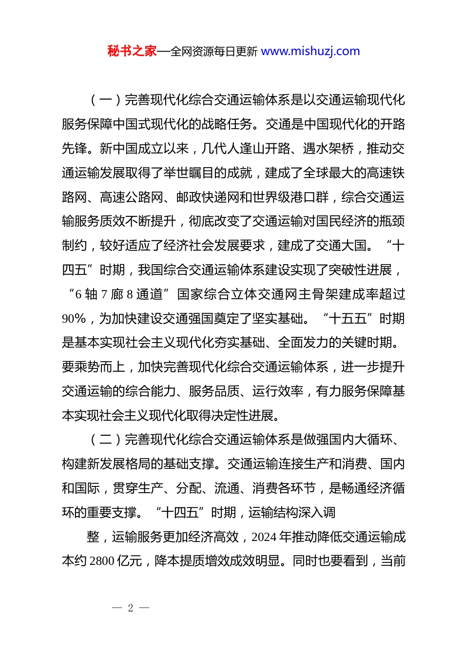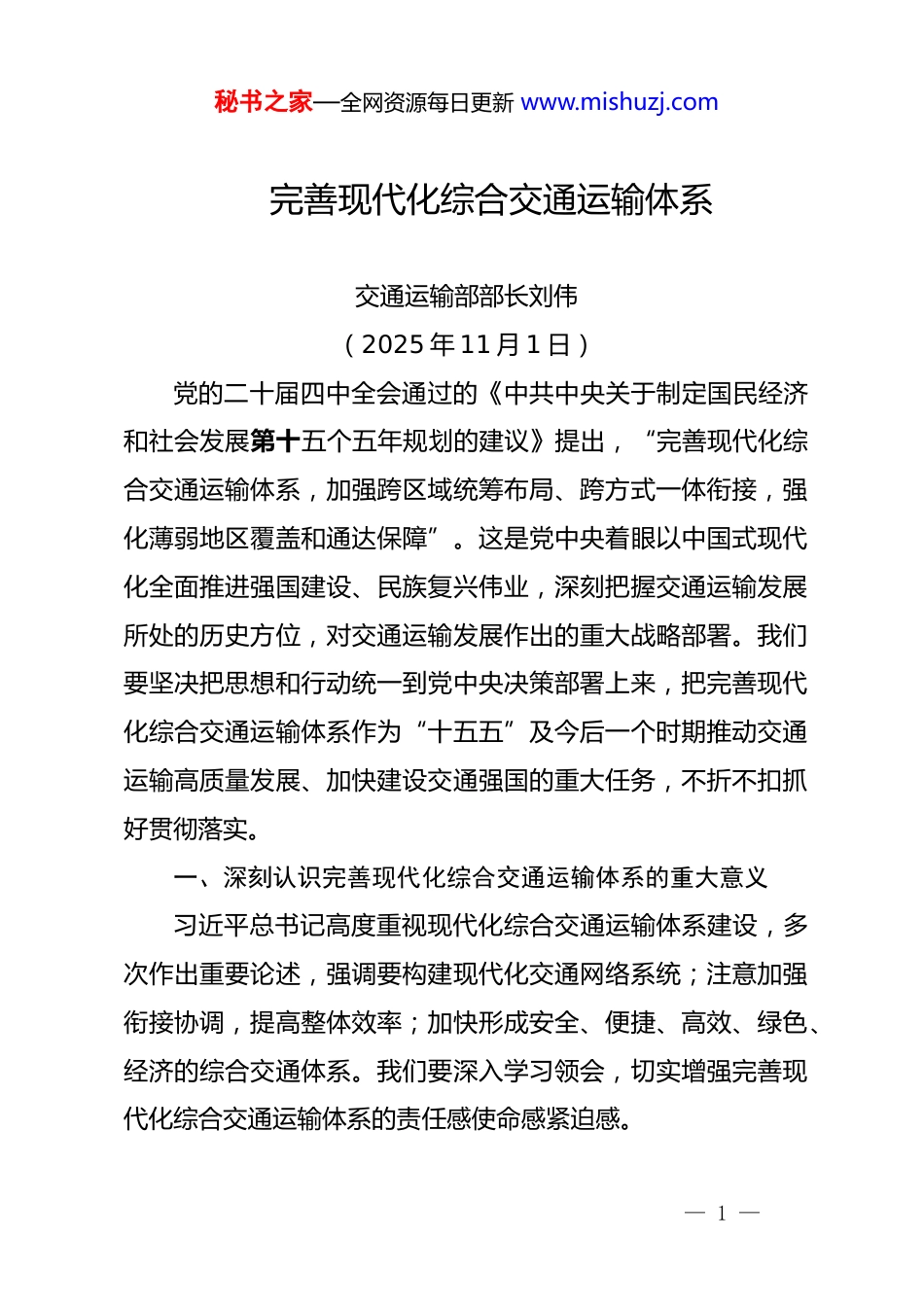 秘书之家—全网资源每日更新 www.mishuzj.com完善现代化综合交通运输体系交通运输部部长刘伟(2025 年 11 月 1 日)党的二十届四中全会通过的《中共中央关于制定国民经济和社会发展第十五个五年规划的建议》提出,“完善现代化综合交通运输体系,加强跨区域统筹布局、跨方式一体衔接,强化薄弱地区覆盖和通达保障”。这是党中央着眼以中国式现代化全面推进强国建设、民族复兴伟业,深刻把握交通运输发展所处的历史方位,对交通运输发展作出的重大战略部署。我们要坚决把思想和行动统一到党中央决策部署上来,把完善现代化综合交通运输体系作为“十五五”及今后一个时期推动交通运输高质量发展、加快建设交通强国的重大任务,不折不扣抓好贯彻落实。一、深刻认识完善现代化综合交通运输体系的重大意义习近平总书记高度重视现代化综合交通运输体系建设,多次作出重要论述,强调要构建现代化交通网络系统;注意加强衔接协调,提高整体效率;加快形成安全、便捷、高效、绿色、经济的综合交通体系。我们要深入学习领会,切实增强完善现代化综合交通运输体系的责任感使命感紧迫感。— 1 —秘书之家—全网资源每日更新 www.mishuzj.com(一)完善现代化综合交通运输体系是以交通运输现代化服务保障中国式现代化的战略任务。交通是中国现代化的开路先锋。新中国成立以来,几代人逢山开路、遇水架桥,推动交通运输发展取得了举世瞩目的成就,建成了全球最大的高速铁路网、高速公路网、邮政快递网和世界级港口群,综合交通运输服务质效不断提升,彻底改变了交通运输对国民经济的瓶颈制约,较好适应了经济社会发展要求,建成了交通大国。“十四五”时期,我国综合交通运输体系建设实现了突破性进展,“6 轴 7 廊 8 通道”国家综合立体交通网主骨架建成率超过90%,为加快建设交通强国奠定了坚实基础。“十五五”时期是基本实现社会主义现代化夯实基础、全面发力的关键时期。要乘势而上,加快完善现代化综合交通运输体系,进一步提升交通运输的综合能力、服务品质、运行效率,有力服务保障基本实现社会主义现代化取得决定性进展。(二)完善现代化综合交通运输体系是做强国内大循环、构建新发展格局的基础支撑。交通运输连接生产和消费、国内和国际,贯穿生产、分配、流通、消费各环节,是畅通经济循环的重要支撑。“十四五”时期,运输结构深入调整,运输服务更加经济高效,2024 年推动降低交通运输成本约 2800 亿元,降本提质增效成效明显。同时也要看到,当前— 2 —秘书之家—全网资源每日更新 www.mishuzj.com交通运输仍存在发展不平衡不充分问题,综合交通网络结构不尽合理,跨运输方式衔接不够顺畅,运输结构仍有优化调整空间,设施安全水平有待提升,统一开放的交通运输市场建设任重道远。要准确把握“十五五”时期我国发展环境面临的复杂深刻变化,统筹国内国际两个大局,完善现代化综合交通运输体系,进一步强化跨区域统筹布局、跨方式一体衔接,健全多元化、韧性强的国际运输通道体系,加快形成内外联通、安全高效的物流网络,更好服务做强国内大循环,畅通国内国际双循环。(三)完善现代化综合交通运输体系是培育发展新质生产力、推动高质量发展的重要举措。交通运输是技术集成应用型行业,具有巨大的市场规模和丰富的应用场景,是发展新质生产力的重点领域,也是加快建设科技强国的重要领域。近年来,我国交通基础设施建造技术能力大幅提升,智能网联汽车、大型邮轮、智能船舶、大型飞机等新型载运工具实现重大突破,智能高铁、智能道路、自动化码头等技术全球领先。“十五五”时期,全球新一轮科技革命和产业变革加速突破,能否抓住机遇培育发展新质生产力,对于加快建设交通强国至关重要。要完善现代化综合交通运输体系,加快推动人工智能在交通运输领域创新应用,着力突破关键核心技术,统筹推进教育科技— 3 —秘书之家—全网资源每日更新 www.mishuzj.com人才一体化发展,加快形成新动能、新优势,更好引领和推进交通运输现代化进程。(四)完善现代化综合交通运输体系是满足人民群众对美好生活向往、促进全体人民共同富裕的必然要求。交通运输关系国...