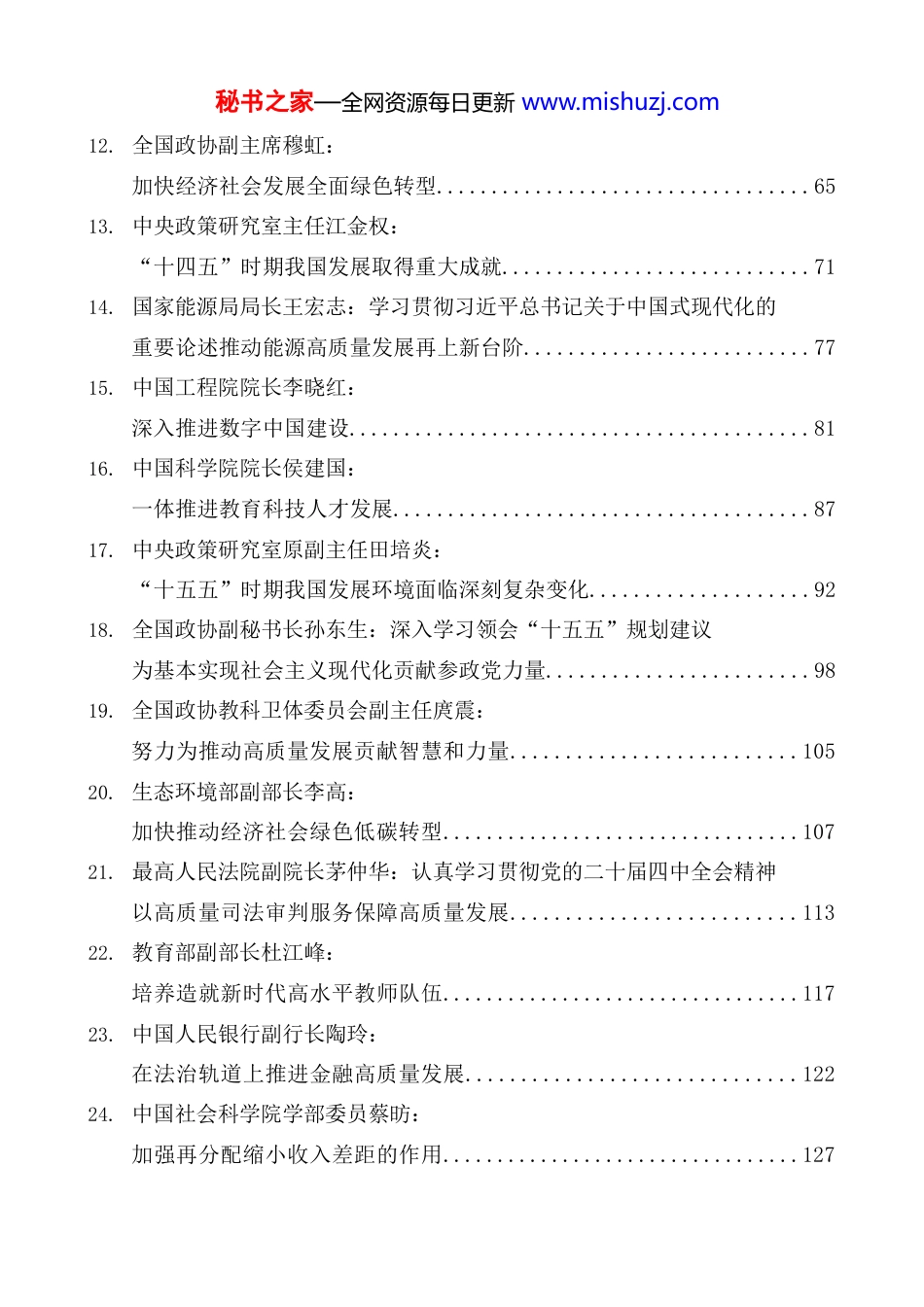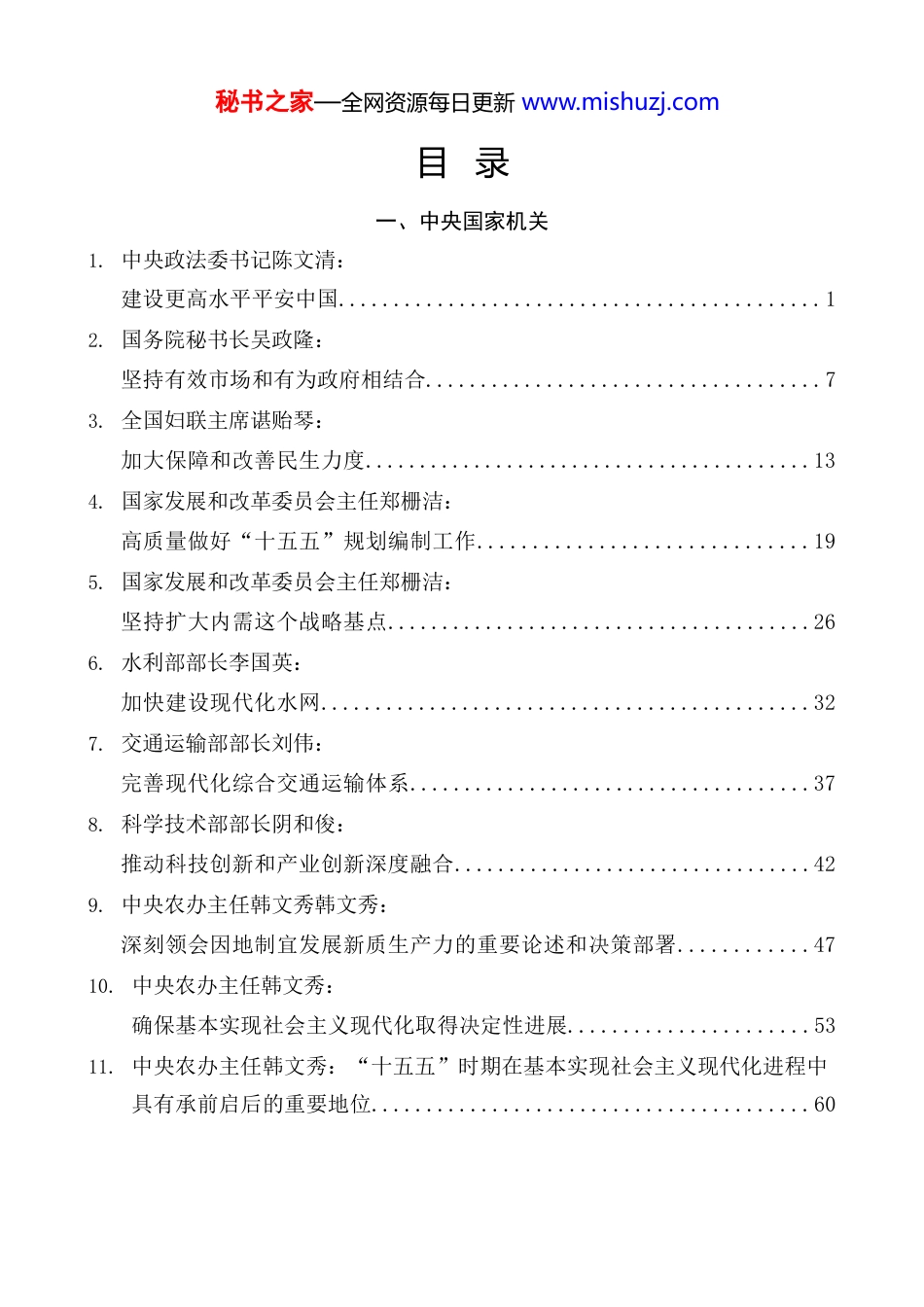 秘书之家—全网资源每日更新 www.mishuzj.com目 录一、中央国家机关1. 中央政法委书记陈文清: 建设更高水平平安中国............................................1 2. 国务院秘书长吴政隆: 坚持有效市场和有为政府相结合....................................7 3. 全国妇联主席谌贻琴: 加大保障和改善民生力度.........................................13 4. 国家发展和改革委员会主任郑栅洁: 高质量做好“十五五”规划编制工作..............................19 5. 国家发展和改革委员会主任郑栅洁: 坚持扩大内需这个战略基点.......................................26 6. 水利部部长李国英: 加快建设现代化水网.............................................32 7. 交通运输部部长刘伟: 完善现代化综合交通运输体系.....................................37 8. 科学技术部部长阴和俊: 推动科技创新和产业创新深度融合.................................42 9. 中央农办主任韩文秀韩文秀: 深刻领会因地制宜发展新质生产力的重要论述和决策部署............47 10. 中央农办主任韩文秀: 确保基本实现社会主义现代化取得决定性进展......................53 11. 中央农办主任韩文秀:“十五五”时期在基本实现社会主义现代化进程中具有承前启后的重要地位........................................60 秘书之家—全网资源每日更新 www.mishuzj.com12. 全国政协副主席穆虹: 加快经济社会发展全面绿色转型..................................65 13. 中央政策研究室主任江金权: “十四五”时期我国发展取得重大成就............................71 14. 国家能源局局长王宏志:学习贯彻习近平总书记关于中国式现代化的 重要论述推动能源高质量发展再上新台阶..........................77 15. 中国工程院院长李晓红: 深入推进数字中国建设..........................................81 16. 中国科学院院长侯建国: 一体推进教育科技人才发展......................................87 17. 中央政策研究室原副主任田培炎: “十五五”时期我国发展环境面临深刻复杂变化....................92 18. 全国政协副秘书长孙东生:深入学习领会“十五五”规划建议 为基本实现社会主义现代化贡献参政党力量........................98 19. 全国政协教科卫体委员会副主任庹震: 努力为推动高质量发展贡献智慧和力量..........................105 20. 生态环境部副部长李高: 加快推动经济社会绿色低碳转型.................................107 21. 最高人民法院副院长茅仲华:认真学习贯彻党的二十届四中全会精神 以高质量司法审判服务保障高质量发展..........................113 22. 教育部副部长杜江峰: 培养造就新时代高水平教师队伍.................................117 23. 中国人民银行副行长陶玲: 在法治轨道上推进金融高质量发展..............................122 24. 中国社会科学院学部委员蔡昉: 加强再分配缩小收入差距的作用.................................127 秘书之家—全网资源每日更新 www.mishuzj.com25. 中央党校副校长李毅: 以坚强党性推进自我革命.......................................131 26. 中央党校科研部副主任洪向华: 健全经常性发现和解决作风问题机制............................135 27. 中央党校社会和生态文明教研部副主任乔清举: 发展新时代中国特色社会主义文化..............................140 28. 中央党校习近平新时代中国特色社会主义思想研究中心研究员徐晓明: 发挥四大独特优势推进中国式现代化............................145 29.中央党校习近平新时代中国特色社会主义思想研究中心研究员叶响裙: 厘清急难愁盼更好为民解忧.....................................148 30. 中央党校习近平新时代中国特色社会主义思想研究中心研究员邵声: 坚持党的文化领导权扎实推进社会主义文化强国建设..............150 31. 国务...