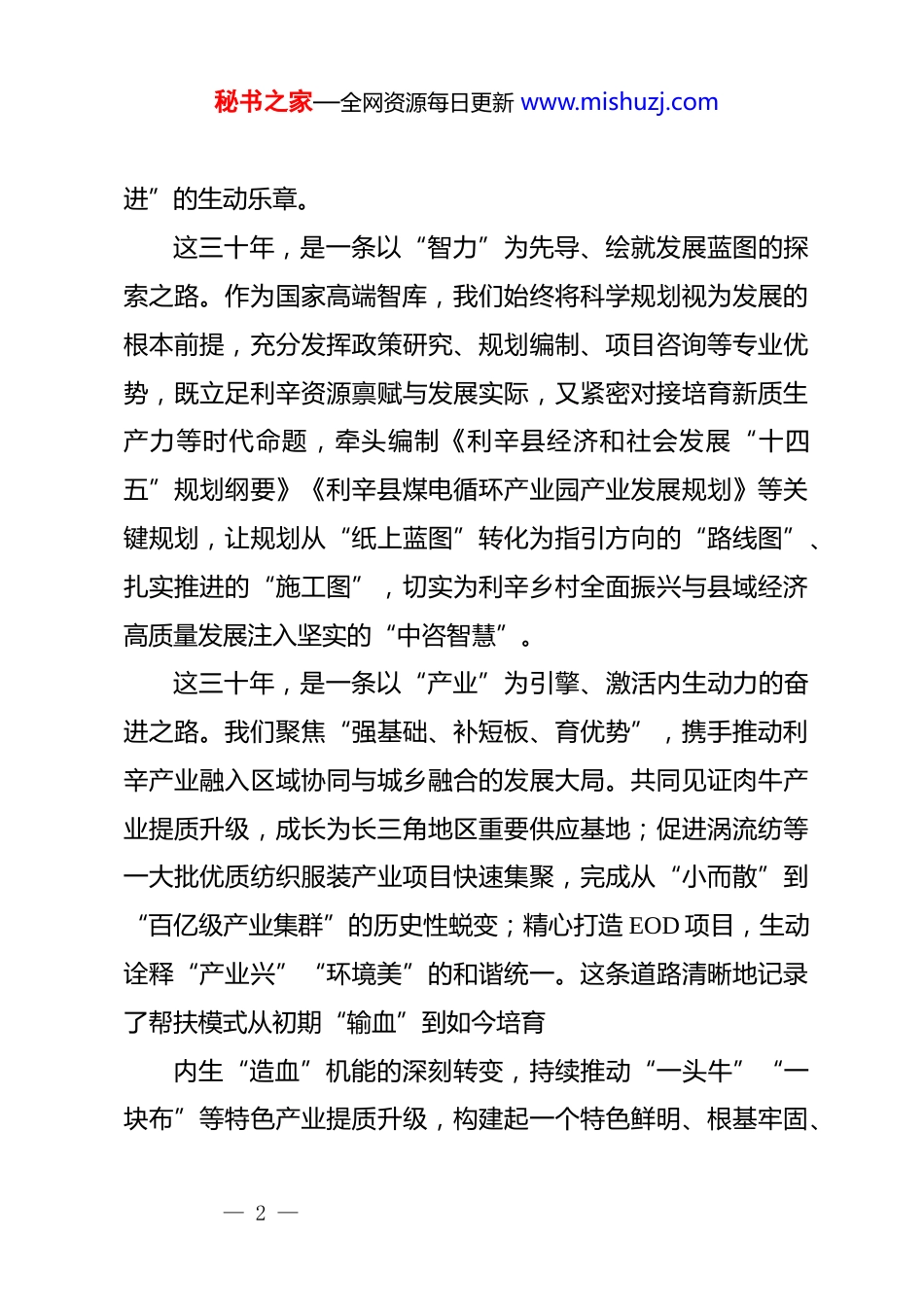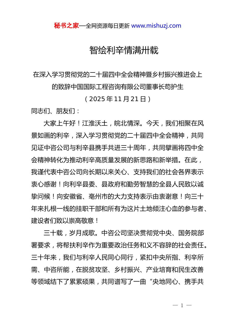 秘书之家—全网资源每日更新 www.mishuzj.com智绘利辛情满卅载在深入学习贯彻党的二十届四中全会精神暨乡村振兴推进会上的致辞中国国际工程咨询有限公司董事长苟护生(2025 年 11 月 21 日)同志们、朋友们:大家上午好!江淮沃土,皖北情深。今天,我们相聚在风景如画的利辛,深入学习贯彻党的二十届四中全会精神,共同见证中咨公司与利辛县携手共进三十周年,共同擘画将四中全会精神转化为推动利辛高质量发展的新思路和新举措。在此,我谨代表中咨公司向长期以来关心、支持我们的社会各界表示衷心感谢!向利辛县委、县政府和勤劳智慧的全县人民致以诚挚问候!向安徽省、亳州市的大力支持表示由衷谢意!向三十年来扎根一线的挂职干部和所有为这片土地倾注心血的参与者、建设者们致以崇高敬意!三十载,岁月成歌。中咨公司坚决贯彻党中央、国务院部署要求,将帮扶利辛作为重要政治任务和义不容辞的社会责任。三十年来,我们与利辛人民同心同行,紧扣中央所指、利辛所需、中咨所能,在脱贫攻坚、乡村振兴、产业培育和民生改善等领域结下了累累硕果,共同谱写了一曲“央地同心、携手共— 1 —秘书之家—全网资源每日更新 www.mishuzj.com进”的生动乐章。这三十年,是一条以“智力”为先导、绘就发展蓝图的探索之路。作为国家高端智库,我们始终将科学规划视为发展的根本前提,充分发挥政策研究、规划编制、项目咨询等专业优势,既立足利辛资源禀赋与发展实际,又紧密对接培育新质生产力等时代命题,牵头编制《利辛县经济和社会发展“十四五”规划纲要》《利辛县煤电循环产业园产业发展规划》等关键规划,让规划从“纸上蓝图”转化为指引方向的“路线图”、扎实推进的“施工图”,切实为利辛乡村全面振兴与县域经济高质量发展注入坚实的“中咨智慧”。这三十年,是一条以“产业”为引擎、激活内生动力的奋进之路。我们聚焦“强基础、补短板、育优势”,携手推动利辛产业融入区域协同与城乡融合的发展大局。共同见证肉牛产业提质升级,成长为长三角地区重要供应基地;促进涡流纺等一大批优质纺织服装产业项目快速集聚,完成从“小而散”到“百亿级产业集群”的历史性蜕变;精心打造 EOD 项目,生动诠释“产业兴”“环境美”的和谐统一。这条道路清晰地记录了帮扶模式从初期“输血”到如今培育内生“造血”机能的深刻转变,持续推动“一头牛”“一块布”等特色产业提质升级,构建起一个特色鲜明、根基牢固、— 2 —秘书之家—全网资源每日更新 www.mishuzj.com韧性强劲的现代产业体系,让利辛高质量发展的“底气”越来越足。这三十年,是一条以“人才”为基石、推动基层发展的赋能之路。开展定点帮扶以来,我们累计选派了 32 名政治素质好、业务能力强的挂职干部。他们始终保持“事事有回应、件件有着落”的工作作风,扎根基层、倾情投入,既是“政策宣传员”,也是“实践指导员”,更是“桥梁联络员”,与利辛干部群众同频共振、融为一体。同时,他们也在利辛这片广阔的舞台得到了宝贵的锻炼,综合能力在实践中得到全面提升,成为了中咨公司的骨干力量,在工作岗位上发挥了重要作用。这三十年,是一条以“民生”为根本、传递温暖关怀的暖心之路。我们始终坚持以人民为中心的发展理念,将“改善民生、增进福祉”作为帮扶工作的出发点和落脚点,聚焦教育、医疗、基础设施、人居环境等领域,持续实施推动危房改造、援建卫生院、捐赠医疗设备、开展助学活动等一系列暖心举措,每一项工作都瞄准群众“急难愁盼”,每一份付出都围绕群众“安危冷暖”,老乡们的笑声更加响亮、心里更加温暖,广大群众的获得感更实、幸福感更浓、安全感更强。在携手并进、砥砺前行的三十年,利辛实现了一个又一个振奋人心的历史性跨越。地区生产总值增长超过 20 倍,发展能— 3 —秘书之家—全网资源每日更新 www.mishuzj.com级持续跃升;人均 GDP 增长超过 40 倍,人民生活实现质的飞跃。这些成就的取得得益于党中央、国务院的坚强领导,得益于国务院国资委、农业农村部的持续关怀,得益于安徽省、亳州市在政策、项目、资金等方面给予的鼎力支持,得益于利辛各级干部队伍求真务实、...
