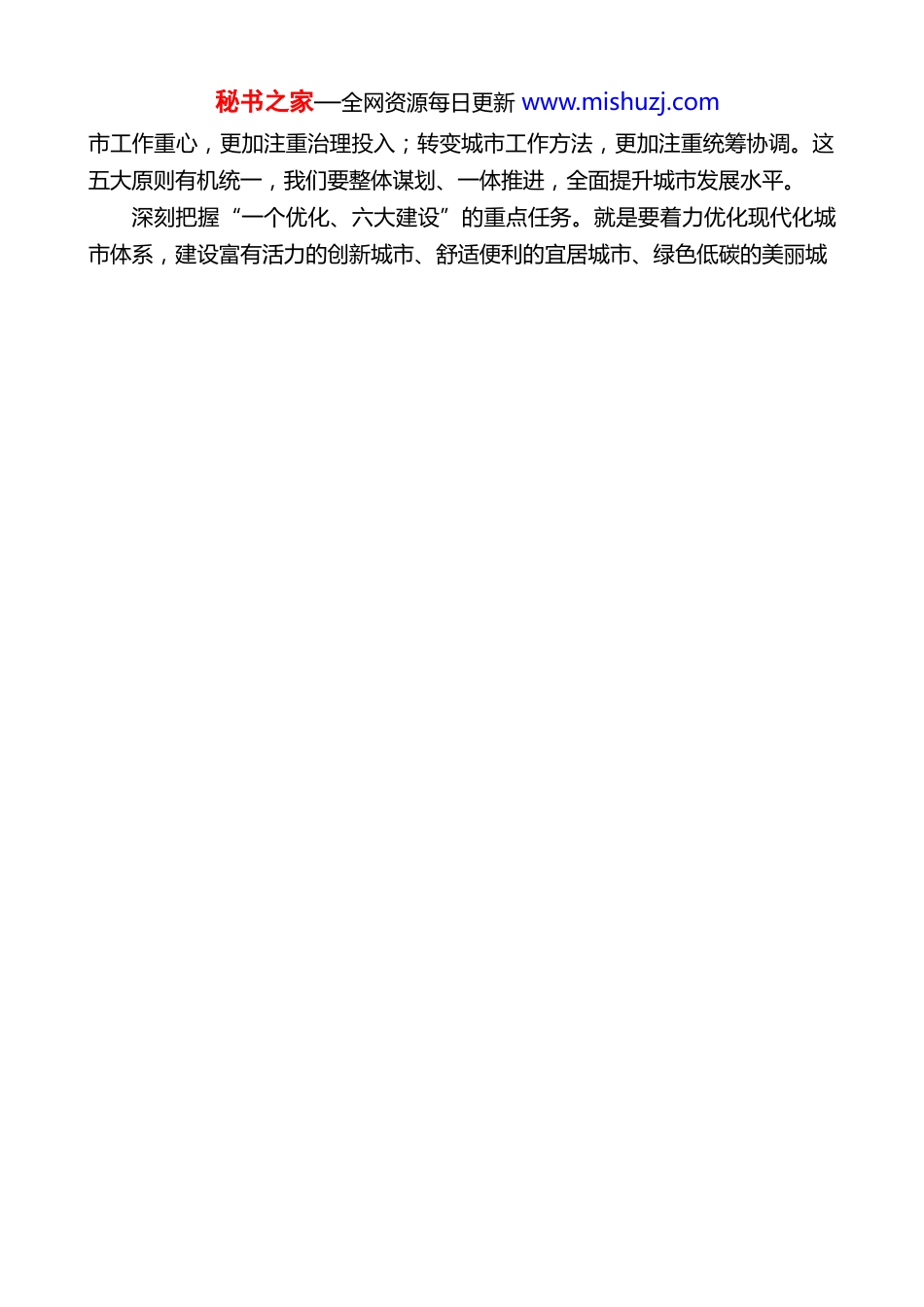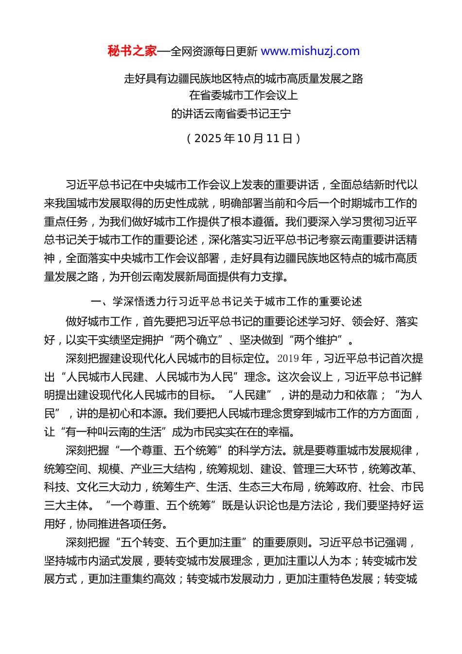 秘书之家—全网资源每日更新 www.mishuzj.com走好具有边疆民族地区特点的城市高质量发展之路在省委城市工作会议上的讲话云南省委书记王宁(2025 年 10 月 11 日)习近平总书记在中央城市工作会议上发表的重要讲话,全面总结新时代以来我国城市发展取得的历史性成就,明确部署当前和今后一个时期城市工作的重点任务,为我们做好城市工作提供了根本遵循。我们要深入学习贯彻习近平总书记关于城市工作的重要论述,深化落实习近平总书记考察云南重要讲话精神,全面落实中央城市工作会议部署,走好具有边疆民族地区特点的城市高质量发展之路,为开创云南发展新局面提供有力支撑。一、学深悟透力行习近平总书记关于城市工作的重要论述做好城市工作,首先要把习近平总书记的重要论述学习好、领会好、落实好,以实干实绩坚定拥护“两个确立”、坚决做到“两个维护”。深刻把握建设现代化人民城市的目标定位。2019 年,习近平总书记首次提出“人民城市人民建、人民城市为人民”理念。这次会议上,习近平总书记鲜明提出建设现代化人民城市的目标。“人民建”,讲的是动力和依靠;“为人民”,讲的是初心和本源。我们要把人民城市理念贯穿到城市工作的方方面面,让“有一种叫云南的生活”成为市民实实在在的幸福。深刻把握“一个尊重、五个统筹”的科学方法。就是要尊重城市发展规律,统筹空间、规模、产业三大结构,统筹规划、建设、管理三大环节,统筹改革、科技、文化三大动力,统筹生产、生活、生态三大布局,统筹政府、社会、市民三大主体。“一个尊重、五个统筹”既是认识论也是方法论,我们要坚持好 运用好,协同推进各项任务。深刻把握“五个转变、五个更加注重”的重要原则。习近平总书记强调,坚持城市内涵式发展,要转变城市发展理念,更加注重以人为本;转变城市发展方式,更加注重集约高效;转变城市发展动力,更加注重特色发展;转变城秘书之家—全网资源每日更新 www.mishuzj.com市工作重心,更加注重治理投入;转变城市工作方法,更加注重统筹协调。这五大原则有机统一,我们要整体谋划、一体推进,全面提升城市发展水平。深刻把握“一个优化、六大建设”的重点任务。就是要着力优化现代化城市体系,建设富有活力的创新城市、舒适便利的宜居城市、绿色低碳的美丽城秘书之家—全网资源每日更新 www.mishuzj.com市、安全可靠的韧性城市、崇德向善的文明城市、便捷高效的智慧城市。我们要全面对标对表,结合实际抓落实、抓转化。二、准确把握我省城市发展情况及优势所在2021 年以来,全省上下深入学习贯彻习近平总书记关于城市工作的重要论述和考察云南重要讲话精神,采取一系列措施,推动城市发展取得明显成效。一是城镇化进程稳步推进。城镇化率从 2020 年的 50.05%提高到 2024 年的54.11%, 年均增长 1.02 个百分点,昆明都市圈被列为全国 27 个都市圈之一。二是城市综合承载能力不断增强。新增城市建成区 75 平方公里,建成城市道路超过 1 万公里, 新建改造地下管网 2.7 万公里,“两污”处理率超 98%。三是城市公共服务体系更加健全。累计建设保障性住房近 110 万套,改造老旧小区 1.5 万多个、惠及 450 多万人,新增社区服务设施 1785 个、文体活动场地 160 多万平方米。四是城市管理水平明显提升。出台《云南省物业管理规定》等法规制度,建成联通 16 个州(市)的数字城管平台,新创建 7 个全国文明城市,新增 2 座国家历史文化名城。五是城市人居环境显著改善。城市空气质量优良天气比例保持在 98%以上,建成40 个绿美城市、400 个绿美社区,129 个县(市、区)全部达到国家卫生县城标准,城乡环境越来越美,各族群众生活越来越好。但也要看到,我省城镇化率较低、发展不平衡,城市基础设施、公共服务和治理能力还有不小差距,产业支撑不强,城市发展新动能培育不足,我们要切实采取措施,加快补齐短板。同时,更要看到我省城市发展的优势。一是生态宜居的独特优势。云南生态好、气候好、空气好,负氧离子含量高,到处蓝天白云、青山绿水,每个城市各具特色,一打造就很美、一装点就很靓。这样的条件全国绝无仅有,...