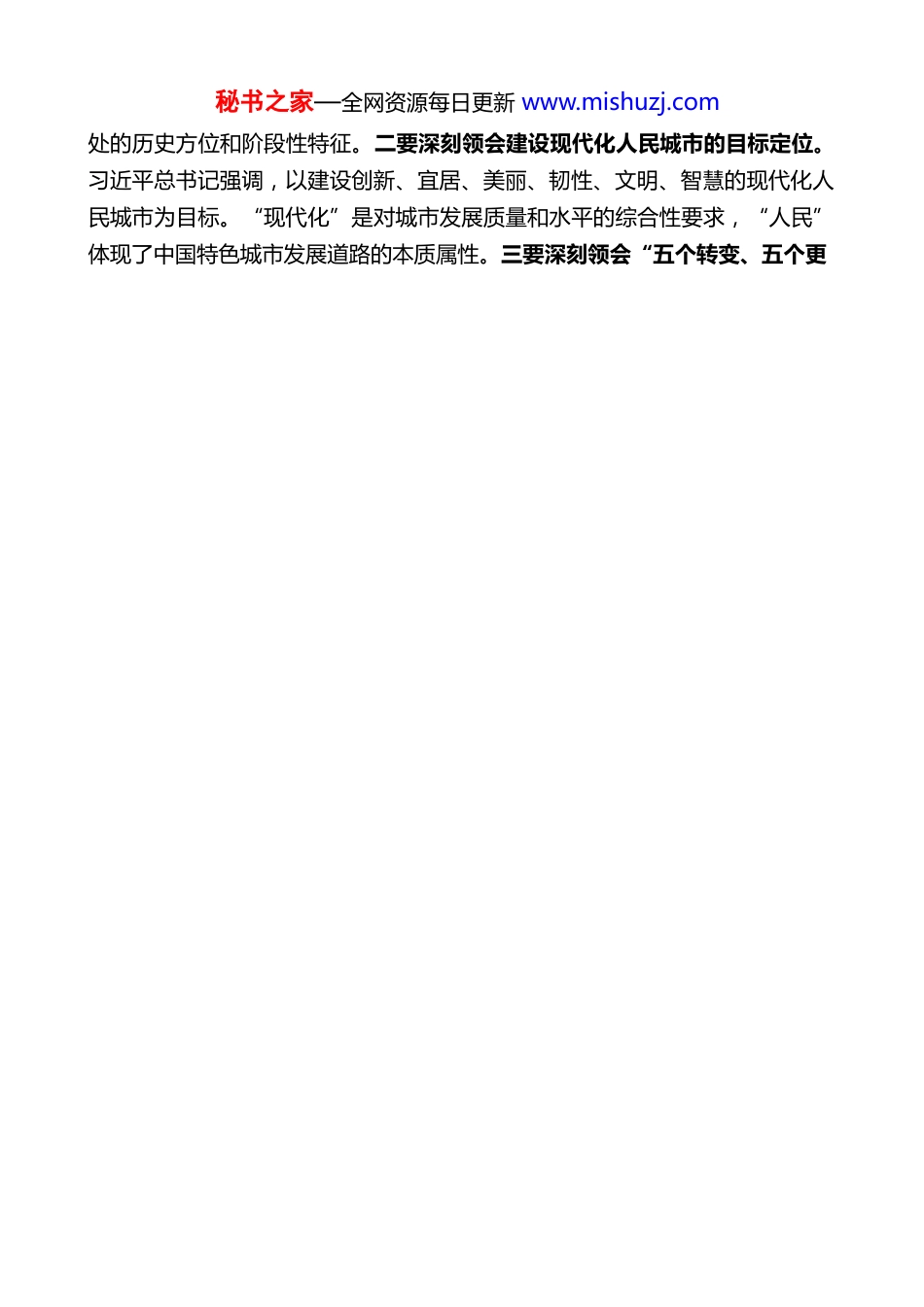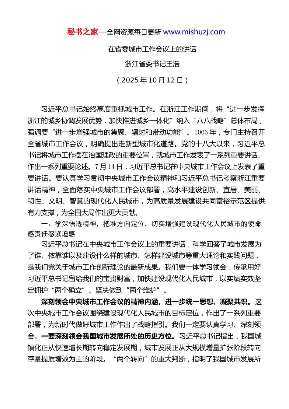 秘书之家—全网资源每日更新 www.mishuzj.com在省委城市工作会议上的讲话浙江省委书记王浩(2025 年 10 月 12 日)习近平总书记始终高度重视城市工作。在浙江工作期间,将“进一步发挥浙江的城乡协调发展优势,加快推进城乡一体化”纳入“八八战略”总体布局,强调要“进一步增强城市的集聚、辐射和带动功能”。2006 年,专门主持召开全省城市工作会议,明确提出走新型城市化道路。党的十八大以来,习近平总书记将城市工作摆在治国理政的重要位置,就城市工作发表了一系列重要讲话、作出一系列重要论述。7 月 14 日,习近平总书记在中央城市工作会议上发表了重要讲话。要认真学习贯彻中央城市工作会议精神和习近平总书记考察浙江重要讲话精神,全面落实中央城市工作会议部署,高水平建设创新、宜居、美丽、韧性、文明、智慧的现代化人民城市,为高质量发展建设共同富裕示范区提供有力支撑,为全国大局作出更大贡献。一、学深悟透精神,把准方向定位,切实增强建设现代化人民城市的使命感责任感紧迫感习近平总书记在中央城市工作会议上的重要讲话,科学回答了城市发展为了谁、依靠谁以及建设什么样的城市、怎样建设城市等重大理论和实践问题,是我们党关于城市工作创新理论的最新成果。我们要一体学习领会,传承用好习近平总书记留给我们的宝贵财富,加快建设现代化人民城市,以实绩实效坚定拥护“两个确立”、坚决做到“两个维护”。深刻领会中央城市工作会议的精神内涵,进一步统一思想、凝聚共识。这次中央城市工作会议围绕建设现代化人民城市的目标定位,作出了一系列重要部署,为新时代做好城市工作作出了战略指引。我们一定要认真学习、深刻领会。一要深刻领会我国城市发展所处的历史方位。习近平总书记指出,我国城镇化正从快速增长期转向稳定发展期,城市发展正从大规模增量扩张阶段转向存量提质增效为主的阶段。“两个转向”的重大判断,指明了我国城市发展所秘书之家—全网资源每日更新 www.mishuzj.com处的历史方位和阶段性特征。二要深刻领会建设现代化人民城市的目标定位。习近平总书记强调,以建设创新、宜居、美丽、韧性、文明、智慧的现代化人民城市为目标。“现代化”是对城市发展质量和水平的综合性要求,“人民”体现了中国特色城市发展道路的本质属性。三要深刻领会“五个转变、五个更秘书之家—全网资源每日更新 www.mishuzj.com加”的重要原则。习近平总书记强调,要转变城市发展理念,更加注重以人为本;转变城市发展方式,更加注重集约高效;转变城市发展动力,更加注重特色发展;转变城市工作重心,更加注重治理投入;转变城市工作方法,更加注重统筹协调。这五大原则是一个有机整体,是我们党对城市工作规律性认识的深化,为建设现代化人民城市提供了科学方法指引。四要深刻领会“七个着力” 的重点任务。习近平总书记指出,要着力优化现代化城市体系,着力建设富有活力的创新城市,着力建设舒适便利的宜居城市,着力建设绿色低碳的美丽城市,着力建设安全可靠的韧性城市,着力建设崇德向善的文明城市,着力建设便捷高效的智慧城市。这“七个着力”明确了城市高质量发展的主攻方向。新征程上,我们一定要学深悟透、全面贯彻,坚决做到“总书记有号令、党中央有部署,浙江见行动见实效”。深刻认识我省城市发展取得的显著成就,进一步坚定信心、乘势而上。这些年来,省委、省政府始终牢记嘱托、感恩奋进,坚持一张蓝图绘到底、一任接着一任干,推动我省城市发展取得了显著成就。一是城市综合能级显著跃升。2015 年以来,11 个设区市经济总量全国城市排名全部晋位。二是城市宜居宜业水平显著提高。城镇人均住房面积基本达到发达国家平均水平。国家园林城市、园林县城、园林城镇数量居全国前列,城市公园数量居全国第 2。城市天更蓝、水更清、人居环境更美丽。三是城市治理能力显著增强。2024 年群众安全感满意度达 98.84%、居全国前 3 位。全国文明城市 11 个设区市实现“满堂红”。四是城乡融合发展水平显著提升。城市基础设施、公共服务加快向农村延伸覆盖, 率先基本实现“城乡同质饮水”,基本养老保险等基本实现城乡同标。2024...