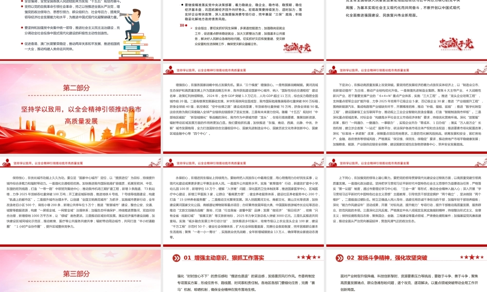 汇报人:某某某时间: 2025学习贯彻党的二十届四中全会精神,接续推进中国式现代化我市实践前言 党的二十届四中全会是在向第二个百年奋斗目标进军新征程上举行的一次十分重要的会议。习近平总书记对我省提出“奋力谱写中国式现代化新篇章”奋斗目标,为我省发展指明了前进方向、提供了根本遵循。我们深刻领悟“两个确立”的决定性意义,坚决做到“两个维护”,把深入学习贯彻党的二十届四中全会精神作为重大政治任务,与深入贯彻习近平总书记在我省考察时重要讲话精神紧密结合,牢记嘱托、踔厉奋发,推动“十四五”顺利收官、“十五五”开创新局,奋力推进中国式现代化我市实践。更多精品 PPT 模板: www.900ppt.com目录 CONTENTS深化思想认识,准确把握全会精神实质1坚持学以致用,以全会精神引领推动我市高质量发展2222狠抓工作落实,推动全会精神在我市落地见效3准确把握全会精神实质第一部分 01 参加人员出席这次全会的有,中央委员 168 人,候补中央委员 147 人。中央纪律检查委员会常务委员会委员和有关方面负责同志列席会议。党的二十大代表中部分基层同志和专家学者也列席了会议。02 会议内容 全会由中央政治局主持。中央委员会总书记习近平作了重要讲话。 全会听取和讨论了习近平受中央政治局委托所作的工作报告。 审议通过了《中共中央关于制定国民经济和社会发展第十五个五年规划的建议》。 习近平就《建议(讨论稿)》向全会作了说明。03 “ 十四五”时期重大成就 “ 十四五”时期我国发展历程极不寻常、极不平凡。 面对错综复杂的国际形势和艰巨繁重的国内改革发展稳定任务,以习近平同志为核心的党中央团结带领全党全国各族人民,迎难而上、砥砺前行,经受住世纪疫情严重冲击,有效应对一系列重大风险挑战,推动党和国家事业取得新的重大成就。 我国经济实力、科技实力、综合国力跃上新台阶,中国式现代化迈出新的坚实步伐,第二个百年奋斗目标新征程实现良好开局。全会高度评价“十四五”时期我国发展取得的重大成就。04 “ 十五五”时期经济社会发展原则 坚持党的全面领导, 坚持人民至上, 坚持高质量发展, 坚持全面深化改革, 坚持有效市场和有为政府相结合, 坚持统筹发展和安全。六个坚持05 “ 十五五”时期经济社会发展主要目标 高质量发展取得显著成效 科技自立自强水平大幅提高 进一步全面深化改革取得新突破 社会文明程度明显提升 人民生活品质不断提高 美丽中国建设取得新的重大进展 国家安全屏障更加巩固在此基础上再奋斗五年,到二〇三五年实现我国经济实力、科技实力、国防实力、综合国力和国际影响力大幅跃升,人均国内生产总值达到中等发达国家水平,人民生活更加幸福美好,基本实现社会主义现代化。06 工作要求 建设现代化产业体系,巩固壮大实体经济根基。 加快高水平科技自立自强,引领发展新质生产力。 建设强大国内市场,加快构建新发展格局。 加快构建高水平社会主义市场经济体制,增强高质量发展动力。 扩大高水平对外开放,开创合作共赢新局面。 加快农业农村现代化,扎实推进乡村全面振兴。 优化区域经济布局,促进区域协调发展。 激发全民族文化创新创造活力,繁荣发展社会主义文化。 加大保障和改善民生力度,扎实推进全体人民共同富裕。 加快经济社会发展全面绿色转型,建设美丽中国。 推进国家安全体系和能力现代化,建设更高水平平安中国。 如期实现建军一百年奋斗目标,高质量推进国防和军队现代化。07 推进祖国统一大业 全会强调,全党全国各族人民团结起来为实现“十五五”规划而奋斗。 坚持以党的自我革命引领社会革命,持之以恒推进全面从严治党,增强党的政治领导力、思想引领力、群众组织力、社会号召力,提高党领导经济社会发展能力和水平,为推进中国式现代化凝聚磅礴力量。 要坚持和加强党中央集中统一领导,推进社会主义民主法治建设,充分调动全社会投身中国式现代化建设的积极性主动性创造性。 促进香港、澳门长期繁荣稳定,推动两岸关系和平发展、推进祖国统一大业,推动构建人...
