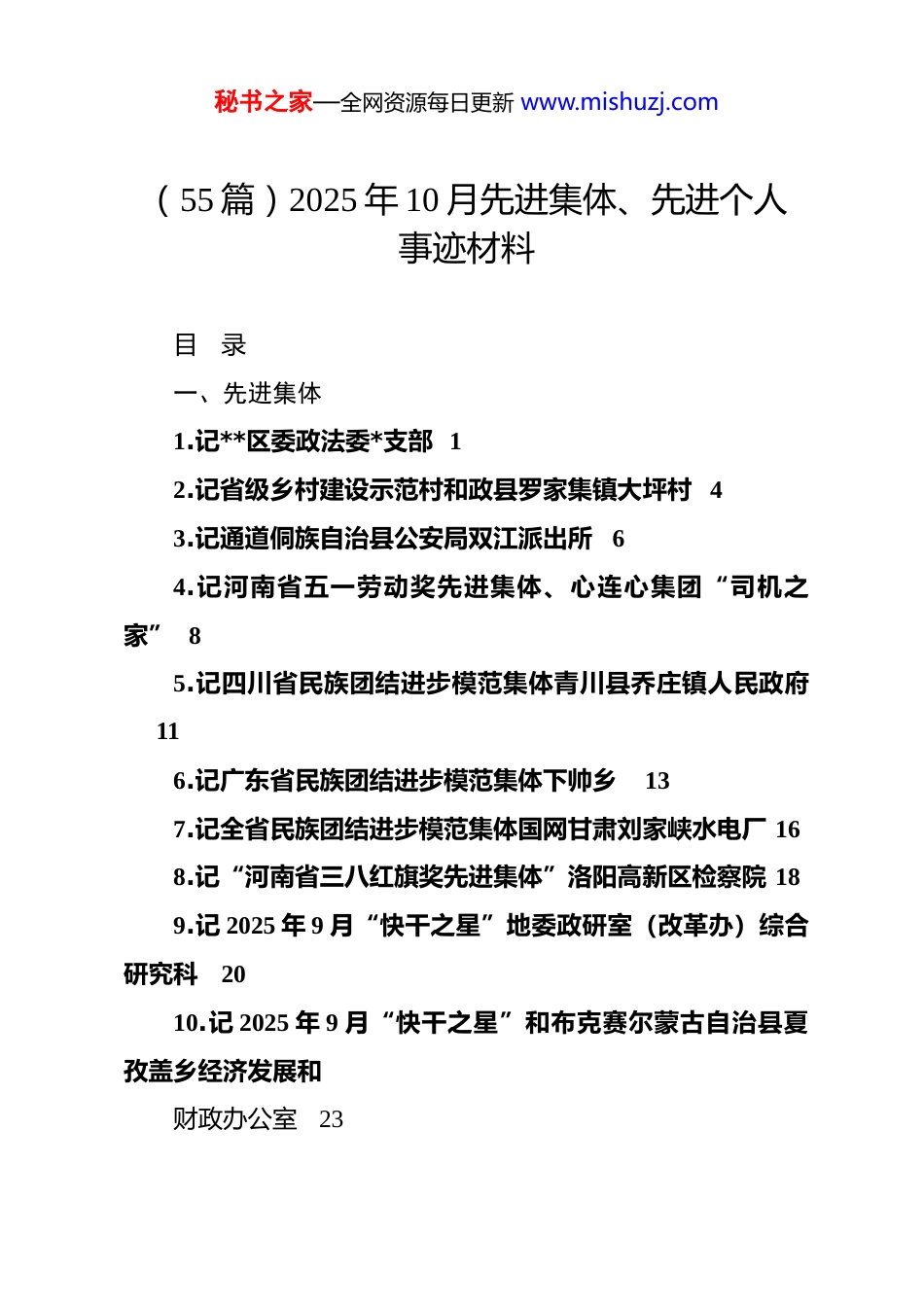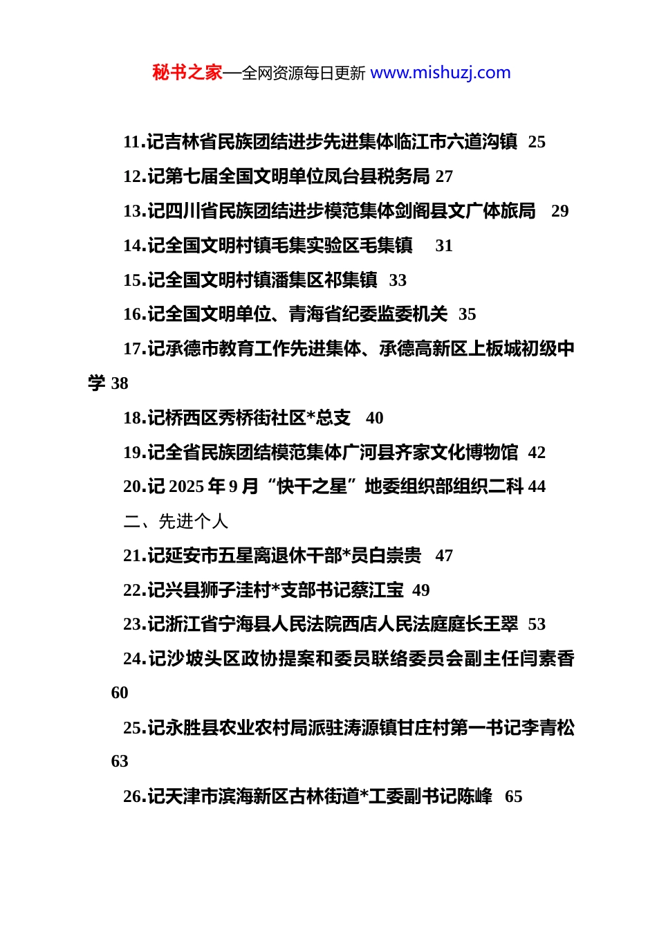 秘书之家—全网资源每日更新 www.mishuzj.com(55 篇)2025 年 10 月先进集体、先进个人事迹材料目录一、先进集体1.记**区委政法委*支部 12.记省级乡村建设示范村和政县罗家集镇大坪村 43.记通道侗族自治县公安局双江派出所 64.记河南省五一劳动奖先进集体、心连心集团“司机之家” 85.记四川省民族团结进步模范集体青川县乔庄镇人民政府116.记广东省民族团结进步模范集体下帅乡137.记全省民族团结进步模范集体国网甘肃刘家峡水电厂 168.记“河南省三八红旗奖先进集体”洛阳高新区检察院 189.记 2025 年 9 月“快干之星”地委政研室(改革办)综合研究科2010.记 2025 年 9 月“快干之星”和布克赛尔蒙古自治县夏孜盖乡经济发展和财政办公室23秘书之家—全网资源每日更新 www.mishuzj.com11.记吉林省民族团结进步先进集体临江市六道沟镇 2512.记第七届全国文明单位凤台县税务局 2713.记四川省民族团结进步模范集体剑阁县文广体旅局2914.记全国文明村镇毛集实验区毛集镇3115.记全国文明村镇潘集区祁集镇 3316.记全国文明单位、青海省纪委监委机关 3517.记承德市教育工作先进集体、承德高新区上板城初级中学 3818.记桥西区秀桥街社区*总支4019.记全省民族团结模范集体广河县齐家文化博物馆 4220.记 2025 年 9 月“快干之星”地委组织部组织二科 44二、先进个人21.记延安市五星离退休干部*员白崇贵 4722.记兴县狮子洼村*支部书记蔡江宝 4923.记浙江省宁海县人民法院西店人民法庭庭长王翠 5324.记沙坡头区政协提案和委员联络委员会副主任闫素香6025.记永胜县农业农村局派驻涛源镇甘庄村第一书记李青松6326.记天津市滨海新区古林街道*工委副书记陈峰 65秘书之家—全网资源每日更新 www.mishuzj.com27.记贵州省六盘水市水城区纪委副书记、监委副主任赵江6828.记河南省焦作市政协委员林云 7229.记中央和国家机关“四好”*员胡立朋7530.记湘潭县排头乡南下村*总支书记、村主任符以亮7831.记 2025 年定西市高质量发展先进个人高赟 8132.记全省民族团结进步模范、高台县非物质文化遗产保护中心主任杨健…8333.记广东省民族团结进步模范个人李斐 8534.记贵州省劳动模范谢兴祥8935.记六安市叶集区孙岗乡棠店村*支部副书记胡晓峰9136.记 2025 年沈阳工匠、五彩阳光城养老服务中心护理主管慕金歧9337.记自治区第九次民族团结进步模范个人海凯夫 9538.记拉萨市堆龙德庆区政协*组书记、主席洛桑强巴9739.记昆明市政协委员邓晓华9940.记全国交通运输系统先进工作者、衢州公路港航与运输管理中心程敏…10241.记吉林省民族团结进步先进个人徐勇 10542.记四川省民族团结进步模范个人虎从丽 107秘书之家—全网资源每日更新 www.mishuzj.com43.记路南区惠民道街道景荣社区*总支书记兼居委会主任王金玲11044.记江苏省徐州市云龙区政协委员盛广勇 11245.记皖能合肥发电有限公司总经理洪军 11546.记中央和国家机关“四好”*员刘东升11747.记吴忠市政协委员、联通公司吴忠市分公司总经理孙永辉 12048.苏省无锡市江阴市政协常委沈鸣华12349.记韶关平安建设先进个人饶娟兰12650.记全国“敬老爱老助老模范人物”周慧娟12951.记贵州省六盘水市、钟山区青林乡两级人大代表吴兴13252.记延安市五星离退休干部*员赵生波 13453.记彭水县社会治安综合治理中心主任周茜13654.记中央和国家机关“四好”*员马红军13955.记贵州省民族团结进步模范个人张福丽 142dj 铸魂政法蓝护航北疆筑平安记**区委政法委*支部(2025 年 10 月 28 日)在祖国北疆的平安版图上,**区写下了亮眼答卷——现发秘书之家—全网资源每日更新 www.mishuzj.com命案连续 17 年全破,连续 59 个月保持“零命案”成果。成绩背后,是**区委政法委*支部以 dj 引领政法工作高质量发展的坚实步履。近年来,该*支部深入贯彻落实新时代*的建设总要求,推动 dj 与业务深度融合、同频共振,开创了**区政法工作新局面。日前,该*支部被选树为自治区坚强堡垒“模范”支部。举旗定向筑牢政法姓*生命线“刀把子”必须牢牢掌握在*和人民手中。**区委政法委*支部始终把政治建设摆在首位,确保政法...