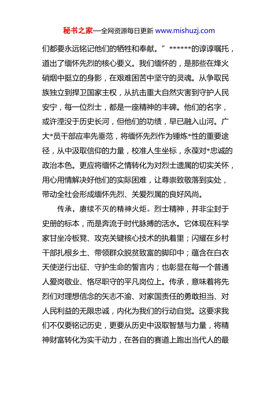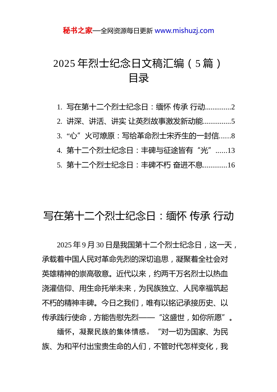 秘书之家—全网资源每日更新 www.mishuzj.com2025 年烈士纪念日文稿汇编(5 篇)目录1. 写在第十二个烈士纪念日:缅怀 传承 行动..............22. 讲深、讲活、讲实 让英烈故事激发新动能...............53. “心”火可燎原:写给革命烈士宋乔生的一封信......84. 第十二个烈士纪念日:丰碑与征途皆有“光”......135. 第十二个烈士纪念日:丰碑不朽 奋进不息.............16写在第十二个烈士纪念日:缅怀 传承 行动2025 年 9 月 30 日是我国第十二个烈士纪念日,这一天,承载着中国人民对革命先烈的深切追思,凝聚着全社会对英雄精神的崇高敬意。近代以来,约两千万名烈士以热血浇灌信仰、用生命托举未来,为民族独立、人民幸福筑起不朽的精神丰碑。今日之我们,唯有以铭记承接历史、以传承践行使命,方能告慰先烈——“这盛世,如你所愿”。缅怀,凝聚民族的集体情感。“对一切为国家、为民族、为和平付出宝贵生命的人们,不管时代怎样变化,我秘书之家—全网资源每日更新 www.mishuzj.com们都要永远铭记他们的牺牲和奉献。”******的谆谆嘱托,道出了缅怀先烈的核心要义。我们缅怀的,是那些在烽火硝烟中挺立的身影,在艰难困苦中坚守的灵魂。从争取民族独立到捍卫国家主权,从抗击重大自然灾害到守护人民安宁,每一位烈士,都是一座精神的丰碑。他们的名字,或许湮没于历史长河,但他们的功绩,早已融入山河。广大*员干部应率先垂范,将缅怀先烈作为锤炼*性的重要途径,从中汲取信仰的力量,校准人生坐标,永葆对*忠诚的政治本色。更应将缅怀之情转化为对烈士遗属的切实关怀,用心用情解决好他们的实际困难,让尊崇致敬落到实处,带动全社会形成缅怀先烈、关爱烈属的良好风尚。传承,赓续不灭的精神火炬。烈士精神,并非尘封于史册的标本,而是奔流于时代脉搏的活水。它体现在科学家甘坐冷板凳、攻克关键核心技术的执着里;闪耀在乡村干部扎根乡土、带领群众脱贫致富的脚印中;蕴含在白衣天使逆行出征、守护生命的誓言内;也彰显在每一个普通人爱岗敬业、恪尽职守的平凡岗位上。传承,意味着将先烈们对理想信念的矢志不渝、对家国责任的勇敢担当、对人民利益的无限忠诚,内化为我们的行动自觉。这要求我们不仅要铭记历史,更要从历史中汲取智慧与力量,将精神财富转化为实干动力,在各自的赛道上跑出当代人的最秘书之家—全网资源每日更新 www.mishuzj.com好成绩。广大*员干部要当好烈士精神的坚定传承者,将其融入日常工作。要在急难险重任务面前豁得出、顶得上,在服务群众实践中饱含真情、无私奉献,用实际行动诠释共产*人的初心使命。要带头讲好英雄故事,让红色基因渗进血液、浸入心扉,确保革命事业薪火相传、血脉永续。行动,书写时代的崭新篇章。最好的纪念,是创造新的伟业。站在新的历史起点,我们缅怀烈士、传承精神,最终要落脚到为实现民族复兴的伟大梦想而接续奋斗上。这需要我们将敬仰之情转化为推动发展的具体实践,将爱国之志融入到国家建设的宏伟蓝图。于青少年,要扣好人生第一粒扣子,让红色基因代代相传;于全社会,要营造崇尚英雄、学习英雄、关爱英雄的浓厚氛围,让烈士精神成为社会风尚。每一个人都是烈士精神的传承者和实践者,唯有将个人奋斗融入时代洪流,方能不负先烈遗志,书写出无愧于人民、无愧于历史的新时代答卷。广大*员干部要以“时时放心不下”的责任感和积极担当作为的精气神,在改革发展稳定第一线攻坚克难。要聚焦人民群众急难愁盼问题,以钉钉子精神抓落实,用实实在在的工作业绩告慰先烈。要始终保持清正廉洁的政治本色,继承发扬先烈们艰苦朴素、廉洁奉公的优良传统,以实际行动维护*的先进性和纯洁性,赢得人民群众的信任和拥护。秘书之家—全网资源每日更新 www.mishuzj.com讲深、讲活、讲实 让英烈故事激发新动能天地英雄气,千秋尚凛然。2025 年 9 月 30 日,是第十二个烈士纪念日。******强调,要赓续红色血脉,把革命先烈流血牺牲打下的红色江山守护好、建设好。在这个特殊的日子里,我们需将英烈故事“讲深、讲活、讲实”,为新时代奋进新征程赋能添彩。挖掘精神内涵“讲深”,让初心使命照亮...