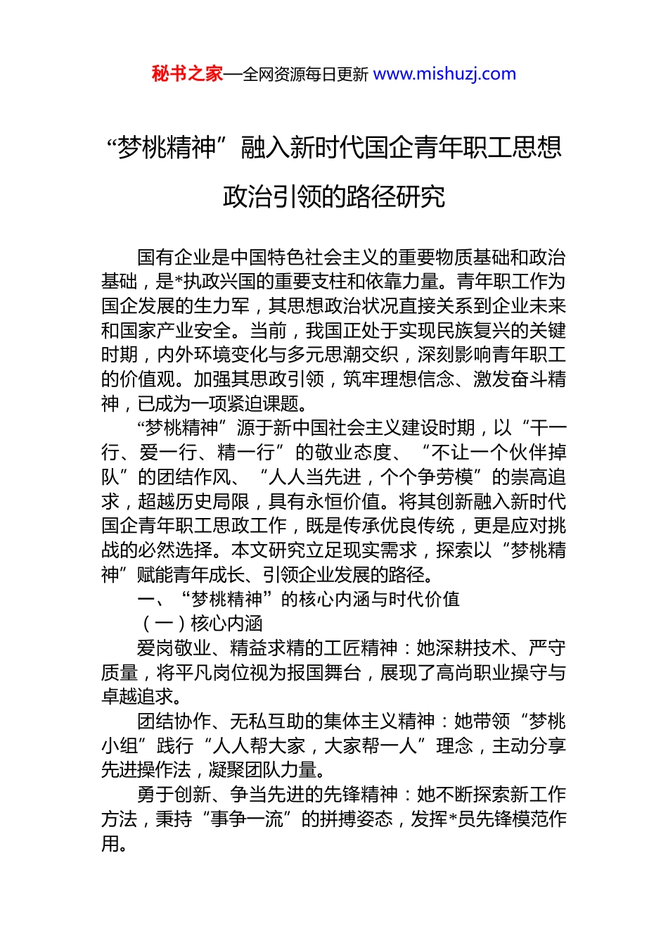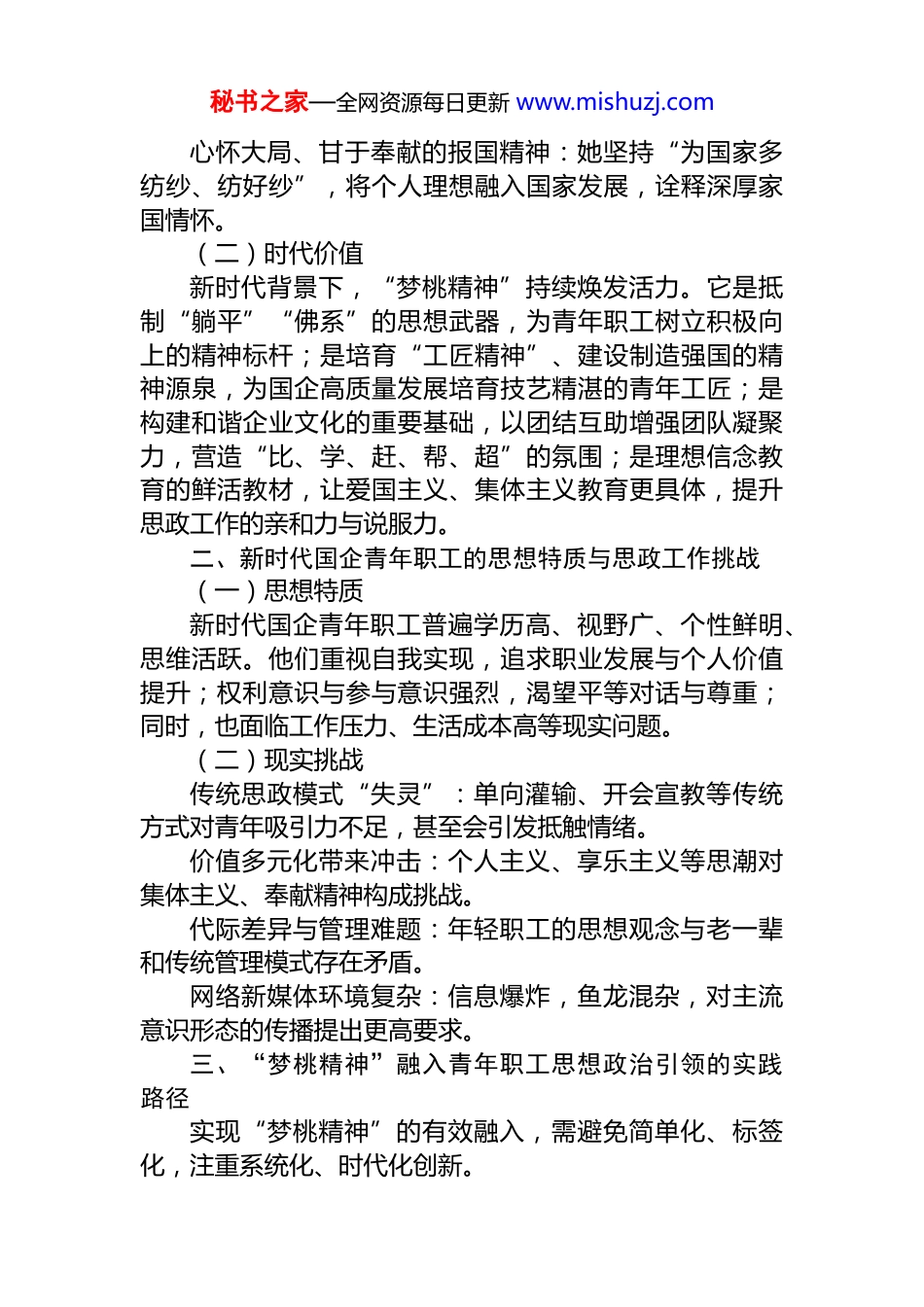 秘书之家—全网资源每日更新 www.mishuzj.com“梦桃精神”融入新时代国企青年职工思想政治引领的路径研究国有企业是中国特色社会主义的重要物质基础和政治基础,是*执政兴国的重要支柱和依靠力量。青年职工作为国企发展的生力军,其思想政治状况直接关系到企业未来和国家产业安全。当前,我国正处于实现民族复兴的关键时期,内外环境变化与多元思潮交织,深刻影响青年职工的价值观。加强其思政引领,筑牢理想信念、激发奋斗精神,已成为一项紧迫课题。“梦桃精神”源于新中国社会主义建设时期,以“干一行、爱一行、精一行”的敬业态度、“不让一个伙伴掉队”的团结作风、“人人当先进,个个争劳模”的崇高追求,超越历史局限,具有永恒价值。将其创新融入新时代国企青年职工思政工作,既是传承优良传统,更是应对挑战的必然选择。本文研究立足现实需求,探索以“梦桃精神”赋能青年成长、引领企业发展的路径。一、“梦桃精神”的核心内涵与时代价值(一)核心内涵爱岗敬业、精益求精的工匠精神:她深耕技术、严守质量,将平凡岗位视为报国舞台,展现了高尚职业操守与卓越追求。团结协作、无私互助的集体主义精神:她带领“梦桃小组”践行“人人帮大家,大家帮一人”理念,主动分享先进操作法,凝聚团队力量。勇于创新、争当先进的先锋精神:她不断探索新工作方法,秉持“事争一流”的拼搏姿态,发挥*员先锋模范作用。秘书之家—全网资源每日更新 www.mishuzj.com心怀大局、甘于奉献的报国精神:她坚持“为国家多纺纱、纺好纱”,将个人理想融入国家发展,诠释深厚家国情怀。(二)时代价值新时代背景下,“梦桃精神”持续焕发活力。它是抵制“躺平”“佛系”的思想武器,为青年职工树立积极向上的精神标杆;是培育“工匠精神”、建设制造强国的精神源泉,为国企高质量发展培育技艺精湛的青年工匠;是构建和谐企业文化的重要基础,以团结互助增强团队凝聚力,营造“比、学、赶、帮、超”的氛围;是理想信念教育的鲜活教材,让爱国主义、集体主义教育更具体,提升思政工作的亲和力与说服力。二、新时代国企青年职工的思想特质与思政工作挑战(一)思想特质新时代国企青年职工普遍学历高、视野广、个性鲜明、思维活跃。他们重视自我实现,追求职业发展与个人价值提升;权利意识与参与意识强烈,渴望平等对话与尊重;同时,也面临工作压力、生活成本高等现实问题。(二)现实挑战传统思政模式“失灵”:单向灌输、开会宣教等传统方式对青年吸引力不足,甚至会引发抵触情绪。价值多元化带来冲击:个人主义、享乐主义等思潮对集体主义、奉献精神构成挑战。代际差异与管理难题:年轻职工的思想观念与老一辈和传统管理模式存在矛盾。网络新媒体环境复杂:信息爆炸,鱼龙混杂,对主流意识形态的传播提出更高要求。三、“梦桃精神”融入青年职工思想政治引领的实践路径实现“梦桃精神”的有效融入,需避免简单化、标签化,注重系统化、时代化创新。秘书之家—全网资源每日更新 www.mishuzj.com(一)路径一:深化教育引导,推动精神内涵时代化阐释创新话语体系:将“高标准”转化为“追求极致用户体验”、“抢困难”转化为“挑战高价值项目”,以“潮言潮语”赋予时代气息。构建叙事体系:挖掘宣传当代国企中的“新时代梦桃传人”,如技术创新、精准扶贫、抗击疫情中的青年楷模让精神传承可感可知。融入培训体系:将“梦桃精神”纳入员工入职培训、*员教育的必修课,通过情景模拟、案例研讨、前辈访谈等互动方式深化理解。(二)路径二:注重文化浸润,营造崇尚实干奉献的组织氛围打造实体文化阵地:建设厂史馆、文化长廊,利用办公区等空间,通过标语、电子屏等进行可视化宣传,让精神元素融入工作环境。丰富文化活动载体:开展“梦桃杯”劳动竞赛,评选“梦桃式班组”和“青年标兵”,将精神弘扬与生产经营紧密结合。创作网络文化产品:鼓励青年职工创作以“梦桃精神”为主题的微电影、短视频等,利用企业公众号、视频号传播,实现“指尖上的引领”。(三)路径三:强化实践养成,搭建岗位建功立业的平台实施“导师带徒”升级版:不仅传授技艺,更要传承作风。为青年职工选派德技双馨的...