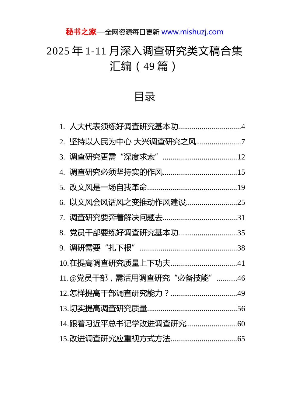 秘书之家—全网资源每日更新 www.mishuzj.com2025 年 1-11 月深入调查研究类文稿合集汇编(49 篇)目录1. 人大代表须练好调查研究基本功................................42. 坚持以人民为中心 大兴调查研究之风.......................73. 调查研究更需“深度求索”......................................124. 调查研究必须坚持实的作风......................................155. 改文风是一场自我革命..............................................196. 以文风会风话风之变推动作风建设..........................257. 调查研究要奔着解决问题去......................................318. 党员干部要练好调查研究基本功..............................359. 调研需要“扎下根”..................................................3810.在提高调查研究质量上下功夫..................................4111.@党员干部,需活用调查研究“必备技能”..........4612.怎样提高干部调查研究能力?..................................4913.切实提高调查研究质量..............................................5614.跟着习近平总书记学改进调查研究..........................6015.改进调查研究应重视方式方法..................................65秘书之家—全网资源每日更新 www.mishuzj.com16.践行“短实新”文风 推动党的创新理论更加深入人心..................................................................................7017.深入基层调研关键要“沉到底”..............................7518.调研切莫“只看病不开方”......................................7819.准确把握调查研究的科学方法..................................8020.“改进调查研究”为何位列中央八项规定第一条....8521.掌握调查研究这个基本功..........................................9322.到“田野”里寻找好办法........................................10323.多觅“穿草鞋者”....................................................10624.调研要立足解决问题................................................10825.以全过程理念抓好中青班学员调查研究................11126.把改文风作为加强作风建设的必修课....................11327.深刻认识调查研究对抓好落实的极端重要性........11628.调查研究是成事之道................................................13029.调查研究关键“三问”:问主题、问差距、问实效....................................................................................13930.正确的决策离不开调查研究....................................14331.掌握好调查研究这个基本功....................................14732.让调查研究回归本真................................................15133.掌握调查研究基本功................................................15434.“后院和角落”见真章..............................................158秘书之家—全网资源每日更新 www.mishuzj.com35.谈谈如何搞好调查研究............................................16136.用好用活调查研究的辩证思维方法........................16937.把握“改进调查研究”的意蕴与方法....................17338.改进文风,不妨从去除“说教味”开始................18039.把调查研究这个传家宝传承好................................18140.做好调查研究这篇大文章........................................18341.中国共产党调查研究的认识论本质........................19142.踩实提高调研质量的每一步....................................19743.如何理解调查研究要坚持党的群众路线?............20044.与时俱进构建现代调查研究方法体系....................20445.善用大数据赋能调查研究........................................20746.做足做实调查研究基本功........................................20947.改革开放以来调查研究方法...