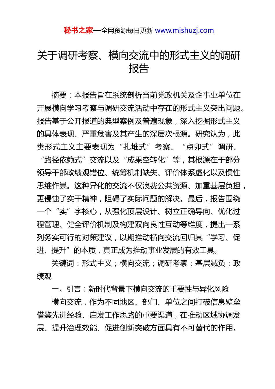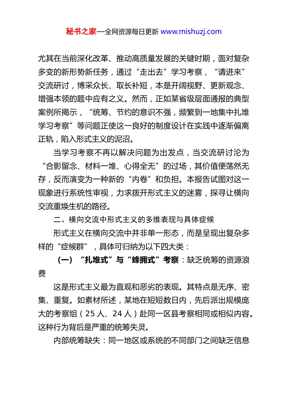 秘书之家—全网资源每日更新 www.mishuzj.com关于调研考察、横向交流中的形式主义的调研报告摘要:本报告旨在系统剖析当前党政机关及企事业单位在开展横向学习考察与调研交流活动中存在的形式主义突出问题。报告基于公开报道的典型案例及普遍现象,深入挖掘形式主义的具体表现、严重危害及其产生的深层次根源。研究认为,此类形式主义主要表现为“扎堆式”考察、“点卯式”调研、“路径依赖式”交流以及“成果空转化”等,其根源在于部分领导干部政绩观错位、统筹机制缺失、评价体系虚化以及惯性思维作祟。这种异化的交流不仅浪费公共资源、加重基层负担,更侵蚀了实干精神,阻碍了实际问题的解决。最后,报告围绕一个“实”字核心,从强化顶层设计、树立正确导向、优化过程管理、健全评价机制及构建双向良性互动等维度,提出一系列务实可行的对策建议,以期推动横向交流回归其“学习、促进、提升”的本质,真正成为推动事业发展的有效工具。关键词:形式主义;横向交流;调研考察;基层减负;政绩观一、引言:新时代背景下横向交流的重要性与异化风险横向交流,作为不同地区、部门、单位之间打破信息壁垒借鉴先进经验、启发工作思路的重要渠道,在推动区域协调发展、提升治理效能、促进创新突破方面具有不可替代的作用。秘书之家—全网资源每日更新 www.mishuzj.com尤其在当前深化改革、推动高质量发展的关键时期,面对复杂多变的新形势新任务,通过“走出去”学习考察,“请进来”交流研讨,博采众长、取长补短,本是开阔视野、更新观念、增强本领的题中应有之义。然而,正如某省级层面通报的典型案例所揭示,“统筹、节约的意识不强,频繁到一地集中扎堆学习考察”等问题正使这一良好的制度设计在实践中逐渐偏离正轨,陷入形式主义的泥沼。当学习考察不再以解决问题为出发点,当交流研讨沦为“合影留念、材料一堆、心得全无”的过场,其价值便荡然无存,反而演变为一种新的“内卷”和负担。本报告试图对这一现象进行系统性审视,力求拨开形式主义的迷雾,探寻让横向交流重焕生机的路径。二、横向交流中形式主义的多维表现与具体症候形式主义在横向交流中并非单一形态,而是呈现出复杂多样的“症候群”,具体可归纳为以下四大类:(一)“扎堆式”与“蜂拥式”考察:缺乏统筹的资源浪费这是形式主义最为直观和恶劣的表现。其特点是无序、密集、重复。如素材所述,某地在短短数日内,先后派出规模庞大的考察组(25 人、24 人)赴同一区县考察相同或相似内容。这种行为背后是严重的统筹失灵。内部统筹缺失:同一地区或系统的不同部门之间缺乏信息秘书之家—全网资源每日更新 www.mishuzj.com共享与计划协调机制。A 部门刚考察回来,B 部门又因“不知情”或“各自为政”而再次出发,导致接待方在短期内疲于应付内容雷同的考察团。“热点”追逐效应:某个地区或单位因某项工作成为“典型”后,立刻成为各方学习的“朝圣地”。各地考察团不顾自身实际需求,一窝蜂地涌向该地,形成“井喷”现象。这不仅使接待方超负荷运转,也使得考察效果因人流拥挤而大打折扣,参观变成“看人海”,交流沦为“听录音”。规模与成本失控:考察团规模动辄数十人,其中不乏“搭便车”人员,将学习考察异化为福利待遇或人际交往活动。交通、食宿、接待等费用高昂,与“节俭高效”的原则背道而驰,造成巨大的公共财政资金浪费。(二)“蜻蜓点水式”与“囫囵吞枣式”调研:深度与专注的缺失这类形式主义看似“忙碌”,实则“空洞”,追求的是表面的“广度”而非实质的“深度”。主题泛化,焦点模糊:出发前缺乏充分的问题梳理和目标设定。考察方案中罗列的目标包罗万象,希望在短短几天内“学完所有先进经验”。结果必然是“走马观花”,每个点位都是“半小时参观、十分钟拍照”,对任何一项工作的深层逻辑和具体细节都未能深入探究。正如报告所指,“短短几日便想覆盖方方面面,结果只能是‘蜻蜓点水’‘囫囵吞枣’。”秘书之家—全网资源每日更新 www.mishuzj.com准备不足,被动接受:考察组成员对考察点位的背景、特点、难点缺乏事前研究。行程中满足于被动地听介绍、看展板,沦为“录音笔”和...