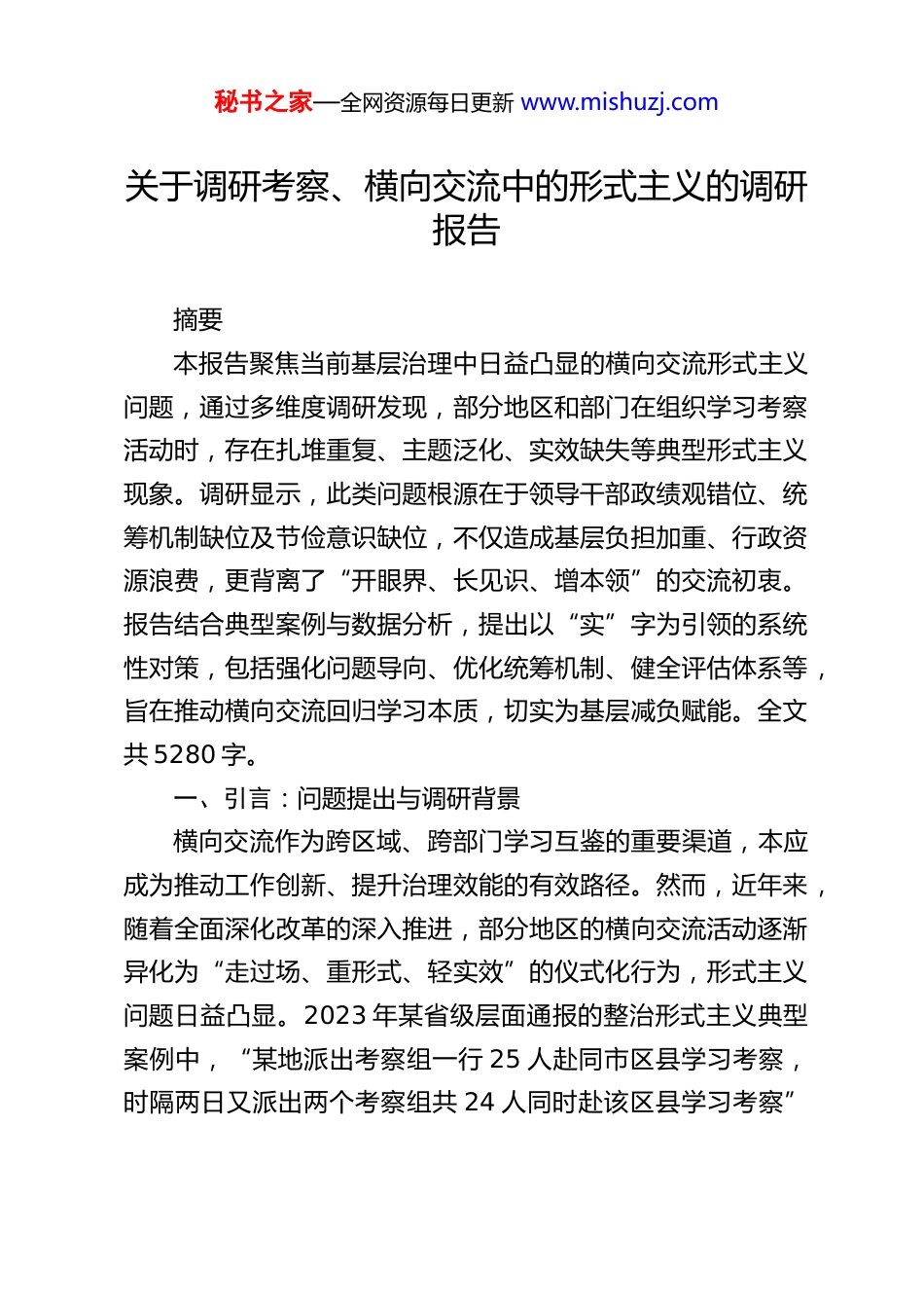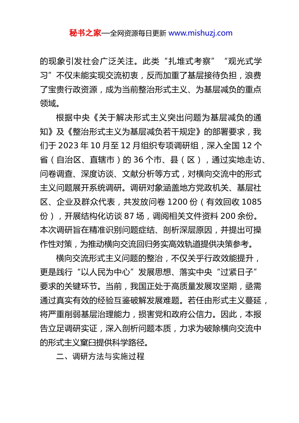 秘书之家—全网资源每日更新 www.mishuzj.com关于调研考察、横向交流中的形式主义的调研报告摘要本报告聚焦当前基层治理中日益凸显的横向交流形式主义问题,通过多维度调研发现,部分地区和部门在组织学习考察活动时,存在扎堆重复、主题泛化、实效缺失等典型形式主义现象。调研显示,此类问题根源在于领导干部政绩观错位、统筹机制缺位及节俭意识缺位,不仅造成基层负担加重、行政资源浪费,更背离了“开眼界、长见识、增本领”的交流初衷。报告结合典型案例与数据分析,提出以“实”字为引领的系统性对策,包括强化问题导向、优化统筹机制、健全评估体系等,旨在推动横向交流回归学习本质,切实为基层减负赋能。全文共 5280 字。一、引言:问题提出与调研背景横向交流作为跨区域、跨部门学习互鉴的重要渠道,本应成为推动工作创新、提升治理效能的有效路径。然而,近年来,随着全面深化改革的深入推进,部分地区的横向交流活动逐渐异化为“走过场、重形式、轻实效”的仪式化行为,形式主义问题日益凸显。2023 年某省级层面通报的整治形式主义典型案例中,“某地派出考察组一行 25 人赴同市区县学习考察,时隔两日又派出两个考察组共 24 人同时赴该区县学习考察”秘书之家—全网资源每日更新 www.mishuzj.com的现象引发社会广泛关注。此类“扎堆式考察”“观光式学习”不仅未能实现交流初衷,反而加重了基层接待负担,浪费了宝贵行政资源,成为当前整治形式主义、为基层减负的重点领域。根据中央《关于解决形式主义突出问题为基层减负的通知》及《整治形式主义为基层减负若干规定》的部署要求,我们于 2023 年 10 月至 12 月组织专项调研组,深入全国 12 个省(自治区、直辖市)的 36 个市、县(区),通过实地走访、问卷调查、深度访谈、文献分析等方式,对横向交流中的形式主义问题展开系统调研。调研对象涵盖地方党政机关、基层社区、企业及群众代表,共发放问卷 1200 份(有效回收 1085份),开展结构化访谈 87 场,调阅相关文件资料 200 余份。本次调研旨在精准识别问题症结、剖析深层原因,并提出可操作性对策,为推动横向交流回归务实高效轨道提供决策参考。横向交流形式主义问题的整治,不仅关乎行政效能提升,更是践行“以人民为中心”发展思想、落实中央“过紧日子”要求的关键环节。当前,我国正处于高质量发展攻坚期,亟需通过真实有效的经验互鉴破解发展难题。若任由形式主义蔓延,将严重削弱基层治理能力,损害党和政府公信力。因此,本报告立足调研实证,深入剖析问题本质,力求为破除横向交流中的形式主义窠臼提供科学路径。二、调研方法与实施过程秘书之家—全网资源每日更新 www.mishuzj.com为确保调研结果的客观性与代表性,本次调研采用“定量与定性结合、线上与线下联动”的复合方法体系,具体实施过程如下:(一)多维度数据采集问卷调查:面向省、市、县三级机关干部及基层接待单位设计结构化问卷,内容涵盖考察频次、规模、主题设置、实效评价等 12 个维度。问卷通过“线上平台+纸质投放”双渠道发放,覆盖东、中、西部地区,最终回收有效问卷 1085 份,其中领导干部占比 35%,基层工作人员占比 65%。深度访谈:选取 28 个典型地区,对 42 名地方主官、35名基层接待负责人及 10 名企业代表进行半结构化访谈,重点聚焦“考察动因”“执行痛点”“改进建议”等核心议题,单次访谈时长平均 90 分钟,形成文字记录 28 万字。实地观察:调研组以“嵌入式”方式参与 5 场横向交流活动,全程记录行程安排、互动环节及后续落实情况,尤其关注“考察点选择逻辑”“问题讨论深度”等细节。文献分析:系统梳理 2019—2023 年中央及省级层面关于整治形式主义的政策文件 127 份、通报案例 83 起,建立“问题类型—政策响应”对应数据库。(二)科学抽样与质量控制分层抽样:按经济发展水平将调研地区分为三类(发达、中等、欠发达),每类随机抽取 12 个样本点,确保地域代表秘书之家—全网资源每日更新 www.mishuzj.com性。三角验证:对关键数据采用“问卷+访谈+文件”三方比对,如某县“年均接待考察团 47 ...