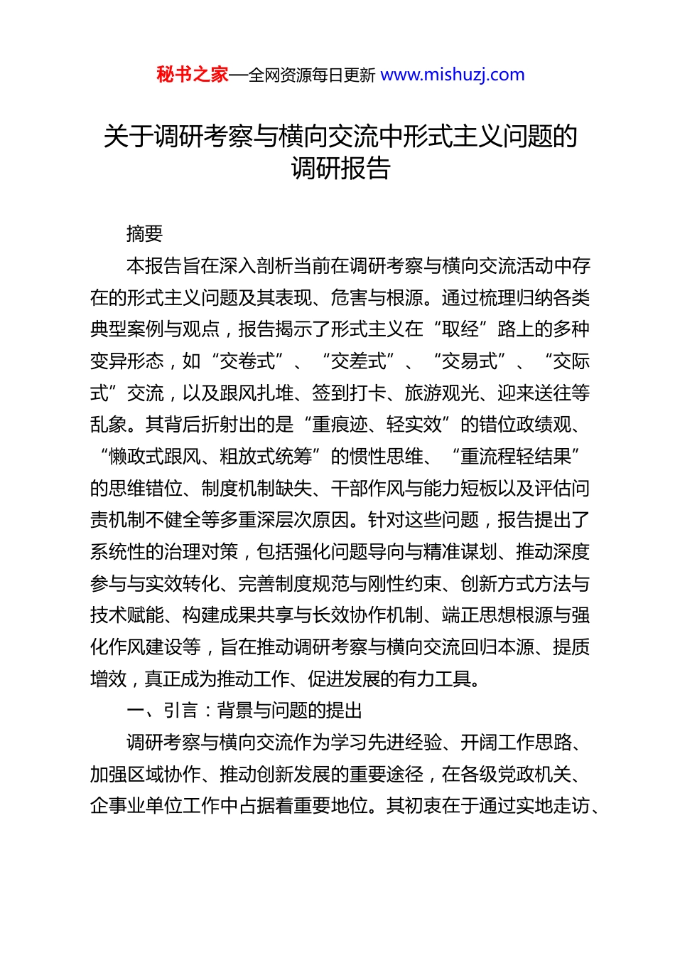 秘书之家—全网资源每日更新 www.mishuzj.com关于调研考察与横向交流中形式主义问题的调研报告摘要本报告旨在深入剖析当前在调研考察与横向交流活动中存在的形式主义问题及其表现、危害与根源。通过梳理归纳各类典型案例与观点,报告揭示了形式主义在“取经”路上的多种变异形态,如“交卷式”、“交差式”、“交易式”、“交际式”交流,以及跟风扎堆、签到打卡、旅游观光、迎来送往等乱象。其背后折射出的是“重痕迹、轻实效”的错位政绩观、“懒政式跟风、粗放式统筹”的惯性思维、“重流程轻结果”的思维错位、制度机制缺失、干部作风与能力短板以及评估问责机制不健全等多重深层次原因。针对这些问题,报告提出了系统性的治理对策,包括强化问题导向与精准谋划、推动深度参与与实效转化、完善制度规范与刚性约束、创新方式方法与技术赋能、构建成果共享与长效协作机制、端正思想根源与强化作风建设等,旨在推动调研考察与横向交流回归本源、提质增效,真正成为推动工作、促进发展的有力工具。一、引言:背景与问题的提出调研考察与横向交流作为学习先进经验、开阔工作思路、加强区域协作、推动创新发展的重要途径,在各级党政机关、企事业单位工作中占据着重要地位。其初衷在于通过实地走访、秘书之家—全网资源每日更新 www.mishuzj.com座谈研讨、经验分享等方式,借鉴“他山之石”,破解自身发展难题,提升工作水平与治理效能。然而,在实际操作过程中,一些地方和部门的调研考察与横向交流活动却逐渐偏离初衷,异化为各种形式主义的“秀场”和“包袱”,不仅未能取得预期效果,反而浪费了宝贵的行政资源、财政资金和干部精力,助长了不良风气,损害了党和政府的形象。“取经”本意为求取真知、解决实际问题,但若“取经”路上形式主义蔓延,则“真经”难求,反受其害。当前,整治调研考察与横向交流中的形式主义,已成为转变工作作风、提升工作实效、减轻基层负担的迫切要求。本报告将结合多方观察与分析,对这一问题进行深入调研与系统阐述,以期为识别、遏制和根治此类形式主义提供参考。二、调研考察与横向交流中形式主义的主要表现与众生相形式主义在调研考察与横向交流活动中表现多样,渗透于活动的各个环节,呈现出“变异众生相”。(一)动机异化:交流目的的偏离与扭曲“交卷”心态:将组织或参与交流视为完成任务、应付检查的“答卷”。事前缺乏对考察主题、点位、形式的深入考量,过程中蜻蜓点水、走马观花,回来后会上讲一遍、报告交一份便算完结,至于学到了什么、如何应用,则抛之脑后。交流成了“走过场”,满足于程序上的完成。“交差”心态:过分强调考察交流的次数、频率等量化指标,秘书之家—全网资源每日更新 www.mishuzj.com将“去了多少地方”、“见了多少人”等同于工作成绩。热衷于打卡式参观、重复性座谈,只满足于横向上的“到过了”、“见过了”,而对于需要垂直深耕的帮扶项目、长期合作效应等实质性内容关注不够、投入不足。“交易”心态:将横向交流异化为“你来我往”的利益交换或“变相福利”。精心设计包含旅游景点的线路,安排高规格接待,使学习考察沦为公费旅游的幌子。“今天你到我这里学习,明天我到你那里考察”,交流成了维系关系、交换资源的工具。“交际”心态:特别是在干部人事调整后,常以学习考察为名,行“拉关系、套近乎、养人情”之实。队伍浩荡,注重迎来送往的排场和礼仪,把宝贵的工作交流时间变成了社交场,背离了学习提升的初衷。(二)过程空转:组织实施中的表面文章跟风扎堆现象:缺乏独立思考和实际需求研判,盲目追逐上级关注或媒体宣传的“热点”、“典型”地区。不同部门、不同地区在短时间内蜂拥而至,造成考察点接待压力巨大,学习效果却因人流拥挤而大打折扣。考察队伍的规模有时也被错误地视为重视程度的标识。“签到打卡式”交流:活动安排流于形式,缺乏突出问题导向的深度互动。在会议室听听汇报、在现场拍拍照片、收集一堆材料,便心安理得地认为完成了任务。交流过程停留在浅层秘书之家—全网资源每日更新 www.mishuzj.com次的感知,未能触及核心经验和深层问题。“旅游观光式”交流:行程安排...