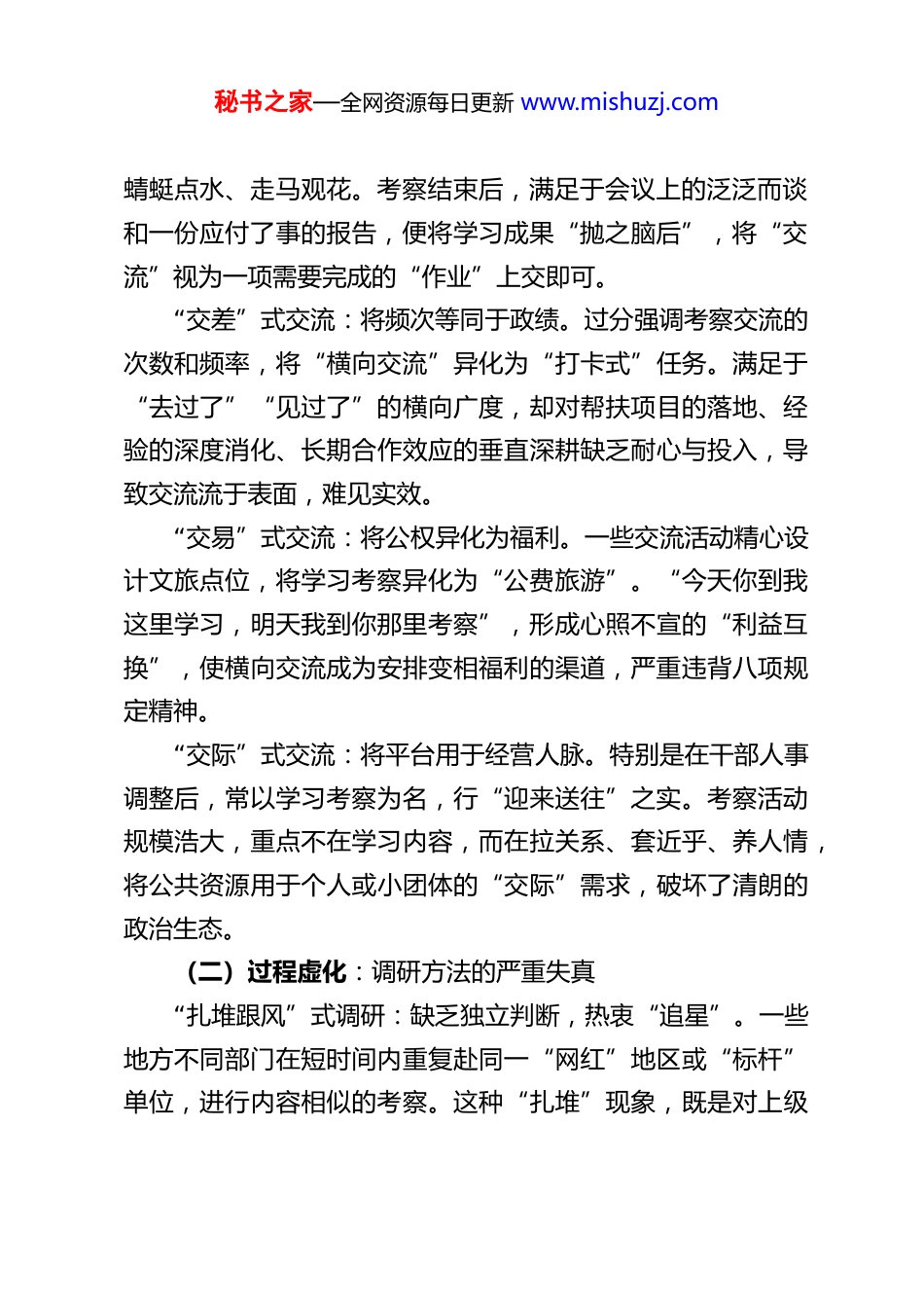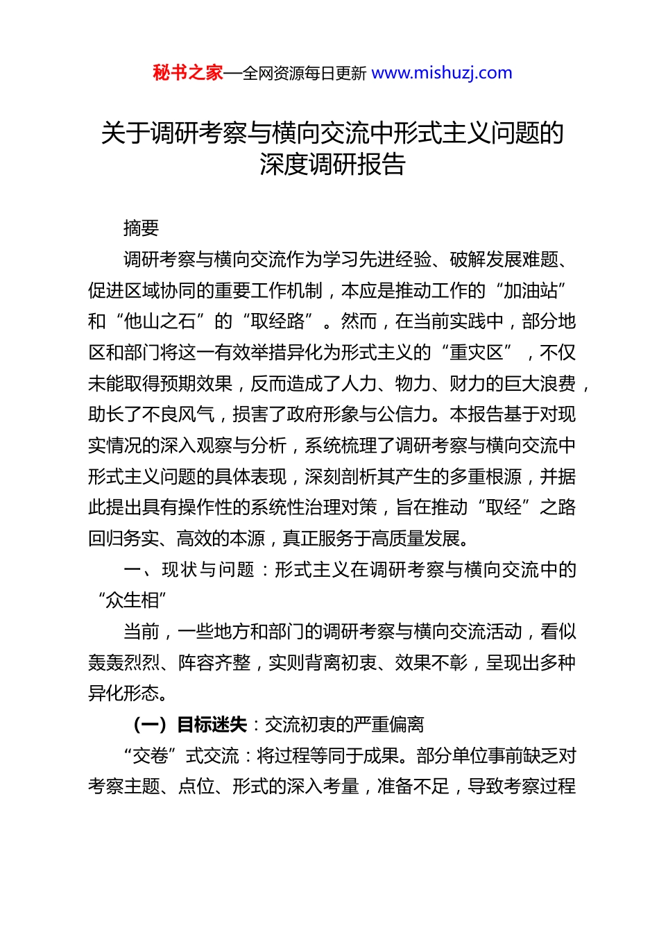 秘书之家—全网资源每日更新 www.mishuzj.com关于调研考察与横向交流中形式主义问题的深度调研报告摘要调研考察与横向交流作为学习先进经验、破解发展难题、促进区域协同的重要工作机制,本应是推动工作的“加油站”和“他山之石”的“取经路”。然而,在当前实践中,部分地区和部门将这一有效举措异化为形式主义的“重灾区”,不仅未能取得预期效果,反而造成了人力、物力、财力的巨大浪费,助长了不良风气,损害了政府形象与公信力。本报告基于对现实情况的深入观察与分析,系统梳理了调研考察与横向交流中形式主义问题的具体表现,深刻剖析其产生的多重根源,并据此提出具有操作性的系统性治理对策,旨在推动“取经”之路回归务实、高效的本源,真正服务于高质量发展。一、现状与问题:形式主义在调研考察与横向交流中的“众生相”当前,一些地方和部门的调研考察与横向交流活动,看似轰轰烈烈、阵容齐整,实则背离初衷、效果不彰,呈现出多种异化形态。(一)目标迷失:交流初衷的严重偏离“交卷”式交流:将过程等同于成果。部分单位事前缺乏对考察主题、点位、形式的深入考量,准备不足,导致考察过程秘书之家—全网资源每日更新 www.mishuzj.com蜻蜓点水、走马观花。考察结束后,满足于会议上的泛泛而谈和一份应付了事的报告,便将学习成果“抛之脑后”,将“交流”视为一项需要完成的“作业”上交即可。“交差”式交流:将频次等同于政绩。过分强调考察交流的次数和频率,将“横向交流”异化为“打卡式”任务。满足于“去过了”“见过了”的横向广度,却对帮扶项目的落地、经验的深度消化、长期合作效应的垂直深耕缺乏耐心与投入,导致交流流于表面,难见实效。“交易”式交流:将公权异化为福利。一些交流活动精心设计文旅点位,将学习考察异化为“公费旅游”。“今天你到我这里学习,明天我到你那里考察”,形成心照不宣的“利益互换”,使横向交流成为安排变相福利的渠道,严重违背八项规定精神。“交际”式交流:将平台用于经营人脉。特别是在干部人事调整后,常以学习考察为名,行“迎来送往”之实。考察活动规模浩大,重点不在学习内容,而在拉关系、套近乎、养人情,将公共资源用于个人或小团体的“交际”需求,破坏了清朗的政治生态。(二)过程虚化:调研方法的严重失真“扎堆跟风”式调研:缺乏独立判断,热衷“追星”。一些地方不同部门在短时间内重复赴同一“网红”地区或“标杆”单位,进行内容相似的考察。这种“扎堆”现象,既是对上级秘书之家—全网资源每日更新 www.mishuzj.com关注点的盲目跟从,也暴露出自身缺乏问题导向和创新思维,把横向交流的次数当作“主动作为”的肤浅指标,把考察队伍的规模看作“重视程度”的错误标识。“签到打卡”式调研:流程走过场,痕迹代替实绩。此类调研突出问题导向缺失,满足于在会议室听听汇报、在现场拍拍照片、安心拼凑交流报告。整个流程如同“签到打卡”,看似完整,实则未能深入一线触及核心问题,调研报告往往成为材料与照片的简单堆砌,缺乏真知灼见。“旅游观光”式调研:内容安排本末倒置。在点位选择和时间安排上,重于“景”而疏于“经”。考察路线精心设计,包含大量与主题关联不大的旅游景点或形象工程,真正需要深入学习的核心环节、困难痛点却被一带而过,使严肃的考察活动变了味。“迎来送往”式调研:接待负担重于学习实效。一些考察方将接待规格等同于对方的重视程度,我方“说走就走”,对接待方则“张口就要材料”,提出不切实际的接待要求,导致横向交流成为接待方沉重的负担,疲于应付,反而影响了正常工作的开展。(三)结果空转:成果转化的严重缺位“重痕迹、轻实效”的成果评估:整个交流活动以“新闻稿写好、交流发言讲好”为终点。至于考察是否推动了工作、解决了实际问题,则无人追问、无人问责。这种“重形轻效”的秘书之家—全网资源每日更新 www.mishuzj.com政绩观,导致交流与实干成为互不相干的“两张皮”。“伪交流”下的思想匮乏:一些交流活动议程满满,但缺乏思想的深度碰撞与智慧的真诚共享。交流内容追求“大而全”,实则为本地成绩的“巡回展览”,学习方缺乏追问与争...