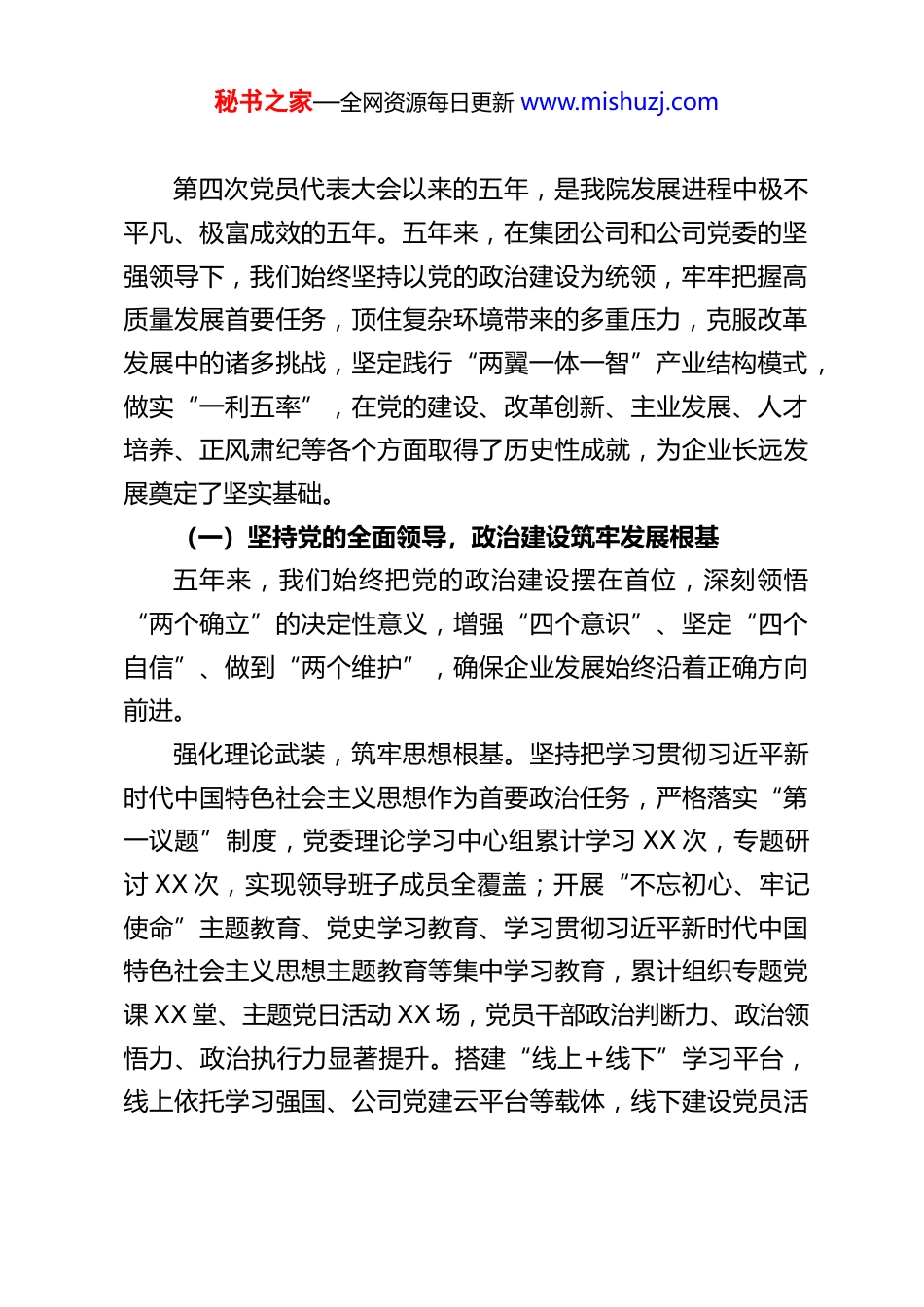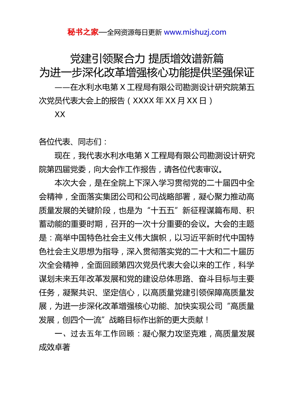 秘书之家—全网资源每日更新 www.mishuzj.com党建引领聚合力 提质增效谱新篇为进一步深化改革增强核心功能提供坚强保证——在水利水电第 X 工程局有限公司勘测设计研究院第五次党员代表大会上的报告(XXXX 年 XX 月 XX 日)XX各位代表、同志们:现在,我代表水利水电第 X 工程局有限公司勘测设计研究院第四届党委,向大会作工作报告,请各位代表审议。本次大会,是在全院上下深入学习贯彻党的二十届四中全会精神,全面落实集团公司和公司战略部署,凝心聚力推动高质量发展的关键阶段,也是为“十五五”新征程谋篇布局、积蓄动能的重要时期,召开的一次十分重要的会议。大会的主题是:高举中国特色社会主义伟大旗帜,以习近平新时代中国特色社会主义思想为指导,深入贯彻落实党的二十大和二十届历次全会精神,全面回顾第四次党员代表大会以来的工作,科学谋划未来五年改革发展和党的建设总体思路、奋斗目标与主要任务,凝聚共识、坚定信心,以高质量党建引领保障高质量发展,为进一步深化改革增强核心功能、加快实现公司“高质量发展,创四个一流”战略目标作出新的更大贡献!一、过去五年工作回顾:凝心聚力攻坚克难,高质量发展成效卓著秘书之家—全网资源每日更新 www.mishuzj.com第四次党员代表大会以来的五年,是我院发展进程中极不平凡、极富成效的五年。五年来,在集团公司和公司党委的坚强领导下,我们始终坚持以党的政治建设为统领,牢牢把握高质量发展首要任务,顶住复杂环境带来的多重压力,克服改革发展中的诸多挑战,坚定践行“两翼一体一智”产业结构模式,做实“一利五率”,在党的建设、改革创新、主业发展、人才培养、正风肃纪等各个方面取得了历史性成就,为企业长远发展奠定了坚实基础。(一)坚持党的全面领导,政治建设筑牢发展根基五年来,我们始终把党的政治建设摆在首位,深刻领悟“两个确立”的决定性意义,增强“四个意识”、坚定“四个自信”、做到“两个维护”,确保企业发展始终沿着正确方向前进。强化理论武装,筑牢思想根基。坚持把学习贯彻习近平新时代中国特色社会主义思想作为首要政治任务,严格落实“第一议题”制度,党委理论学习中心组累计学习 XX 次,专题研讨 XX 次,实现领导班子成员全覆盖;开展“不忘初心、牢记使命”主题教育、党史学习教育、学习贯彻习近平新时代中国特色社会主义思想主题教育等集中学习教育,累计组织专题党课 XX 堂、主题党日活动 XX 场,党员干部政治判断力、政治领悟力、政治执行力显著提升。搭建“线上+线下”学习平台,线上依托学习强国、公司党建云平台等载体,线下建设党员活秘书之家—全网资源每日更新 www.mishuzj.com动室 XX 个、学习书屋 XX 个,形成常态化学习机制,推动党的创新理论入脑入心。严肃政治生活,涵养政治生态。严格执行新形势下党内政治生活的若干准则,认真落实“三会一课”、民主生活会、组织生活会、民主评议党员等制度,五年来累计召开民主生活会XX 次、组织生活会 XX 场次,批评与自我批评更加严肃认真,党内政治生活的政治性、时代性、原则性、战斗性不断增强。健全落实民主集中制,修订党委议事规则和决策程序,明确党委在重大经营管理事项中的前置研究讨论清单,五年来共召开党委会议 XX 次,审议重大事项 XX 项,确保党委“把方向、管大局、保落实”的领导作用充分发挥。贯彻上级部署,彰显政治担当。始终把企业发展融入国家战略和上级工作大局,坚决贯彻落实集团公司和公司党委各项决策部署,建立任务清单、责任清单、时限清单,实行台账式管理、项目化推进,确保各项部署落地见效。在服务国家重大水利工程、能源战略转型、绿色低碳发展等方面主动作为,圆满完成上级交办的各项重点任务,多次获得集团公司和公司表彰,以实际行动践行国有企业的政治责任和使命担当。(二)服务“国之大者”,改革发展激发内生动力五年来,我们始终聚焦主责主业,以深化改革破解发展难题,以拓展市场拓宽发展空间,“两翼一体一智”产业结构不断优化,核心竞争力持续提升。秘书之家—全网资源每日更新 www.mishuzj.com深化市场化改革,激发经营活力。积极响应国...