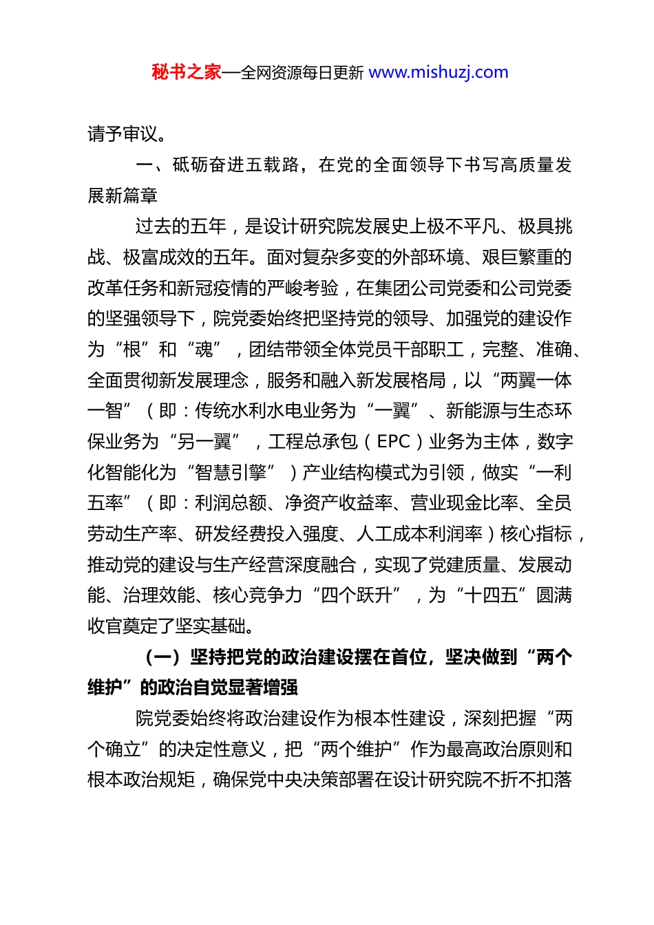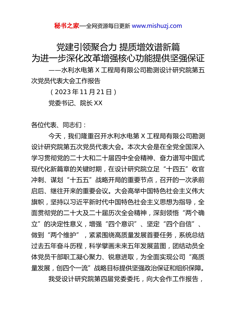 秘书之家—全网资源每日更新 www.mishuzj.com党建引领聚合力 提质增效谱新篇为进一步深化改革增强核心功能提供坚强保证——水利水电第 X 工程局有限公司勘测设计研究院第五次党员代表大会工作报告(2023 年 11 月 21 日)党委书记、院长 XX各位代表、同志们:今天,我们隆重召开水利水电第 X 工程局有限公司勘测设计研究院第五次党员代表大会。本次大会是在全党全国深入学习贯彻党的二十大和二十届四中全会精神、奋力谱写中国式现代化新篇章的关键时期,在设计研究院立足“十四五”收官冲刺、谋划“十五五”战略开局的重要节点,召开的一次承前启后、继往开来的重要会议。大会高举中国特色社会主义伟大旗帜,坚持以习近平新时代中国特色社会主义思想为指导,全面贯彻党的二十大及二十届历次全会精神,深刻领悟“两个确立”的决定性意义,增强“四个意识”、坚定“四个自信”、做到“两个维护”,紧紧围绕高质量发展首要任务,系统总结过去五年奋斗历程,科学擘画未来五年发展蓝图,团结动员全体党员干部职工凝心聚力、锐意进取,为全面实现公司“高质量发展,创四个一流”战略目标提供坚强政治保证和组织保障。我受设计研究院第四届党委委托,向大会作工作报告,秘书之家—全网资源每日更新 www.mishuzj.com请予审议。一、砥砺奋进五载路,在党的全面领导下书写高质量发展新篇章过去的五年,是设计研究院发展史上极不平凡、极具挑战、极富成效的五年。面对复杂多变的外部环境、艰巨繁重的改革任务和新冠疫情的严峻考验,在集团公司党委和公司党委的坚强领导下,院党委始终把坚持党的领导、加强党的建设作为“根”和“魂”,团结带领全体党员干部职工,完整、准确、全面贯彻新发展理念,服务和融入新发展格局,以“两翼一体一智”(即:传统水利水电业务为“一翼”、新能源与生态环保业务为“另一翼”,工程总承包(EPC)业务为主体,数字化智能化为“智慧引擎”)产业结构模式为引领,做实“一利五率”(即:利润总额、净资产收益率、营业现金比率、全员劳动生产率、研发经费投入强度、人工成本利润率)核心指标,推动党的建设与生产经营深度融合,实现了党建质量、发展动能、治理效能、核心竞争力“四个跃升”,为“十四五”圆满收官奠定了坚实基础。(一)坚持把党的政治建设摆在首位,坚决做到“两个维护”的政治自觉显著增强院党委始终将政治建设作为根本性建设,深刻把握“两个确立”的决定性意义,把“两个维护”作为最高政治原则和根本政治规矩,确保党中央决策部署在设计研究院不折不扣落秘书之家—全网资源每日更新 www.mishuzj.com地生根。一是强化理论武装铸魂。严格执行“第一议题”制度,建立党委理论学习中心组“领学+研讨+实践”闭环机制,五年来组织中心组学习 58 次,专题研讨 23 场,覆盖党员干部1200 余人次。深入学习贯彻习近平总书记关于国有企业改革发展和党的建设重要论述、关于治水兴水的重要指示批示精神,开展“牢记嘱托、感恩奋进”主题教育实践活动,引导全体党员在学思践悟中筑牢信仰之基、补足精神之钙、把稳思想之舵。特别是在党的二十大召开后,迅速掀起学习宣传贯彻热潮,组建 12 支“党员先锋宣讲团”深入项目一线,开展“二十大精神进工地、进班组”活动 156 场次,推动党的创新理论“飞入寻常百姓家”。二是完善政治能力提升机制。制定《关于加强党的政治建设的实施意见》《贯彻落实习近平总书记重要指示批示工作闭环管理办法》,建立“台账管理、动态跟踪、督查反馈、考核问责”全链条机制。聚焦服务国家“江河战略”和“双碳”目标,主动对接南水北调后续工程、长江黄河生态保护修复等重大国家战略,五年来承担国家级重点水利水电项目勘测设计任务 47 项,其中南水北调中线后续工程、引江补汉工程等“国之重器”项目 12 项,以实际行动践行“国之大者”。2022 年,在应对长江流域特大干旱中,党员突击队 72 小时完成应急水源工程方案设计,获水利部通报表扬。秘书之家—全网资源每日更新 www.mishuzj.com三是严明政治纪律和政治规矩。定期开展政治生态分析研判,建立领导干部政治素质档案,将“两个维护”落...