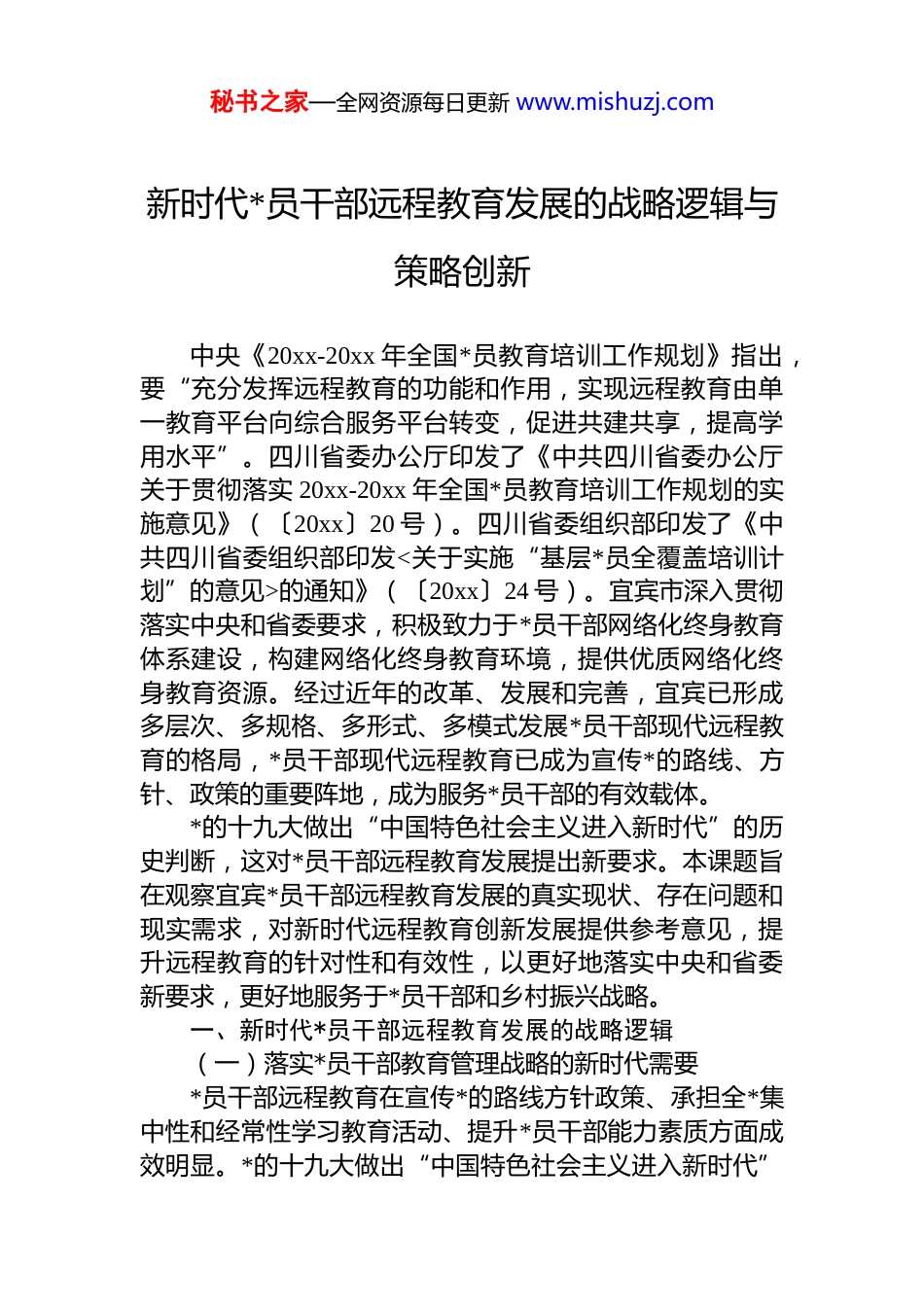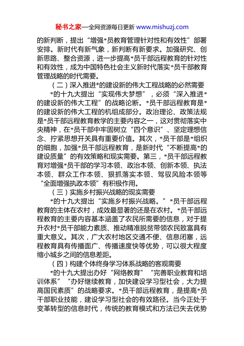 秘书之家—全网资源每日更新 www.mishuzj.com新时代*员干部远程教育发展的战略逻辑与策略创新中央《20xx-20xx 年全国*员教育培训工作规划》指出,要“充分发挥远程教育的功能和作用,实现远程教育由单一教育平台向综合服务平台转变,促进共建共享,提高学用水平”。四川省委办公厅印发了《中共四川省委办公厅关于贯彻落实 20xx-20xx 年全国*员教育培训工作规划的实施意见》(〔20xx〕20 号)。四川省委组织部印发了《中共四川省委组织部印发<关于实施“基层*员全覆盖培训计划”的意见>的通知》(〔20xx〕24 号)。宜宾市深入贯彻落实中央和省委要求,积极致力于*员干部网络化终身教育体系建设,构建网络化终身教育环境,提供优质网络化终身教育资源。经过近年的改革、发展和完善,宜宾已形成多层次、多规格、多形式、多模式发展*员干部现代远程教育的格局,*员干部现代远程教育已成为宣传*的路线、方针、政策的重要阵地,成为服务*员干部的有效载体。*的十九大做出“中国特色社会主义进入新时代”的历史判断,这对*员干部远程教育发展提出新要求。本课题旨在观察宜宾*员干部远程教育发展的真实现状、存在问题和现实需求,对新时代远程教育创新发展提供参考意见,提升远程教育的针对性和有效性,以更好地落实中央和省委新要求,更好地服务于*员干部和乡村振兴战略。一、新时代*员干部远程教育发展的战略逻辑(一)落实*员干部教育管理战略的新时代需要*员干部远程教育在宣传*的路线方针政策、承担全*集中性和经常性学习教育活动、提升*员干部能力素质方面成效明显。*的十九大做出“中国特色社会主义进入新时代”秘书之家—全网资源每日更新 www.mishuzj.com的新判断,提出“增强*员教育管理针对性和有效性”部署安排。新时代有新气象,新判断有新要求。加强研究、创新思路、整合资源,进一步提高*员干部远程教育的针对性和有效性,成为中国特色社会主义新时代落实*员干部教育管理战略的时代需要。(二)深入推进*的建设新的伟大工程战略的必然需要*的十九大提出“实现伟大梦想”,必须“深入推进*的建设新的伟大工程”的战略论断。*员干部远程教育是*的建设新的伟大工程的机组成部分。政治理论、政策法规是*员干部远程教育教学的主要内容之一,这对贯彻落实中央精神,在*员干部中牢固树立“四个意识”、坚定理想信念、拧紧思想开关具有重要价值。其次,*员干部是*组织的细胞,加强*员干部远程教育,是新时代“不断提高*的建设质量”的有效策略和现实需要。第三,*员干部远程教育对增强*员干部的学习本领、政治本领、创新本领、执法本领、群众工作本领、狠抓落实本领、驾驭风险本领等“全面增强执政本领”有积极作用。(三)实施乡村振兴战略的现实需要*的十九大提出“实施乡村振兴战略。”*员干部远程教育的主体在农村,成效最显著的还是在农村。*员干部远程教育的主要内容基本涵盖了农民所需要的信息,对于提升农村*员干部能力素质、推动精准脱贫带领农民致富具有重大意义。其次,广大农村地区交通不便、信息闭塞,远程教育具有传播面广、传播速度快等优势,可以很大程度缩小城乡之间的信息差距。(四)构建个体终身学习体系战略的客观需要*的十九大提出办好“网络教育”“完善职业教育和培训体系”“办好继续教育,加快建设学习型社会,大力提高国民素质”的战略要求。*员干部远程教育,是提高*员干部职业技能,建设学习型社会的有效路径。当今正处于变革转型的信息时代,传统的教育模式和方法已失去优势秘书之家—全网资源每日更新 www.mishuzj.com*员干部远程教育的开放性,不仅能满足信息化时代知识不断变更的需要,而且能突出创新知识在经济发展中的作用最终成为满足社会和个人发展需求的最优途径。其次,现代教育发展的目的是对个体内在本质的追求,重视人的本质与人性的全面生成、丰富和发展。创新*员干部远程教育发展,是信息化新时代构建个体终身学习体系战略的客观需要。二、宜宾市*员干部远程教育发展现状(一)有效样本特征当前,宜宾市共有 2821 个*员干部远程教育站点,实现了行政村的全覆盖。本文对宜宾市、县、镇、村等相关部门工作人员共计 40 人进行...