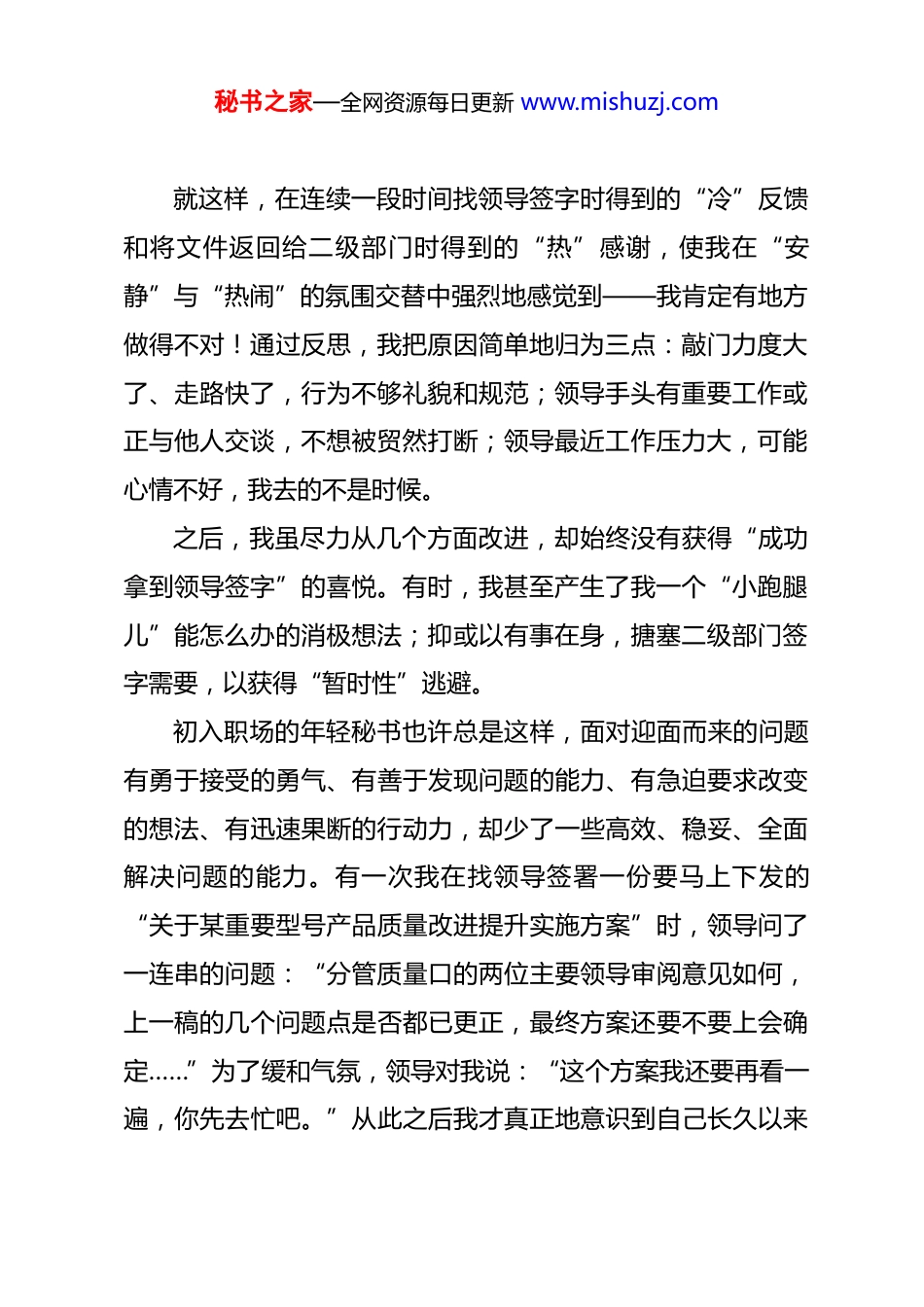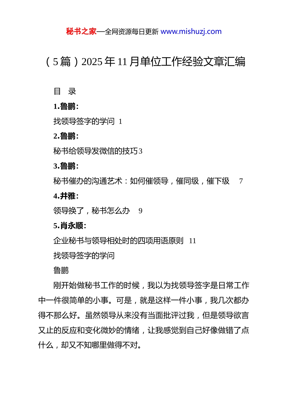 秘书之家—全网资源每日更新 www.mishuzj.com(5 篇)2025 年 11 月单位工作经验文章汇编目录1.鲁鹏:找领导签字的学问 12.鲁鹏:秘书给领导发微信的技巧33.鲁鹏:秘书催办的沟通艺术:如何催领导,催同级,催下级74.井雅:领导换了,秘书怎么办95.肖永顺:企业秘书与领导相处时的四项用语原则 11找领导签字的学问鲁鹏刚开始做秘书工作的时候,我以为找领导签字是日常工作中一件很简单的小事。可是,就是这样一件小事,我几次都办得不那么好。虽然领导从来没有当面批评过我,但是领导欲言又止的反应和变化微妙的情绪,让我感觉到自己好像做错了点什么,却又不知哪里做得不对。秘书之家—全网资源每日更新 www.mishuzj.com就这样,在连续一段时间找领导签字时得到的“冷”反馈和将文件返回给二级部门时得到的“热”感谢,使我在“安静”与“热闹”的氛围交替中强烈地感觉到——我肯定有地方做得不对!通过反思,我把原因简单地归为三点:敲门力度大了、走路快了,行为不够礼貌和规范;领导手头有重要工作或正与他人交谈,不想被贸然打断;领导最近工作压力大,可能心情不好,我去的不是时候。之后,我虽尽力从几个方面改进,却始终没有获得“成功拿到领导签字”的喜悦。有时,我甚至产生了我一个“小跑腿儿”能怎么办的消极想法;抑或以有事在身,搪塞二级部门签字需要,以获得“暂时性”逃避。初入职场的年轻秘书也许总是这样,面对迎面而来的问题有勇于接受的勇气、有善于发现问题的能力、有急迫要求改变的想法、有迅速果断的行动力,却少了一些高效、稳妥、全面解决问题的能力。有一次我在找领导签署一份要马上下发的“关于某重要型号产品质量改进提升实施方案”时,领导问了一连串的问题:“分管质量口的两位主要领导审阅意见如何,上一稿的几个问题点是否都已更正,最终方案还要不要上会确定……”为了缓和气氛,领导对我说:“这个方案我还要再看一遍,你先去忙吧。”从此之后我才真正地意识到自己长久以来秘书之家—全网资源每日更新 www.mishuzj.com的错误,并认识到找领导签字这件“小事”既不小也不简单。然后,我开始试着改变找领导签字时一心求“快”的习惯先“缓一缓”后,不仅一改之前找领导签字时饱受“空间压抑”与“言语静默”的忐忑心态,心中竟还平添了几分底气和主动配合协助二级部门找领导签字的自信。尝试有意“拖延时间”。在找领导签字之前,先向办事员询问有关情况:需批阅文件的进展、决策情况、办理时效和后续工作,并快速阅读文件。这样,在找领导签字时,我就能将需批阅文件的前因后果作简要概述,并将需签字页轻微折叠,这既为领导签字节省了思考和行动时间,也为高效地回复领导询问打好了基础。需要“耐心等待”。工作空闲之余也不再“窜部门、扯闲篇”,而是对领导什么时间、去了哪里、开什么会、重要程度如何、要多久等情况进行准确掌握。对于紧急文件则积极带领办事员或通知其上级,主动与领导沟通签字事宜;如遇重要会议,则抓住领导会中出入的“片刻之闲”;恰逢领导有重要商谈,则静候添茶契机;倘若领导实难抽身,则将实情汇报 b 角,完成签字。在这样的“耐心等待”下,我不再担忧因签字而打扰到领导,签字效率提高了很多。熟练运用“缓兵之计”。秘书之家—全网资源每日更新 www.mishuzj.com对于领导公务远行,我会据实告知办事员与相关责任部门并建议暂且搁置,待领导“回家”前,及早告知并督促其把握时间;如确因时限所迫,则在汇报情况并征求领导授权后,凭部门用印申请单,以领导签章代替签字。这样做既解决了领导不便签字的难处和责任部门需要签字的焦虑,也大大减少了我被催促和询问的频次,工作压力减轻了不少。虽然从事秘书工作时间不长,找领导签字这一件小事带来的教训与经验却弥足珍贵,甚至可以说是我职业生涯中的“小成功”。秘书给领导发微信的技巧鲁鹏发微信,我们当下日常生活中再普通不过的小事,在职场中却是一件必须被重视的大事。尤其对于秘书工作者而言,在与领导进行微信沟通的过程中,怎么发送信息,通过什么方式发,又如何让领导看的明白、看着方便,是我们必须思考和做好的一项重要工作。一、能打字...