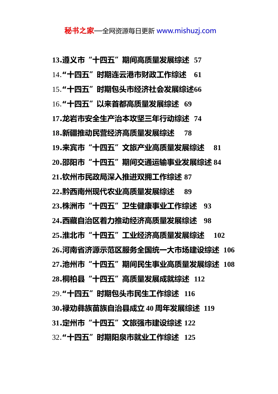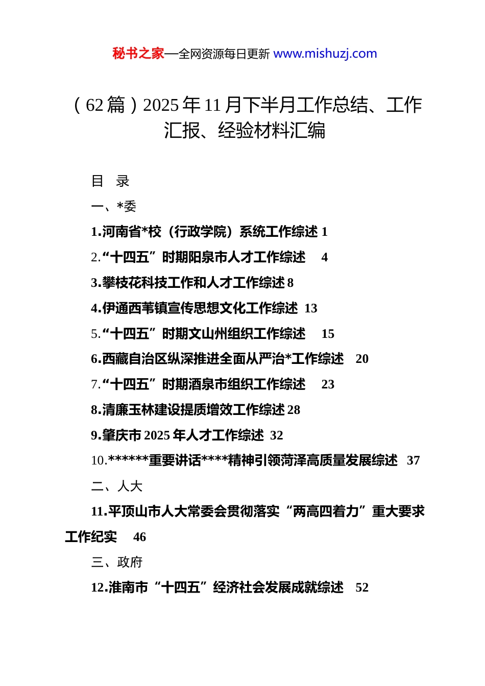 秘书之家—全网资源每日更新 www.mishuzj.com(62 篇)2025 年 11 月下半月工作总结、工作汇报、经验材料汇编目录一、*委1.河南省*校(行政学院)系统工作综述 12.“十四五”时期阳泉市人才工作综述43.攀枝花科技工作和人才工作综述 84.伊通西苇镇宣传思想文化工作综述 135.“十四五”时期文山州组织工作综述156.西藏自治区纵深推进全面从严治*工作综述207.“十四五”时期酒泉市组织工作综述238.清廉玉林建设提质增效工作综述 289.肇庆市 2025 年人才工作综述 3210.******重要讲话****精神引领菏泽高质量发展综述 37二、人大11.平顶山市人大常委会贯彻落实“两高四着力”重大要求工作纪实46三、政府12.淮南市“十四五”经济社会发展成就综述52秘书之家—全网资源每日更新 www.mishuzj.com13.遵义市“十四五”期间高质量发展综述 5714.“十四五”时期连云港市财政工作综述6115.“十四五”时期包头市经济社会发展综述6616.“十四五”以来首都高质量发展综述 6917.龙岩市安全生产治本攻坚三年行动综述 7418.新疆推动民营经济高质量发展综述7819.来宾市“十四五”文旅产业高质量发展综述8120.邵阳市“十四五”期间交通运输事业发展综述 8421.钦州市民政局深入推进双拥工作综述 8722.黔西南州现代农业高质量发展综述8923.株洲市“十四五”卫生健康事业工作综述9324.西藏自治区着力推动经济高质量发展综述9825.淮北市“十四五”工业经济高质量发展综述10226.河南省济源示范区服务全国统一大市场建设综述 10627.池州市“十四五”期间民生事业高质量发展综述 10828.桐柏县“十四五”高质量发展成就综述 11229.“十四五”时期包头市民生工作综述 11630.禄劝彝族苗族自治县成立 40 周年发展综述 11931.定州市“十四五”文旅强市建设综述 12232.“十四五”时期阳泉市就业工作综述 125秘书之家—全网资源每日更新 www.mishuzj.com33.杭锦后旗“十四五”期间高标准农田建设工作综述12834.青岛财政赋能新质生产力发展综述13035.“十四五”海关促进高质量发展工作综述13436.甘肃持续推进营商环境改革综述13837.青海海东市乡风文明建设综述 14238.新荣区“十四五”高质量发展综述14639.西藏自治区“十四五”民生保障工作综述15040.“十四五”时期平凉市经济社会发展综述15341.甘肃省持续深化医药卫生体制改革综述 15742.甘肃社会保障机制改革综述 160四、政协43.昭通市政协 2025 年工作亮点综述 163五、政法44.禹州市人民法院打造特色法庭赋能基层治理工作综述17145.山西省农业农村厅“八五”普法工作综述17646.“十四五”平安武威建设成效综述 18047.“十四五”法治天水建设成效综述 18348.“十四五”山丹县政法工作综述186秘书之家—全网资源每日更新 www.mishuzj.com49.佳县平安建设工作综述宁… 18950.昌吉州“十四五”期间纵深推进法治建设综述 192六、统战51.温宿县克孜勒镇乌克铁热克村荣获“自治区第九次民族团结进步模范集体”纪实19852.陇西县巩昌镇团结村民族团结与乡村振兴融合共进纪实20053.靖远县北湾镇富坪村民族团结进步创建工作纪实 203七、群团54.赣州市红十字事业高质量发展综述20755.佛山市妇女儿童事业发展综述 21256.第八次文代会以来宁夏文艺工作综述 21757.许昌市关心下一代工作综述 22058.“十四五”时期阳泉市妇女事业发展综述223八、企业59.“十四五”以来西藏电力发展综述 22760.甘肃省公航旅集团“十四五”改革工作综述22961.鞍凌重组以来凌钢*的建设成果综述 23362.中国航空工业集团持续推进全面质量提升工程综述秘书之家—全网资源每日更新 www.mishuzj.com237坚持*校姓*努力为*育才、为*献策河南省*校(行政学院)系统工作综述(2025 年 11 月 20 日)*校事业是*的事业的重要组成部分,*校教育是中国共产*的一大政治优势。新时代以来,全省*校(行政学院)坚持以**************思想为指导,深入贯彻落实******关于*校工作的重要论述,特别是在中央*校建校 90 周年庆祝大会上的重要讲话精神,牢记“*校姓*”这个立校办学之本,做好新时代的传道、授业、解惑工作,做好探索规律、经世致用的大学问,推动全省*...