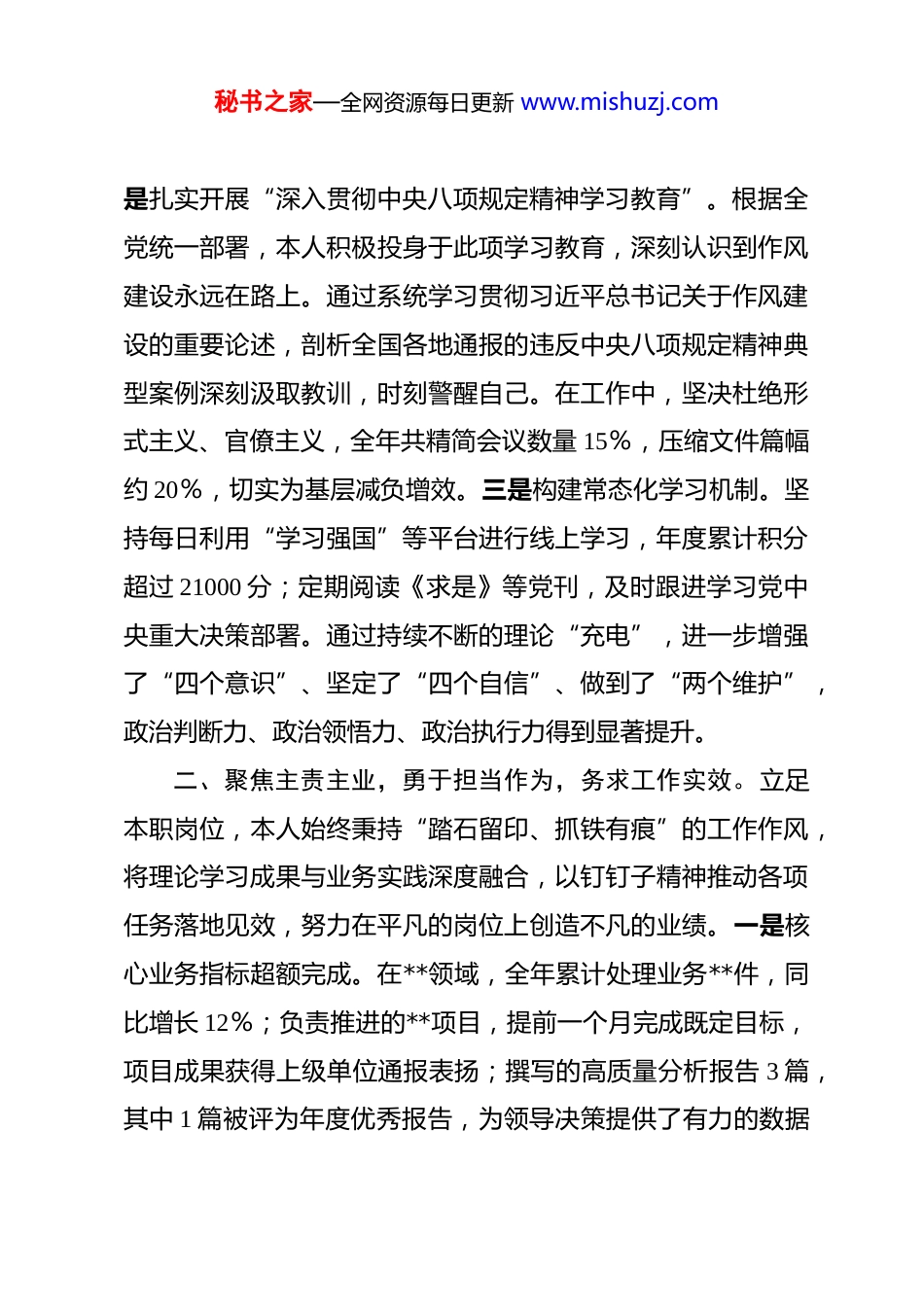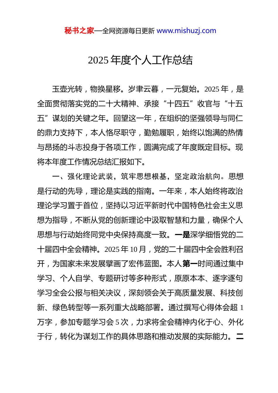 秘书之家—全网资源每日更新 www.mishuzj.com2025 年度个人工作总结 玉壶光转,物换星移。岁聿云暮,一元复始。2025 年,是全面贯彻落实党的二十大精神、承接“十四五”收官与“十五五”谋划的关键之年。回望这一年,在组织的坚强领导与同仁的鼎力支持下,本人恪尽职守,勤勉履职,始终以饱满的热情与昂扬的斗志投身于各项工作,圆满完成了年度既定目标。现将本年度工作情况总结汇报如下。一、强化理论武装,筑牢思想根基,坚定政治航向。思想是行动的先导,理论是实践的指南。一年来,本人始终将政治理论学习置于首位,坚持以习近平新时代中国特色社会主义思想为指导,不断从党的创新理论中汲取智慧和力量,确保个人思想与行动始终同党中央保持高度一致。一是深学细悟党的二十届四中全会精神。2025 年 10 月,党的二十届四中全会胜利召开,为国家未来发展擘画了宏伟蓝图。本人第一时间通过集中学习、个人自学、专题研讨等多种形式,原原本本、逐字逐句学习全会公报与相关决议,深刻领会关于高质量发展、科技创新、绿色转型等一系列重大战略部署。通过撰写心得体会超 1万字,参加专题学习会 5 次,力求将全会精神内化于心、外化于行,转化为谋划工作的具体思路和推动发展的实际能力。二秘书之家—全网资源每日更新 www.mishuzj.com是扎实开展“深入贯彻中央八项规定精神学习教育”。根据全党统一部署,本人积极投身于此项学习教育,深刻认识到作风建设永远在路上。通过系统学习贯彻习近平总书记关于作风建设的重要论述,剖析全国各地通报的违反中央八项规定精神典型案例深刻汲取教训,时刻警醒自己。在工作中,坚决杜绝形式主义、官僚主义,全年共精简会议数量 15%,压缩文件篇幅约 20%,切实为基层减负增效。三是构建常态化学习机制。坚持每日利用“学习强国”等平台进行线上学习,年度累计积分超过 21000 分;定期阅读《求是》等党刊,及时跟进学习党中央重大决策部署。通过持续不断的理论“充电”,进一步增强了“四个意识”、坚定了“四个自信”、做到了“两个维护”,政治判断力、政治领悟力、政治执行力得到显著提升。二、聚焦主责主业,勇于担当作为,务求工作实效。立足本职岗位,本人始终秉持“踏石留印、抓铁有痕”的工作作风,将理论学习成果与业务实践深度融合,以钉钉子精神推动各项任务落地见效,努力在平凡的岗位上创造不凡的业绩。一是核心业务指标超额完成。在**领域,全年累计处理业务**件,同比增长 12%;负责推进的**项目,提前一个月完成既定目标,项目成果获得上级单位通报表扬;撰写的高质量分析报告 3 篇,其中 1 篇被评为年度优秀报告,为领导决策提供了有力的数据秘书之家—全网资源每日更新 www.mishuzj.com支撑和参考依据。这些成绩的取得,得益于对动态绩效指标的精准把握和对业务流程的持续优化。二是创新工作方法提升效能。面对新形势、新任务,主动拥抱变革,积极探索数字化转型路径。本年度,牵头引入并应用了 AI 协同办公工具,将数据处理与分析效率提升了约 30%。同时,借鉴 OKR 与 KPI 相融合的管理模式,设定了更具挑战性与灵活性的工作目标,有效激发了个人潜能,推动工作从“完成”向“卓越”迈进。三是协同作战能力显著增强。深知单丝不成线,独木不成林。在工作中,积极主动与各部门沟通协作,共同推进跨部门重点项目2 个,有效解决了长期存在的协同壁垒问题。通过建立常态化沟通机制,组织跨部门业务研讨会 4 次,不仅促进了信息的互联互通,更营造了团结协作、共谋发展的良好氛围,实现了“1+1》2”的团队效应。三、恪守纪律规矩,锤炼过硬作风,永葆清廉本色。“其身正,不令而行;其身不正,虽令不从。”作为一名党员干部,本人时刻牢记身份与使命,始终将纪律和规矩挺在前面,以严的标准、实的作风要求自己,努力展现新时代干部的良好形象。一是严守政治纪律和政治规矩。在重大原则问题上旗帜鲜明,立场坚定,不折不扣地执行组织的各项决定。在日常言行中,时刻注意自身形象,自觉维护单位的声誉和集体荣誉,做到在秘书之家—全网资源每日更新 www.mishuzj.com思想上、政治上、行动上始终同以...
