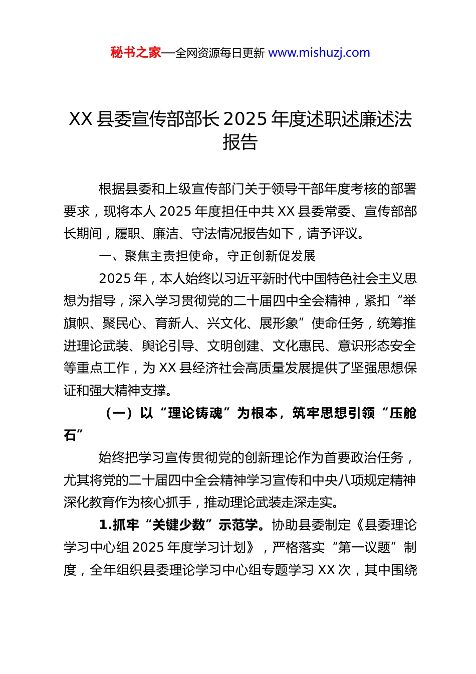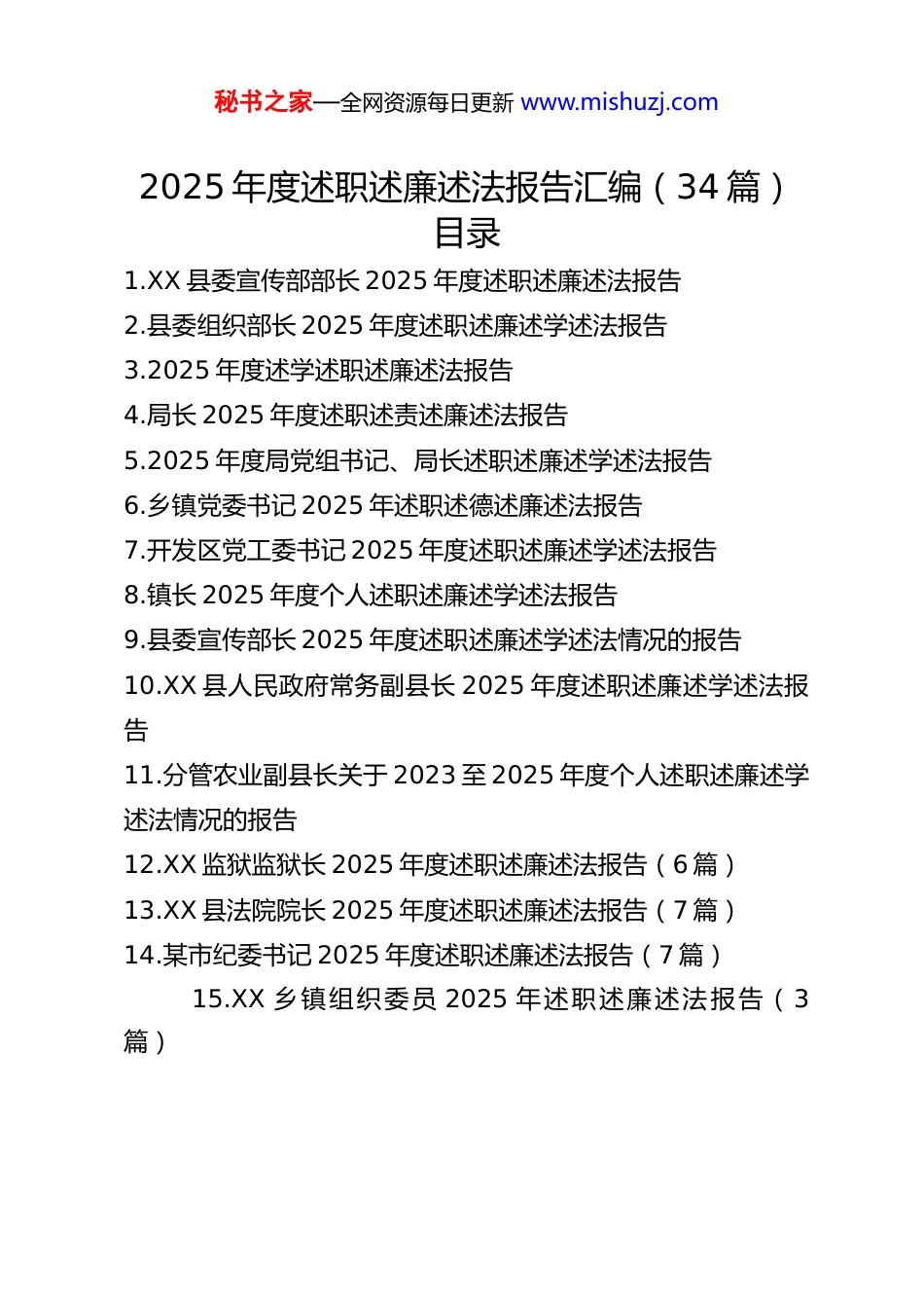 秘书之家—全网资源每日更新 www.mishuzj.com2025 年度述职述廉述法报告汇编(34 篇)目录1.XX 县委宣传部部长 2025 年度述职述廉述法报告2.县委组织部长 2025 年度述职述廉述学述法报告3.2025 年度述学述职述廉述法报告4.局长 2025 年度述职述责述廉述法报告5.2025 年度局党组书记、局长述职述廉述学述法报告6.乡镇党委书记 2025 年述职述德述廉述法报告7.开发区党工委书记 2025 年度述职述廉述学述法报告8.镇长 2025 年度个人述职述廉述学述法报告9.县委宣传部长 2025 年度述职述廉述学述法情况的报告10.XX 县人民政府常务副县长 2025 年度述职述廉述学述法报告11.分管农业副县长关于 2023 至 2025 年度个人述职述廉述学述法情况的报告12.XX 监狱监狱长 2025 年度述职述廉述法报告(6 篇)13.XX 县法院院长 2025 年度述职述廉述法报告(7 篇)14.某市纪委书记 2025 年度述职述廉述法报告(7 篇)15.XX 乡镇组织委员 2025 年述职述廉述法报告(3篇)秘书之家—全网资源每日更新 www.mishuzj.comXX 县委宣传部部长 2025 年度述职述廉述法报告根据县委和上级宣传部门关于领导干部年度考核的部署要求,现将本人 2025 年度担任中共 XX 县委常委、宣传部部长期间,履职、廉洁、守法情况报告如下,请予评议。一、聚焦主责担使命,守正创新促发展2025 年,本人始终以习近平新时代中国特色社会主义思想为指导,深入学习贯彻党的二十届四中全会精神,紧扣“举旗帜、聚民心、育新人、兴文化、展形象”使命任务,统筹推进理论武装、舆论引导、文明创建、文化惠民、意识形态安全等重点工作,为 XX 县经济社会高质量发展提供了坚强思想保证和强大精神支撑。(一)以“理论铸魂”为根本,筑牢思想引领“压舱石”始终把学习宣传贯彻党的创新理论作为首要政治任务,尤其将党的二十届四中全会精神学习宣传和中央八项规定精神深化教育作为核心抓手,推动理论武装走深走实。1.抓牢“关键少数”示范学。协助县委制定《县委理论学习中心组 2025 年度学习计划》,严格落实“第一议题”制度,全年组织县委理论学习中心组专题学习 XX 次,其中围绕秘书之家—全网资源每日更新 www.mishuzj.com党的二十届四中全会精神、中央八项规定精神开展专题研讨 XX次,中心组成员撰写调研报告、理论文章 XX 篇。牵头举办全县科级主要领导干部“学习贯彻二十届四中全会精神”专题读书班 X 期,带动各级党委(党组)开展专题学习 XX 场次,推动领导干部先学一步、深学一层,提升政治判断力、政治领悟力、政治执行力。2.推动“分层宣讲”广泛学。整合“领导干部+专家学者+百姓名嘴+文艺骨干”资源,组建县委宣讲团和 XX 支百姓宣讲队,创新“理论+文艺”“线上+线下”宣讲模式,深入新时代文明实践中心(所、站)、村(社区)、企业、学校开展二十届四中全会精神、中央八项规定精神等主题宣讲 XX 场,覆盖党员干部群众 XX 万人次。编印《二十届四中全会精神解读口袋书》《中央八项规定精神学习手册》X 万余册,用通俗语言讲清政策要义,推动党的创新理论“飞入寻常百姓家”。3.深化“作风教育”常态学。将深入贯彻中央八项规定精神学习教育融入理论武装全过程,组织全县宣传系统开展“转作风、树新风”专题教育活动 XX 次,通过观看警示教育片、剖析违规吃喝典型案例、签订作风建设承诺书等方式,教育引导党员干部深刻认识作风建设的极端重要性,自觉抵制歪风邪气,全年宣传系统未发生违反中央八项规定精神问题。(二)以“舆论聚力”为核心,奏响服务大局“最强音”秘书之家—全网资源每日更新 www.mishuzj.com紧扣县委中心工作,统筹媒体资源,深化媒体融合,提升舆论引导能力,全方位展现 XX 县发展新成效。1.聚焦中心工作精准宣传。围绕“高质量发展”“优化营商环境”“乡村全面振兴”“重大项目建设”等核心主题,策划开展“高质量发展看 XX”“营商环境提质年”等系列宣传战役。全年在中央、省、市级主流媒体刊播重点稿件 XX 篇,其中《XX 县:优化营商环境激活企业发展动能》《XX 古镇:文旅融合绘就乡村振兴新图景》等 XX ...