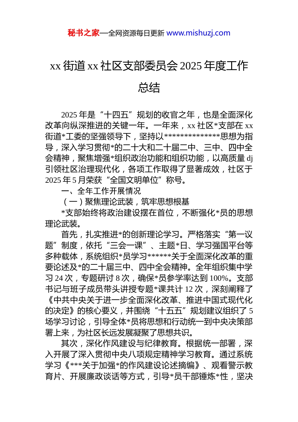 秘书之家—全网资源每日更新 www.mishuzj.comxx 街道 xx 社区支部委员会 2025 年度工作总结2025 年是“十四五”规划的收官之年,也是全面深化改革向纵深推进的关键一年。一年来,xx 社区*支部在 xx街道*工委的坚强领导下,坚持以**************思想为指导,深入学习贯彻*的二十大和二十届二中、三中、四中全会精神,聚焦增强*组织政治功能和组织功能,以高质量 dj引领社区治理现代化,各项工作取得了显著成效,社区于2025 年 5 月荣获“全国文明单位”称号。一、全年工作开展情况(一)聚焦理论武装,筑牢思想根基*支部始终将政治建设摆在首位,不断强化*员的思想理论武装。首先,扎实推进*的创新理论学习。严格落实“第一议题”制度,依托“三会一课”、主题*日、学习强国平台等多种载体,系统组织*员学习******关于全面深化改革的重要论述及*的二十届三中、四中全会精神。全年组织集中学习 24 次,专题研讨 8 次,确保*员参学率达到 100%。支部书记与班子成员带头讲授专题*课共计 12 次,深刻阐释了《中共中央关于进一步全面深化改革、推进中国式现代化的决定》的核心要义,并围绕“十五五”规划建议组织了 5场学习讨论,引导全体*员将思想和行动统一到中央决策部署上来,为社区长远发展凝聚了思想共识。其次,深化作风建设与纪律教育。根据统一部署,深入开展了深入贯彻中央八项规定精神学习教育。通过系统学习《***关于加强*的作风建设论述摘编》、观看警示教育片、开展廉政谈话等方式,引导*员干部锤炼*性,坚决秘书之家—全网资源每日更新 www.mishuzj.com整治形式主义、官僚主义等突出问题。学习教育期间,支部共查摆问题 12 项并已全部完成整改。同时,巩固拓展 zt教育和 dj 学习教育成果,建立常态化学习机制,全年组织《中国共产 dj 律处分条例》等*内法规专题学习 6 次,组织廉政谈话 36 人次,营造了风清气正的政治生态。(二)夯实组织基础,激发队伍活力*支部坚持强基固本,全面提升组织力和战斗力。其一,规范化开展组织生活。严格执行*支部工作条例,确保“三会一课”制度落实到位。全年召开支部*员大会 12次、支委会 24 次、*小组会 48 次,做到时间、人员、内容、效果“四落实”。年中,支部聚焦“四个带头”要求,高质量召开了专题组织生活会,严肃开展批评与自我批评。年底认真完成民主评议*员工作,评选出优秀*员 5 名,并对2 名评议结果为基本合格的*员进行了一对一帮扶教育,有效增强了*员队伍的先进性与纯洁性。其二,加强*员队伍建设与管理。遵循“控制总量、优化结构、提高质量、发挥作用”的总要求,严把*员发展“入口关”,全年发展预备*员 3 名,按期转正 2 名,确定入*积极分子 6 名,新发展*员平均年龄 32 岁,均为大专以上学历,队伍结构持续优化。围绕“四强”*支部创建目标,设立*员责任区和示范岗,全年评选出 8 个“共产*员示范岗”。同时,创新*员教育管理,探索并试行*员志愿服务积分制度,将*员参与志愿服务、组织生活等情况进行量化考核,并将积分结果与年度评优评先挂钩,有效激发了*员的先锋模范作用。其三,创新 dj 活动载体。围绕“争当改革排头兵”等主题,积极与兄弟单位*支部开展“同话改革、共促发展”等联学联建活动 4 次。组织*员赴革命纪念馆开展“重走红色足迹”实践活动 3 次,增强了*员的历史使命感。全年主题*日活动参与率稳定在 98%以上,组织生活吸引力显著提升。秘书之家—全网资源每日更新 www.mishuzj.com(三)深化 dj 引领,提升治理效能*支部坚持以 dj 引领社区各项事业发展,着力破解民生难题,提升居民幸福感。一是创新基层协商民主机制。持续深化“和睦红”dj品牌建设,充分发挥“红茶议事会”、“和睦议事港”等协商议事平台作用。据统计,“红茶议事会”近年来已累计召开超过 230 场,成功化解了包括老旧小区保笼拆除、停车位规划、环境整治等在内的 200 余个治理难题。在议事员队伍中,*员占比接近 48%,充分发挥了*员在社区协商中的骨干作用,推动了“民事民议、民事民办”的良好局面。二是聚焦民生实事项目攻坚。特别是在老旧小区改...