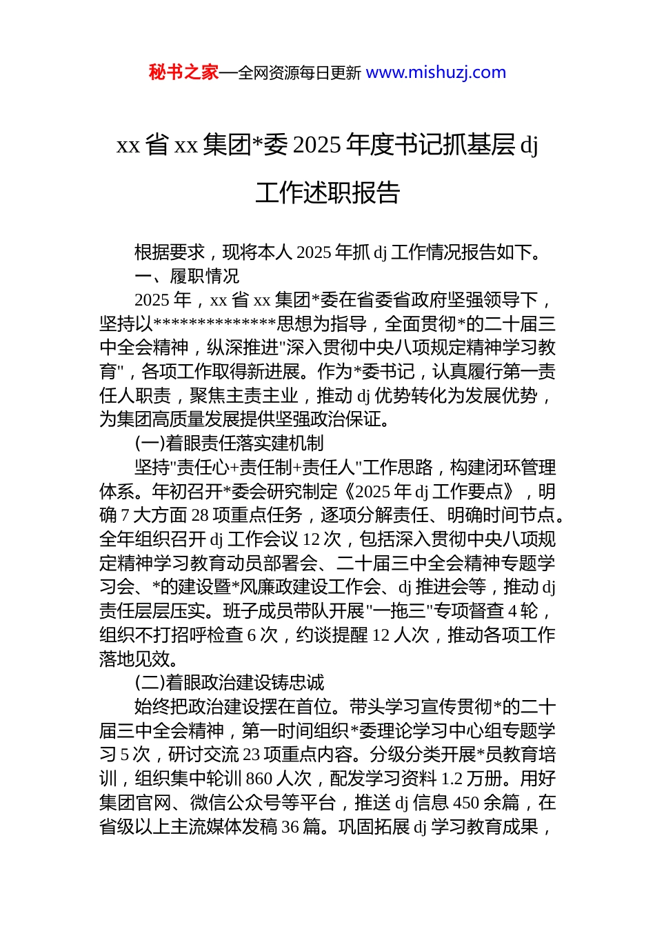 秘书之家—全网资源每日更新 www.mishuzj.comxx 省 xx 集团*委 2025 年度书记抓基层 dj工作述职报告根据要求,现将本人 2025 年抓 dj 工作情况报告如下。一、履职情况2025 年,xx 省 xx 集团*委在省委省政府坚强领导下,坚持以**************思想为指导,全面贯彻*的二十届三中全会精神,纵深推进"深入贯彻中央八项规定精神学习教育",各项工作取得新进展。作为*委书记,认真履行第一责任人职责,聚焦主责主业,推动 dj 优势转化为发展优势,为集团高质量发展提供坚强政治保证。(一)着眼责任落实建机制坚持"责任心+责任制+责任人"工作思路,构建闭环管理体系。年初召开*委会研究制定《2025 年 dj 工作要点》,明确 7 大方面 28 项重点任务,逐项分解责任、明确时间节点。全年组织召开 dj 工作会议 12 次,包括深入贯彻中央八项规定精神学习教育动员部署会、二十届三中全会精神专题学习会、*的建设暨*风廉政建设工作会、dj 推进会等,推动 dj责任层层压实。班子成员带队开展"一拖三"专项督查 4 轮,组织不打招呼检查 6 次,约谈提醒 12 人次,推动各项工作落地见效。(二)着眼政治建设铸忠诚始终把政治建设摆在首位。带头学习宣传贯彻*的二十届三中全会精神,第一时间组织*委理论学习中心组专题学习 5 次,研讨交流 23 项重点内容。分级分类开展*员教育培训,组织集中轮训 860 人次,配发学习资料 1.2 万册。用好集团官网、微信公众号等平台,推送 dj 信息 450 余篇,在省级以上主流媒体发稿 36 篇。巩固拓展 dj 学习教育成果,秘书之家—全网资源每日更新 www.mishuzj.com组织警示教育大会 3 场,观看警示教育片 5 部,通报典型案例 15 起。召开专题民主生活会 2 次,开展"三查三问"专项行动,查摆整改问题 38 个。完善信访工作机制,制定《信访工作管理办法》,全年排查化解矛盾纠纷 23 起,未发生重大信访事件。(三)着眼基层基础强组织推进*组织标准化规范化建设,完成 8 个方面标准化验收工作。严格落实"四同步"要求,动态优化*组织设置,集团*委下辖二级*委 24 个、*总支 38 个、*支部 185 个,*员总数 5280 名,实现应建尽建。狠抓"三会一课"制度落实,全年开展达标考核,达标率 96.3%,记录规范率提升至94.7%。组织学习《中国共产*支部工作条例(试行)》专题培训 4 期,培训*务干部和*支部书记 520 人次。创新 dj 工作载体,开展线上答题竞赛,参与*员达 4200 人次。组织*员集中收看重大活动直播,受教育*员 5000 余人次。发展*员120 名,其中 35 岁以下青年*员占比 65%。(四)着眼服务中心促融合充分发挥*委"把方向、管大局、保落实"作用。修订完善*委会议事规则,制定"三重一大"决策制度实施细则,全年召开*委会 28 次,研究重大事项 156 项。坚持*管干部*管人才,调整配备中层管理人员 45 人,交流轮岗 32 人,实施竞争上岗 8 人,末等调整不胜任退出 5 人。创建"xx 先锋"dj品牌,选树示范*组织 15 个、*员示范岗 120 个、*员先锋队25 支。推动 dj 与生产经营深度融合,设立*员攻关项目 60个,解决技术难题 23 项。截至 2025 年 11 月末,集团资产总额达 xx 亿元,同比增长 4.2%,实现营业收入 xx 亿元,同比增长 28.5%,利润总额 xx 亿元,同比增长 52.8%,超额完成年度目标任务。(五)着眼正风肃纪守底线组织召开*风廉政建设和反腐败工作会议 2 次,签订《*风廉政建设责任书》185 份,建立月度报告制度,全年报送秘书之家—全网资源每日更新 www.mishuzj.com情况 12 期。紧盯重要节点开展监督检查 16 次,查处违反中央八项规定精神问题 3 起,处理 5 人。开展作风建设专项整治,排查整改形式主义、官僚主义问题 18 个。邀请省纪委专家解读纪律处分条例 2 次,组织纪法知识测试 2 轮,参与率达 100%。完成中央巡视整改"回头看",开展"十个专项治理",整改完成率 98.5%。运用监督执纪"四种形态",批评教育帮助和处理 32 人次,其中 dj 处分 8 人。二、存在的主要问题一是少数基层*组织战斗堡垒作用发挥不充分。个...