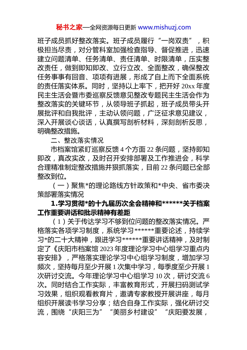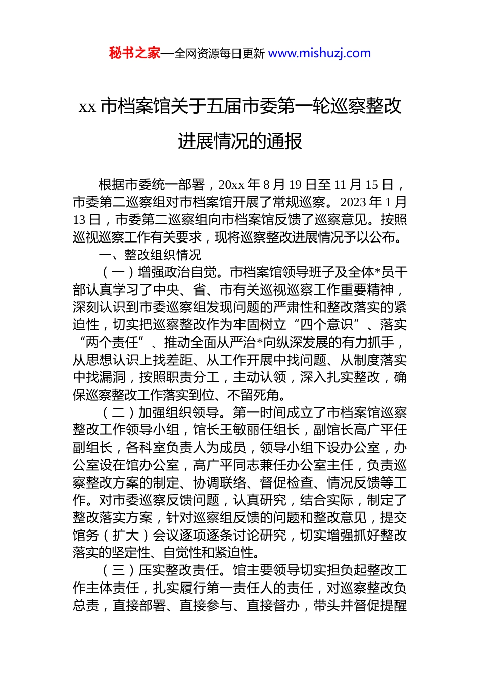 秘书之家—全网资源每日更新 www.mishuzj.comxx 市档案馆关于五届市委第一轮巡察整改进展情况的通报根据市委统一部署,20xx 年 8 月 19 日至 11 月 15 日,市委第二巡察组对市档案馆开展了常规巡察。2023 年 1 月13 日,市委第二巡察组向市档案馆反馈了巡察意见。按照巡视巡察工作有关要求,现将巡察整改进展情况予以公布。一、整改组织情况(一)增强政治自觉。市档案馆领导班子及全体*员干部认真学习了中央、省、市有关巡视巡察工作重要精神,深刻认识到市委巡察组发现问题的严肃性和整改落实的紧迫性,切实把巡察整改作为牢固树立“四个意识”、落实“两个责任”、推动全面从严治*向纵深发展的有力抓手,从思想认识上找差距、从工作开展中找问题、从制度落实中找漏洞,按照职责分工,主动认领,深入扎实整改,确保巡察整改工作落实到位、不留死角。(二)加强组织领导。第一时间成立了市档案馆巡察整改工作领导小组,馆长王敏丽任组长,副馆长高广平任副组长,各科室负责人为成员,领导小组下设办公室,办公室设在馆办公室,高广平同志兼任办公室主任,负责巡察整改方案的制定、协调联络、督促检查、情况反馈等工作。对市委巡察反馈问题,认真研究,结合实际,制定了整改落实方案,针对巡察组反馈的问题和整改意见,提交馆务(扩大)会议逐项逐条讨论研究,切实增强抓好整改落实的坚定性、自觉性和紧迫性。(三)压实整改责任。馆主要领导切实担负起整改工作主体责任,扎实履行第一责任人的责任,对巡察整改负总责,直接部署、直接参与、直接督办,带头并督促提醒秘书之家—全网资源每日更新 www.mishuzj.com班子成员抓好整改落实。班子成员履行“一岗双责”,积极担当尽责,对分管科室加强检查指导、督促推进,迅速建立问题清单、任务清单、责任清单、时限清单,压实整改责任,做到即知即改、立行立改、全面整改,确保整改任务事事有回音、项项有进展,形成了自上而下全面系统的责任落实体系。同时,坚持以上率下,把开好 20xx 年度民主生活会暨市委巡察反馈意见整改专题民主生活会作为整改落实的关键环节,从领导班子抓起,班子成员带头开展批评和自我批评,主动认领问题,广泛征求意见建议,深入开展谈心谈话,认真撰写剖析材料,深刻剖析反思,明确整改措施。二、整改落实情况市档案馆紧盯巡察反馈 4 个方面 22 条问题,坚持即知即改,真改实改,及时召开安排部署及工作推进会,科学合理精准制定整改措施并狠抓落实,目前 22 条问题已全部整改到位。(一)聚焦*的理论路线方针政策和*中央、省市委决策部署落实情况1.学习贯彻*的十九届历次全会精神和******关于档案工作重要讲话和批示精神有差距(1)关于传达学习不够到位问题的整改落实情况。严格落实各项学习制度,系统学习******重要论述,持续学习*的二十大精神,跟进学习******重要讲话精神,及时制定了《庆阳市档案馆 2023 年度理论学习中心组学习重点内容安排》,严格落实理论学习中心组学习制度,增加学习频次,坚持每月至少开展 1 次集中学习,每季度至少开展 1次研讨交流。今年理论学习中心组学习 10 次,研讨交流 6次。同时结合工作实际,丰富教育形式,开展扫码测试学习效果,组织观看教育片,邀请专家教授开展讲座,每月组织开展读书学习分享;结合自身工作实际,强化研讨交流,围绕“庆阳三为”“美丽乡村建设”“庆阳要发展,秘书之家—全网资源每日更新 www.mishuzj.com我该谋什么”等主题深入研讨。截至目前,开展*员学习活动 27 场次,业务互训 8 场次,读书分享 8 场次。*员学习成效得到了深化,有效指导工作开展。(2)关于学用结合不够紧密相关问题的整改落实情况。一是加快档案鉴定开放工作。20xx 年 6 月以市委办(市档案局)文件印发《庆阳市档案馆馆藏档案到期拟开放档案鉴定工作实施方案》,要求 20xx 年-2025 年分四个批次完成馆藏档案鉴定开放。至目前已完成馆藏 23 个全宗,7349 卷、66374 件开放档案的初审、复审及目录公开工作。二是解读分享馆藏珍贵档案。对馆藏珍贵档案进行解读并通过网站公众号等向社会公布。已解读 38 份馆藏重点珍...
