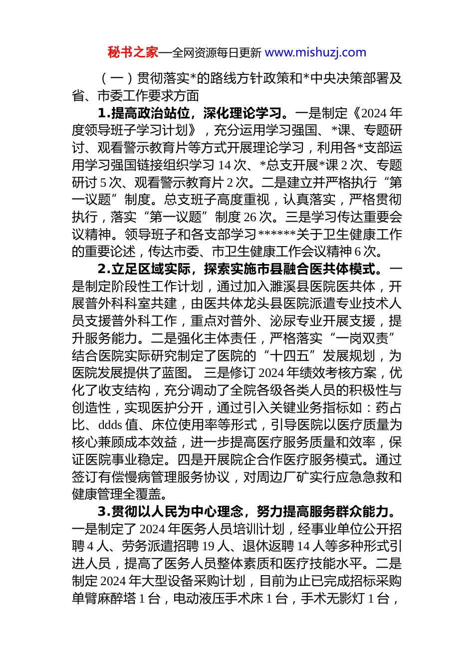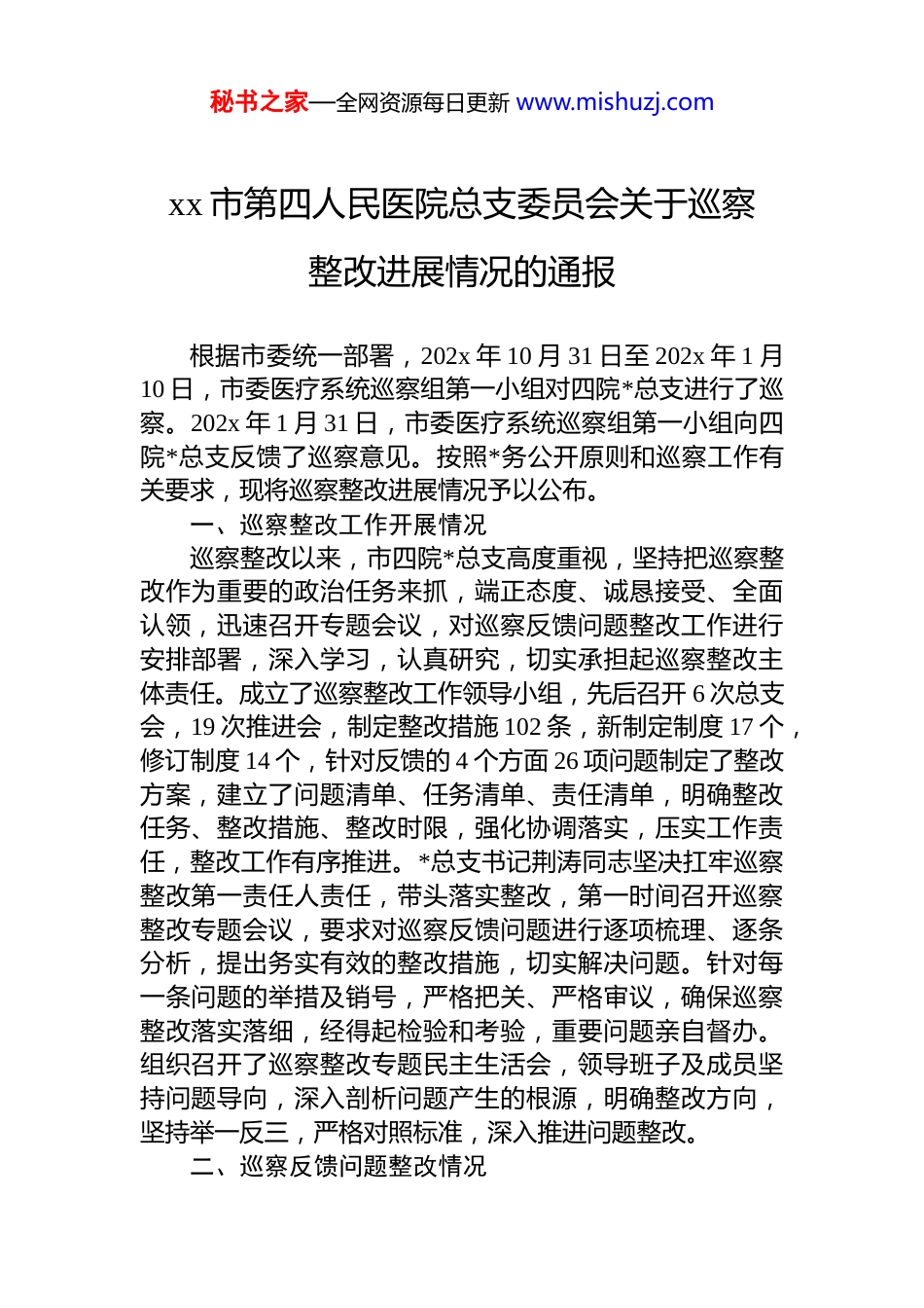 秘书之家—全网资源每日更新 www.mishuzj.comxx 市第四人民医院总支委员会关于巡察整改进展情况的通报根据市委统一部署,202x 年 10 月 31 日至 202x 年 1 月10 日,市委医疗系统巡察组第一小组对四院*总支进行了巡察。202x 年 1 月 31 日,市委医疗系统巡察组第一小组向四院*总支反馈了巡察意见。按照*务公开原则和巡察工作有关要求,现将巡察整改进展情况予以公布。一、巡察整改工作开展情况巡察整改以来,市四院*总支高度重视,坚持把巡察整改作为重要的政治任务来抓,端正态度、诚恳接受、全面认领,迅速召开专题会议,对巡察反馈问题整改工作进行安排部署,深入学习,认真研究,切实承担起巡察整改主体责任。成立了巡察整改工作领导小组,先后召开 6 次总支会,19 次推进会,制定整改措施 102 条,新制定制度 17 个,修订制度 14 个,针对反馈的 4 个方面 26 项问题制定了整改方案,建立了问题清单、任务清单、责任清单,明确整改任务、整改措施、整改时限,强化协调落实,压实工作责任,整改工作有序推进。*总支书记荆涛同志坚决扛牢巡察整改第一责任人责任,带头落实整改,第一时间召开巡察整改专题会议,要求对巡察反馈问题进行逐项梳理、逐条分析,提出务实有效的整改措施,切实解决问题。针对每一条问题的举措及销号,严格把关、严格审议,确保巡察整改落实落细,经得起检验和考验,重要问题亲自督办。组织召开了巡察整改专题民主生活会,领导班子及成员坚持问题导向,深入剖析问题产生的根源,明确整改方向,坚持举一反三,严格对照标准,深入推进问题整改。二、巡察反馈问题整改情况秘书之家—全网资源每日更新 www.mishuzj.com(一)贯彻落实*的路线方针政策和*中央决策部署及省、市委工作要求方面1.提高政治站位,深化理论学习。一是制定《2024 年度领导班子学习计划》,充分运用学习强国、*课、专题研讨、观看警示教育片等方式开展理论学习,利用各*支部运用学习强国链接组织学习 14 次、*总支开展*课 2 次、专题研讨 5 次、观看警示教育片 2 次。二是建立并严格执行“第一议题”制度。总支班子高度重视,认真落实,严格贯彻执行,落实“第一议题”制度 26 次。三是学习传达重要会议精神。领导班子和各支部学习******关于卫生健康工作的重要论述,传达市委、市卫生健康工作会议精神 6 次。2.立足区域实际,探索实施市县融合医共体模式。一是制定阶段性工作计划,通过加入濉溪县医院医共体,开展普外科科室共建,由医共体龙头县医院派遣专业技术人员支援普外科工作,重点对普外、泌尿专业开展支援,提升服务能力。二是强化主体责任,严格落实“一岗双责”结合医院实际研究制定了医院的“十四五”发展规划,为医院发展提供了蓝图。 三是修订 2024 年绩效考核方案,优化了收支结构,充分调动了全院各级各类人员的积极性与创造性,实现医护分开,通过引入关键业务指标如:药占比、ddds 值、床位使用率等形式,引导医院以医疗质量为核心兼顾成本效益,进一步提高医疗服务质量和效率,保证医院事业稳定。四是开展院企合作医疗服务模式。通过签订有偿慢病管理服务协议,对周边厂矿实行应急急救和健康管理全覆盖。3.贯彻以人民为中心理念,努力提高服务群众能力。一是制定了 2024 年医务人员培训计划,经事业单位公开招聘 4 人、劳务派遣招聘 19 人、退休返聘 14 人等多种形式引进人员,提高了医务人员整体素质和医疗技能水平。二是制定 2024 年大型设备采购计划,目前为止已完成招标采购单臂麻醉塔 1 台,电动液压手术床 1 台,手术无影灯 1 台,秘书之家—全网资源每日更新 www.mishuzj.com手术室平板 c 型臂 1 台。三是与淮北市妇幼保健院签订“淮北市产儿科专科联盟”合作协议,开展对口支援,妇幼保健院儿科专家来我院坐诊 1 次,就病例分析、诊断和治疗等方面给予指导意见,提升儿科服务水平。四是与濉溪县医院儿二科签订了医共体协议,在我院儿科门诊共建儿科工作室,县医院儿二科专家每周定期到我院坐诊。五是我院与淮北市人民医院签订医联体合作协议,邀请人民医院五官科专家坐诊 1 次...
