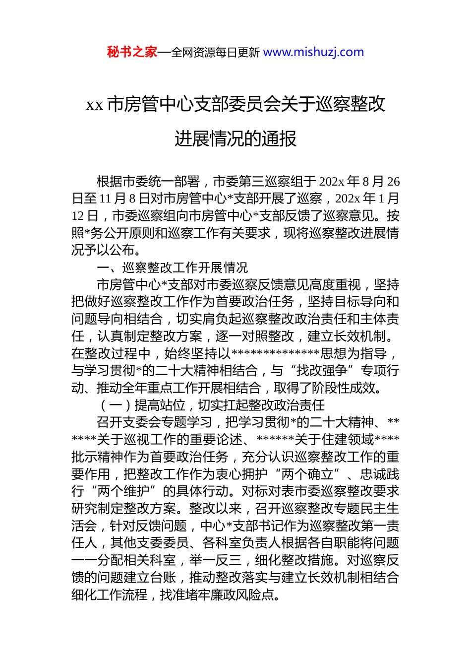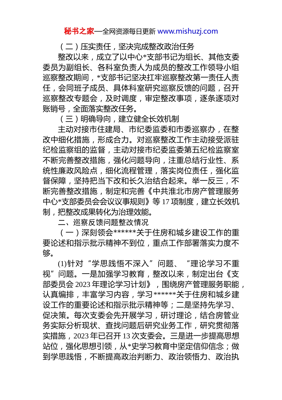 秘书之家—全网资源每日更新 www.mishuzj.comxx 市房管中心支部委员会关于巡察整改进展情况的通报根据市委统一部署,市委第三巡察组于 202x 年 8 月 26日至 11 月 8 日对市房管中心*支部开展了巡察,202x 年 1 月12 日,市委巡察组向市房管中心*支部反馈了巡察意见。按照*务公开原则和巡察工作有关要求,现将巡察整改进展情况予以公布。一、巡察整改工作开展情况市房管中心*支部对市委巡察反馈意见高度重视,坚持把做好巡察整改工作作为首要政治任务,坚持目标导向和问题导向相结合,切实肩负起巡察整改政治责任和主体责任,认真制定整改方案,逐一对照整改,建立长效机制。在整改过程中,始终坚持以**************思想为指导,与学习贯彻*的二十大精神相结合,与“找改强争”专项行动、推动全年重点工作开展相结合,取得了阶段性成效。(一)提高站位,切实扛起整改政治责任召开支委会专题学习,把学习贯彻*的二十大精神、******关于巡视工作的重要论述、******关于住建领域****批示精神作为首要政治任务,充分认识巡察整改工作的重要作用,把整改工作作为衷心拥护“两个确立”、忠诚践行“两个维护”的具体行动。对标对表市委巡察整改要求研究制定整改方案。整改以来,召开巡察整改专题民主生活会,针对反馈问题,中心*支部书记作为巡察整改第一责任人,其他支委委员、各科室负责人根据各自职能将问题一一分配相关科室,举一反三,细化整改措施。对巡察反馈的问题建立台账,推动整改落实与建立长效机制相结合细化工作流程,找准堵牢廉政风险点。秘书之家—全网资源每日更新 www.mishuzj.com(二)压实责任,坚决完成整改政治任务整改以来,成立了以中心*支部书记为组长、其他支委委员为副组长、各科室负责人为成员的整改工作领导小组巡察整改期间,*支部书记坚决扛牢巡察整改第一责任人责任,会同班子成员、具体科室研究巡察反馈的问题,召开巡察整改专题会,及时调度,审定整改事项,逐条逐项对账销号,全面落实整改任务。(三)明确导向,建立健全长效机制主动对接市住建局、市纪委监委和市委巡察办,在整改中细化措施,形成合力。对巡察整改工作主动接受派驻纪检监察组的监督,主动对接市纪委监委第五纪检监察室不断完善整改措施,强化问题导向,注重总结行业性、系统性廉政风险点,细化流程管理,落实岗位责任,强化监督保障,坚持把当下改和长久治结合起来。举一反三,不断完善整改措施,制定和完善《中共淮北市房产管理服务中心*支部委员会会议议事规则》等 17 项制度,建立长效机制,把整改成果转化为治理效能。二、巡察反馈问题整改情况(一)深刻领会******关于住房和城乡建设工作的重要论述和指示批示精神不到位,重点工作部署落实力度不够。(1)针对“学思践悟不深入”问题、“理论学习不重视”问题。一是加强学习教育,整改以来,制定出台《支部委员会 2023 年理论学习计划》,围绕房产管理服务职能,认真编排,丰富学习内容,学习******关于住房和城乡建设工作的重要论述和指示批示精神等;二是坚持先学习、促决策。每次支委会先开展学习,研讨理论,结合房管业务实际分析现状、查找问题后研究业务工作,研究贯彻落实措施,2023 年已召开 13 次支委会。三是进一步提高思想站位,强化思想引领,从*史学习教育中坚定信仰信念;做到学思践悟,不断提高政治判断力、政治领悟力、政治执秘书之家—全网资源每日更新 www.mishuzj.com行力,深刻领悟'两个确立'的决定性意义,切实增强“四个意识”、坚定“四个自信”、做到“两个维护”。(2)针对“议事决策不规范”问题、“末位表态制度落实不到位”问题。一是全面贯彻执行*的民主集中制,完善和健全集体领导制度,提高科学决策、民主决策、依法决策水平;二是整改以来,制定《市房管中心会议议事规则》。严格按照议事规则解决问题,坚决杜绝以主任办公会代替支委会作决策,严格执行末位表态制。议事范围包括重大决策、重要人事任免、重大项目安排、大额资金使用等事项。按照议题审定、材料准备、会议讨论、民主表决、作出决定的程序进行议事。(3)针对“对房地产业发展科学谋划不足”问题。一是提高...