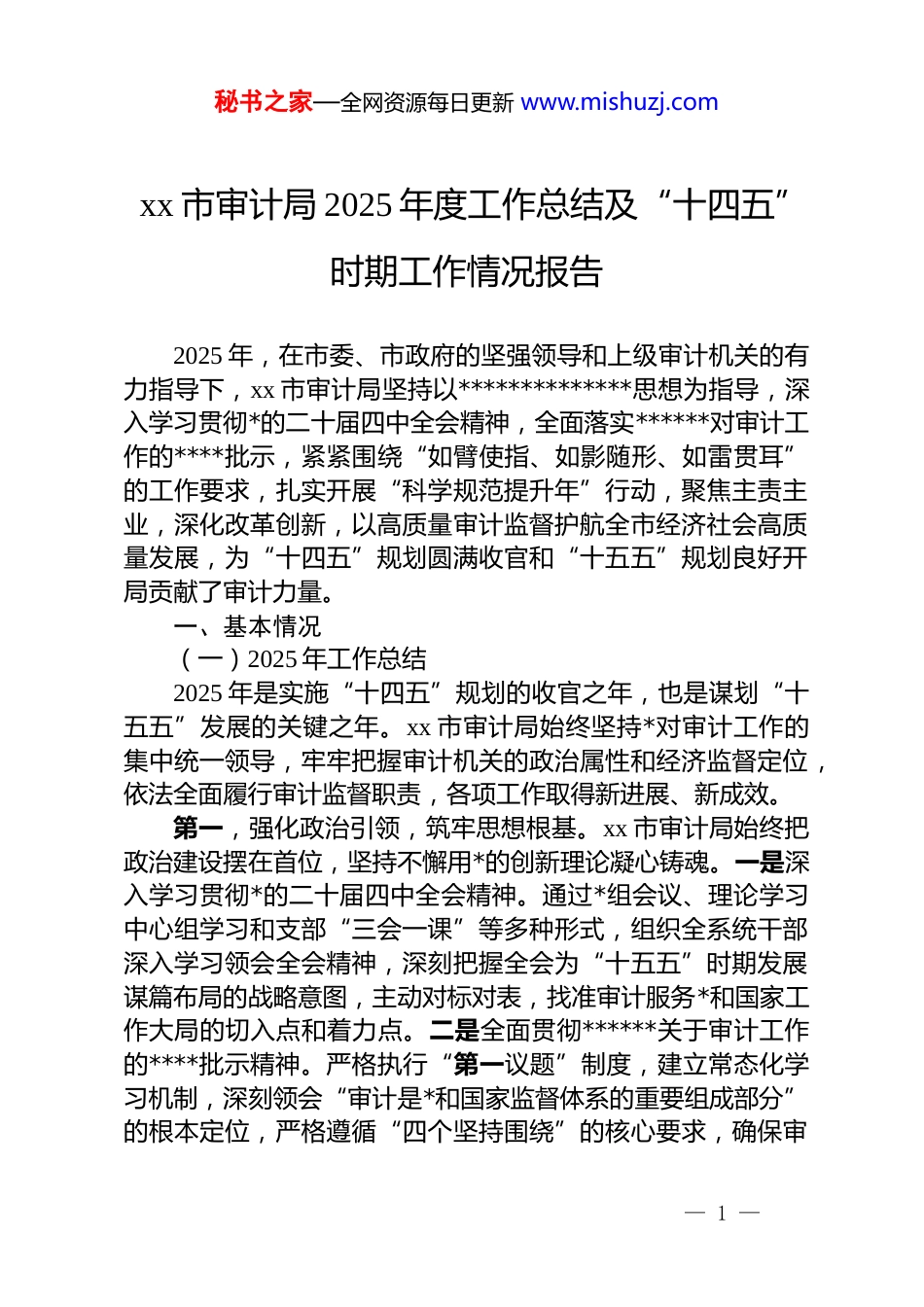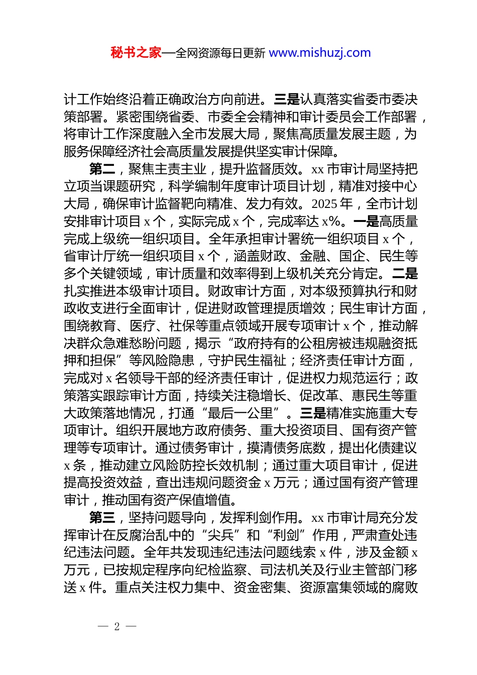 秘书之家—全网资源每日更新 www.mishuzj.comxx 市审计局 2025 年度工作总结及“十四五”时期工作情况报告2025 年,在市委、市政府的坚强领导和上级审计机关的有力指导下,xx 市审计局坚持以**************思想为指导,深入学习贯彻*的二十届四中全会精神,全面落实******对审计工作的****批示,紧紧围绕“如臂使指、如影随形、如雷贯耳”的工作要求,扎实开展“科学规范提升年”行动,聚焦主责主业,深化改革创新,以高质量审计监督护航全市经济社会高质量发展,为“十四五”规划圆满收官和“十五五”规划良好开局贡献了审计力量。一、基本情况(一)2025 年工作总结2025 年是实施“十四五”规划的收官之年,也是谋划“十五五”发展的关键之年。xx 市审计局始终坚持*对审计工作的集中统一领导,牢牢把握审计机关的政治属性和经济监督定位,依法全面履行审计监督职责,各项工作取得新进展、新成效。第一,强化政治引领,筑牢思想根基。xx 市审计局始终把政治建设摆在首位,坚持不懈用*的创新理论凝心铸魂。一是深入学习贯彻*的二十届四中全会精神。通过*组会议、理论学习中心组学习和支部“三会一课”等多种形式,组织全系统干部深入学习领会全会精神,深刻把握全会为“十五五”时期发展谋篇布局的战略意图,主动对标对表,找准审计服务*和国家工作大局的切入点和着力点。二是全面贯彻******关于审计工作的****批示精神。严格执行“第一议题”制度,建立常态化学习机制,深刻领会“审计是*和国家监督体系的重要组成部分”的根本定位,严格遵循“四个坚持围绕”的核心要求,确保审— 1 —秘书之家—全网资源每日更新 www.mishuzj.com计工作始终沿着正确政治方向前进。三是认真落实省委市委决策部署。紧密围绕省委、市委全会精神和审计委员会工作部署,将审计工作深度融入全市发展大局,聚焦高质量发展主题,为服务保障经济社会高质量发展提供坚实审计保障。第二,聚焦主责主业,提升监督质效。xx 市审计局坚持把立项当课题研究,科学编制年度审计项目计划,精准对接中心大局,确保审计监督靶向精准、发力有效。2025 年,全市计划安排审计项目 x 个,实际完成 x 个,完成率达 x%。一是高质量完成上级统一组织项目。全年承担审计署统一组织项目 x 个,省审计厅统一组织项目 x 个,涵盖财政、金融、国企、民生等多个关键领域,审计质量和效率得到上级机关充分肯定。二是扎实推进本级审计项目。财政审计方面,对本级预算执行和财政收支进行全面审计,促进财政管理提质增效;民生审计方面,围绕教育、医疗、社保等重点领域开展专项审计 x 个,推动解决群众急难愁盼问题,揭示“政府持有的公租房被违规融资抵押和担保”等风险隐患,守护民生福祉;经济责任审计方面,完成对 x 名领导干部的经济责任审计,促进权力规范运行;政策落实跟踪审计方面,持续关注稳增长、促改革、惠民生等重大政策落地情况,打通“最后一公里”。三是精准实施重大专项审计。组织开展地方政府债务、重大投资项目、国有资产管理等专项审计。通过债务审计,摸清债务底数,提出化债建议x 条,推动建立风险防控长效机制;通过重大项目审计,促进提高投资效益,查出违规问题资金 x 万元;通过国有资产管理审计,推动国有资产保值增值。第三,坚持问题导向,发挥利剑作用。xx 市审计局充分发挥审计在反腐治乱中的“尖兵”和“利剑”作用,严肃查处违纪违法问题。全年共发现违纪违法问题线索 x 件,涉及金额 x万元,已按规定程序向纪检监察、司法机关及行业主管部门移送 x 件。重点关注权力集中、资金密集、资源富集领域的腐败— 2 —秘书之家—全网资源每日更新 www.mishuzj.com问题,严肃查处群众身边的“蝇贪蚁腐”。建立移送线索台账,加强跟踪督办,截至目前,已办结 x 件,立案 x 件,给予 dj 政务处分 x 人,移送司法机关 x 人。第四,抓实审计整改,做好“后半篇文章”。xx 市审计局高度重视审计整改工作,着力构建“审计—整改—规范”的工作闭环。建立全面整改、专项整改、重点督办相结合的立体化工作机制,压实被审计单位整改主体责任和主管部门监督管理...