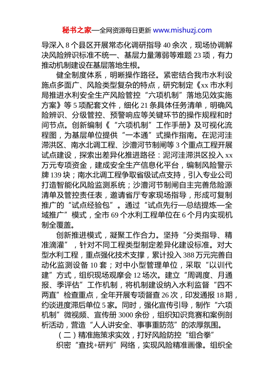 秘书之家—全网资源每日更新 www.mishuzj.comxx 市水利局“六项机制”建设任务完成情况工作总结为深入贯彻落实******关于安全生产的重要论述精神,牢固树立“人民至上、生命至上”理念,xx 市水利局坚决扛起水利安全生产政治责任,将水利安全生产风险管控“六项机制”(即风险查找、研判、预警、防范、处置、责任机制)建设作为筑牢水利安全防线的核心抓手,以“时时放心不下”的责任感,系统谋划、精准发力、务求实效。自任务启动以来,全局上下协同联动、攻坚克难,高标准完成各项建设任务,水利安全风险防控能力显著提升,为全市水利事业高质量发展提供了坚实保障。现将“六项机制”建设任务完成情况总结如下:一、工作情况我局始终将“六项机制”建设作为“一把手”工程和年度重点工作,坚持高位统筹、试点先行、闭环管理,推动机制建设从“有形覆盖”向“有效运行”深度转变,实现了水利安全生产风险管控的系统化、标准化、精准化。(一)高位推动强保障,筑牢机制建设“压舱石”强化组织领导,压实责任链条。局*组切实履行主体责任,成立由*组书记、局长任组长,8 名县级领导干部分任副组长,相关科室及直属单位负责人为成员的专项工作专班,构建起“主要领导亲自抓、分管领导具体抓、业务科室协同抓”的立体化责任体系。先后召开*组专题会议 5 次、全局推进会 8 次,系统研究部署机制建设路径,动态解决难点堵点问题。将“六项机制”建设纳入年度目标考核和领导干部述职评议内容,实行“一票否决”制,确保责任压力层层传导。建立县级领导干部分包县区制度,8 名县级领秘书之家—全网资源每日更新 www.mishuzj.com导深入 8 个县区开展常态化调研指导 40 余次,现场协调解决风险辨识标准不统一、基层力量薄弱等难题 23 项,有力推动机制建设在基层落地生根。健全制度体系,明晰操作路径。紧密结合我市水利设施点多面广、风险类型复杂的特点,研究制定《xx 市水利局推进水利安全生产风险管控“六项机制”落地见效实施方案》等 5 项配套文件,细化 21 条具体任务清单,明确风险辨识、分级管控、预警响应等关键环节的操作规程和时间节点。创新编制《“六项机制”工作手册》及可视化流程图,为基层单位提供“一本通”式操作指南。在泥河洼滞洪区、南水北调工程、沙澧河节制闸等 3 个重点工程开展试点建设,探索出差异化推进路径:泥河洼滞洪区投入 xx万元专项资金,建成安全生产信息化平台,编制风险警示牌 139 块;南水北调工程争取省级试点支持,引入专业公司打造智能化风险监测系统;沙澧河节制闸自主完善危险源清单及管控责任表,邀请省厅专家现场指导,形成可复制推广的“试点经验包”。通过“试点先行—总结提炼—全域推广”模式,全市 69 个水利工程单位在 6 个月内实现机制全覆盖。创新推进模式,凝聚工作合力。坚持“分类指导、精准滴灌”,针对不同工程类型制定差异化建设标准。对大型水利工程,重点强化技术支撑,累计投入 388 万元完善自动化监测设备 10 套;对中小型管理单位,采取“以训代建”方式,组织现场观摩会 12 场次。建立“周调度、月通报、季评估”工作机制,将机制建设纳入水利监督“四不两直”检查重点,全年开展专项督查 26 次,印发通报 18 期,约谈进度滞后单位 5 家。同时,强化宣传引导,制作“六项机制”微视频、宣传册 3000 余份,组织知识竞赛和案例剖析活动,营造“人人讲安全、事事重防范”的浓厚氛围。(二)精准施策求实效,打好风险防控“组合拳”织密“查找+研判”网络,实现风险精准画像。组织全秘书之家—全网资源每日更新 www.mishuzj.com市水利系统专业力量,对 69 个水闸、堤防、泵站、在建工程等开展拉网式、动态化风险辨识,累计识别一般危险源552 个、重大危险源 138 个,建立“一工程一档案”数据库。创新实施“专家会诊+智能分析”双轨研判模式:一方面组建由省厅专家、技术骨干构成的 15 人研判团队,对重大风险源进行四色分级(红、橙、黄、蓝),确保分级科学精准;另一方面依托信息化平台,运用大数据分析技术,对风险演变趋势进行动态预测。通过机制运行,风险管控...