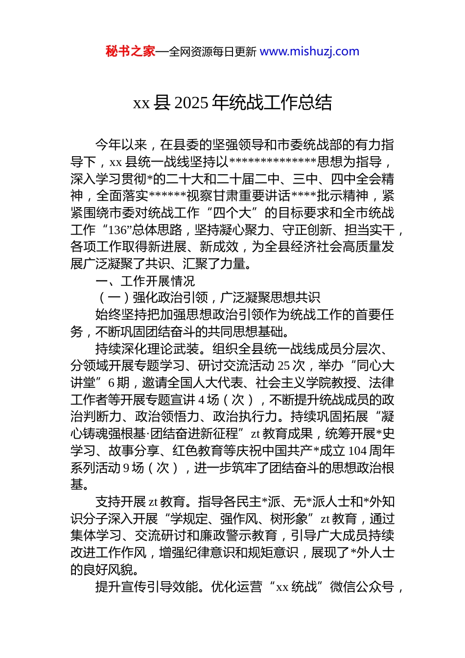 秘书之家—全网资源每日更新 www.mishuzj.comxx 县 2025 年统战工作总结今年以来,在县委的坚强领导和市委统战部的有力指导下,xx 县统一战线坚持以**************思想为指导,深入学习贯彻*的二十大和二十届二中、三中、四中全会精神,全面落实******视察甘肃重要讲话****批示精神,紧紧围绕市委对统战工作“四个大”的目标要求和全市统战工作“136”总体思路,坚持凝心聚力、守正创新、担当实干,各项工作取得新进展、新成效,为全县经济社会高质量发展广泛凝聚了共识、汇聚了力量。一、工作开展情况(一)强化政治引领,广泛凝聚思想共识始终坚持把加强思想政治引领作为统战工作的首要任务,不断巩固团结奋斗的共同思想基础。持续深化理论武装。组织全县统一战线成员分层次、分领域开展专题学习、研讨交流活动 25 次,举办“同心大讲堂”6 期,邀请全国人大代表、社会主义学院教授、法律工作者等开展专题宣讲 4 场(次),不断提升统战成员的政治判断力、政治领悟力、政治执行力。持续巩固拓展“凝心铸魂强根基·团结奋进新征程”zt 教育成果,统筹开展*史学习、故事分享、红色教育等庆祝中国共产*成立 104 周年系列活动 9 场(次),进一步筑牢了团结奋斗的思想政治根基。支持开展 zt 教育。指导各民主*派、无*派人士和*外知识分子深入开展“学规定、强作风、树形象”zt 教育,通过集体学习、交流研讨和廉政警示教育,引导广大成员持续改进工作作风,增强纪律意识和规矩意识,展现了*外人士的良好风貌。提升宣传引导效能。优化运营“xx 统战”微信公众号,秘书之家—全网资源每日更新 www.mishuzj.com开设“统战风采”“统战史话”等专题专栏,发布统战成员先进典型事迹 4 期,刊发“统战史话”3 期、“***讲过的民族团结故事”18 期。累计转发推送上级统战政策、理论知识 249 篇(条),发布本地统战工作动态信息 86 篇(条),其中 65 篇(条)被甘肃统一战线网、《凝聚》杂志、陇东报、“庆阳统战”等媒体平台采用,统战工作的传播力、引导力、影响力显著增强。(二)坚持*的领导,不断完善大统战工作格局坚决扛起*委抓统战工作的主体责任,推动统战工作与全县中心工作同频共振、深度融合。健全领导机制。县委常委会 4 次传达学习上级关于统战工作的重要精神和部署要求,专题研究统战工作。及时调整优化县委统一战线(民族**)工作领导小组组成单位,年内召开领导小组全体会议、专题会议共 3 次,确保各项工作部署到位、责任到人。压实基层责任。全面贯彻《*委(*组)落实统战工作责任制规定》,指导各乡(镇)*委、政府梳理明确统一战线(民族**)工作履职事项清单。健全完善县、乡、村(社区)三级统战联络员、信息员联动协作机制,持续夯实基层统战工作基础,确保统战工作在基层有人抓、有人管、能落实。(三)聚焦中心任务,着力服务高质量发展紧紧围绕全县经济社会发展大局,发挥统战优势,积极献计出力。深入推进多*合作。制定并落实《中共 xx 县委 2025 年政*协商计划》,组织召开专题会议,向*外人士通报*风廉政建设和反腐败工作情况,征求到民主*派、工商联、无*派人士意见建议 8 条。建立县委统战部班子成员定期走访联系*外代表人士工作机制,开展“双走访”活动 3 次,联系*外人士 18 人,密切了与*外代表人士的沟通交流。支持民盟xx 县支部发挥优势,开展“同心烛光”行动,举办高考志秘书之家—全网资源每日更新 www.mishuzj.com愿填报公益指导,联合省市民盟组织开展“科技兴农”和“携手并肩·爱润未来”同心助学活动,邀请盟内专家举办种养殖技术培训 3 场(次),为临泾原畔小学、庙渠初中捐赠价值 7 万余元的校服、学习用品和体育器材。促进民营经济“两个健康”。深入开展“百企调研纾困”行动,走访调研民营企业 29 户,协调解决实际困难问题 7 个。召开全县民营经济高质量发展大会,发布 xx 县2024 年度民营企业 10 强榜单,树立标杆,激发活力。实施民营经济人士“青蓝接力”行动,组织开展年轻一代民营经济人士健康成长调研,推荐 41 名优秀企业家进入“新兴”人才数据库,选派 1 ...