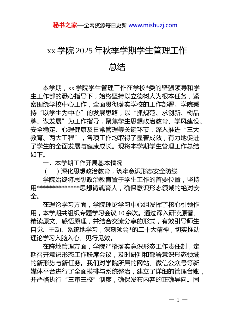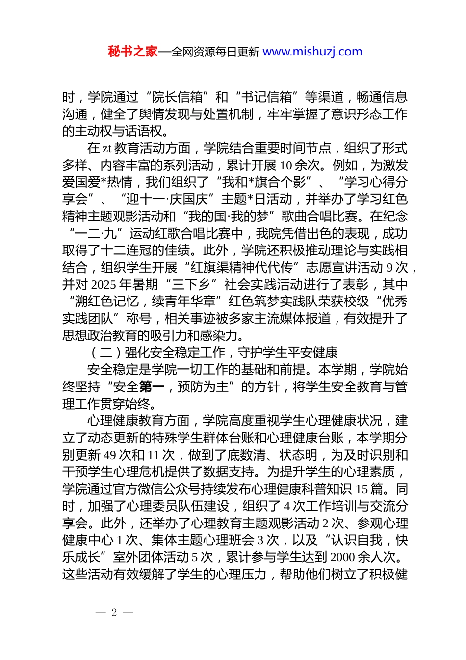 秘书之家—全网资源每日更新 www.mishuzj.comxx 学院 2025 年秋季学期学生管理工作总结本学期,xx 学院学生管理工作在学校*委的坚强领导和学生工作部的悉心指导下,始终坚持以立德树人为根本任务,紧密围绕学校中心工作,全面贯彻落实学校的工作部署。学院秉持“以学生为中心”的发展思路,以“抓规范、求创新、树品牌、谋发展”为工作指导,聚焦学生思想政治教育、学风建设、安全稳定、心理健康及日常管理等关键环节,深入推进“三大教育、两大工程”,各项工作均取得了显著成效,有力地促进了学生的全面发展与健康成长。现将本学期学生管理工作总结如下。一、本学期工作开展基本情况(一)深化思想政治教育,筑牢意识形态安全防线学院始终将思想政治教育置于学生工作的首要位置,坚持用**************思想铸魂育人,确保意识形态领域的绝对安全。在理论学习方面,学院理论学习中心组发挥了核心引领作用,本学期共组织专题学习会议 10 余次。通过深入研读原著、精读原文、感悟原理,并结合交流分享的形式,有效引导师生自觉、主动、系统地学习,深刻领会*的二十大精神,切实推动理论学习入脑入心、见行见效。在阵地管理方面,学院严格落实意识形态工作责任制,定期召开意识形态工作联席会议,及时研判和部署意识形态领域的新形势与新任务。我们对学院所属的网站、微信公众号等新媒体平台进行了全面摸排与系统整治,建立了详细的管理台账,并严格执行“三审三校”制度,确保发布内容的正确导向。同— 1 —秘书之家—全网资源每日更新 www.mishuzj.com时,学院通过“院长信箱”和“书记信箱”等渠道,畅通信息沟通,健全了舆情发现与处置机制,牢牢掌握了意识形态工作的主动权与话语权。在 zt 教育活动方面,学院结合重要时间节点,组织了形式多样、内容丰富的系列活动,累计开展 10 余次。例如,为激发爱国爱*热情,我们组织了“我和*旗合个影”、“学习心得分享会”、“迎十一·庆国庆”主题*日活动,并举办了学习红色精神主题观影活动和“我的国·我的梦”歌曲合唱比赛。在纪念“一二·九”运动红歌合唱比赛中,我院凭借出色的表现,成功取得了十二连冠的佳绩。此外,学院还积极推动理论与实践相结合,组织学生开展“红旗渠精神代代传”志愿宣讲活动 9 次,并对 2025 年暑期“三下乡”社会实践活动进行了表彰,其中“溯红色记忆,续青年华章”红色筑梦实践队荣获校级“优秀实践团队”称号,相关事迹被多家主流媒体报道,有效提升了思想政治教育的吸引力和感染力。(二)强化安全稳定工作,守护学生平安健康安全稳定是学院一切工作的基础和前提。本学期,学院始终坚持“安全第一,预防为主”的方针,将学生安全教育与管理工作贯穿始终。心理健康教育方面,学院高度重视学生心理健康状况,建立了动态更新的特殊学生群体台账和心理健康台账,本学期分别更新 49 次和 11 次,做到了底数清、状态明,为及时识别和干预学生心理危机提供了数据支持。为提升学生的心理素质,学院通过官方微信公众号持续发布心理健康科普知识 15 篇。同时,加强了心理委员队伍建设,组织了 4 次工作培训与交流分享会。此外,还举办了心理教育主题观影活动 2 次、参观心理健康中心 1 次、集体主题心理班会 3 次,以及“认识自我,快乐成长”室外团体活动 5 次,累计参与学生达到 2000 余人次。这些活动有效缓解了学生的心理压力,帮助他们树立了积极健— 2 —秘书之家—全网资源每日更新 www.mishuzj.com康的心理意识。为提升辅导员的专业能力,学院还组织了 2 次“心理危机干预”专题培训,进一步夯实了心理育人工作队伍的基础。日常安全管理方面,学院构建了“书记-辅导员-学生干部-学生”四级网格化安全管理体系。通过建立班级、宿舍楼网格群,确保信息传达的及时性与准确性。学院领导定期召开学生座谈会,倾听学生心声,解决实际困难。辅导员和学生干部则通过班会、团日活动等形式,持续开展校规校纪、法制安全、防范电信网络诈骗等 zt 教育。辅导员队伍坚持深入学生宿舍,本学期累计走访 54 次,排查安全隐患,关心学生生活,将安全管理工作落到了实处。...