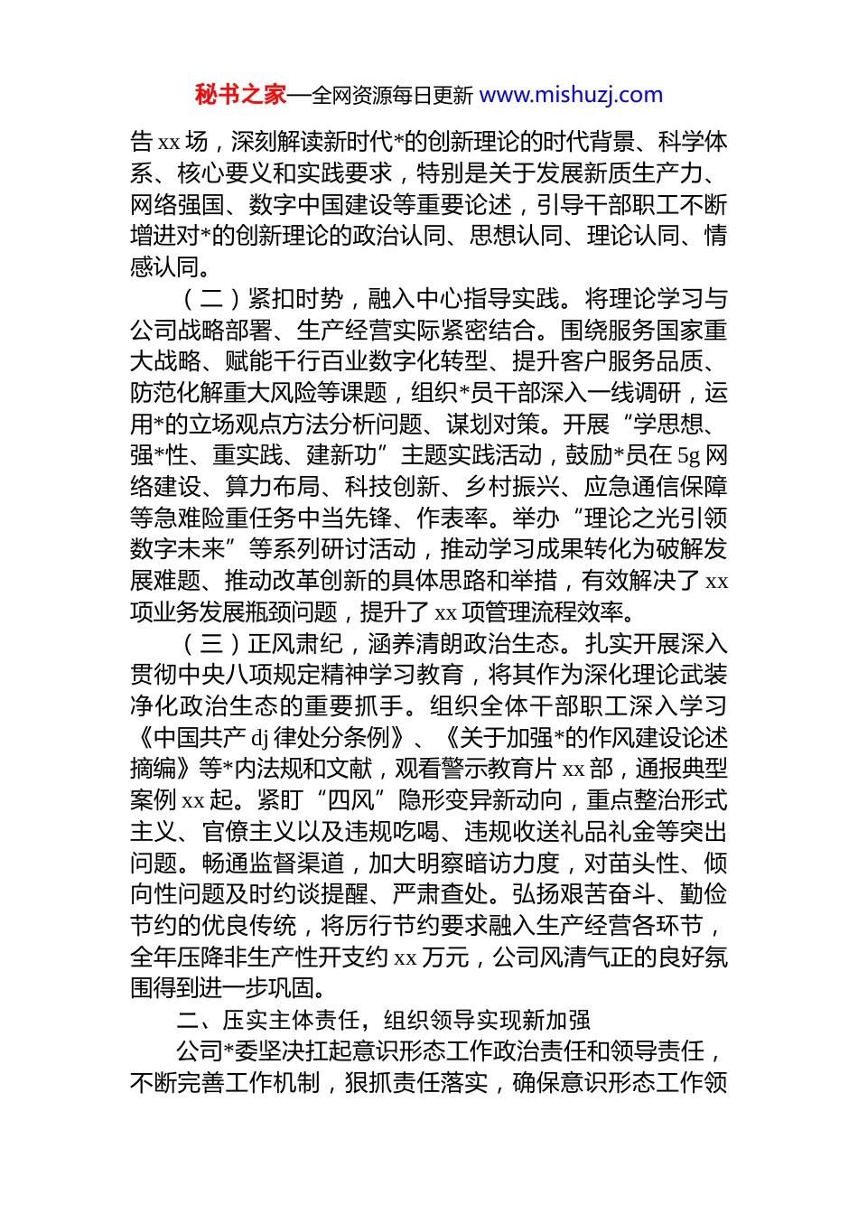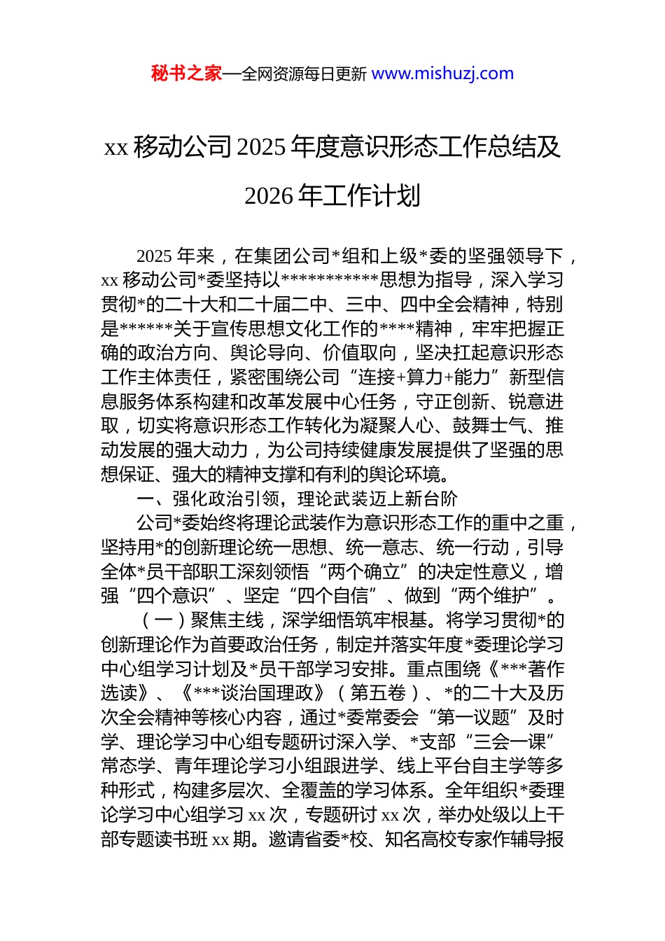秘书之家—全网资源每日更新 www.mishuzj.comxx 移动公司 2025 年度意识形态工作总结及2026 年工作计划2025 年来,在集团公司*组和上级*委的坚强领导下,xx 移动公司*委坚持以***********思想为指导,深入学习贯彻*的二十大和二十届二中、三中、四中全会精神,特别是******关于宣传思想文化工作的****精神,牢牢把握正确的政治方向、舆论导向、价值取向,坚决扛起意识形态工作主体责任,紧密围绕公司“连接+算力+能力”新型信息服务体系构建和改革发展中心任务,守正创新、锐意进取,切实将意识形态工作转化为凝聚人心、鼓舞士气、推动发展的强大动力,为公司持续健康发展提供了坚强的思想保证、强大的精神支撑和有利的舆论环境。一、强化政治引领,理论武装迈上新台阶公司*委始终将理论武装作为意识形态工作的重中之重,坚持用*的创新理论统一思想、统一意志、统一行动,引导全体*员干部职工深刻领悟“两个确立”的决定性意义,增强“四个意识”、坚定“四个自信”、做到“两个维护”。(一)聚焦主线,深学细悟筑牢根基。将学习贯彻*的创新理论作为首要政治任务,制定并落实年度*委理论学习中心组学习计划及*员干部学习安排。重点围绕《***著作选读》、《***谈治国理政》(第五卷)、*的二十大及历次全会精神等核心内容,通过*委常委会“第一议题”及时学、理论学习中心组专题研讨深入学、*支部“三会一课”常态学、青年理论学习小组跟进学、线上平台自主学等多种形式,构建多层次、全覆盖的学习体系。全年组织*委理论学习中心组学习 xx 次,专题研讨 xx 次,举办处级以上干部专题读书班 xx 期。邀请省委*校、知名高校专家作辅导报秘书之家—全网资源每日更新 www.mishuzj.com告 xx 场,深刻解读新时代*的创新理论的时代背景、科学体系、核心要义和实践要求,特别是关于发展新质生产力、网络强国、数字中国建设等重要论述,引导干部职工不断增进对*的创新理论的政治认同、思想认同、理论认同、情感认同。(二)紧扣时势,融入中心指导实践。将理论学习与公司战略部署、生产经营实际紧密结合。围绕服务国家重大战略、赋能千行百业数字化转型、提升客户服务品质、防范化解重大风险等课题,组织*员干部深入一线调研,运用*的立场观点方法分析问题、谋划对策。开展“学思想、强*性、重实践、建新功”主题实践活动,鼓励*员在 5g 网络建设、算力布局、科技创新、乡村振兴、应急通信保障等急难险重任务中当先锋、作表率。举办“理论之光引领数字未来”等系列研讨活动,推动学习成果转化为破解发展难题、推动改革创新的具体思路和举措,有效解决了 xx项业务发展瓶颈问题,提升了 xx 项管理流程效率。(三)正风肃纪,涵养清朗政治生态。扎实开展深入贯彻中央八项规定精神学习教育,将其作为深化理论武装净化政治生态的重要抓手。组织全体干部职工深入学习《中国共产 dj 律处分条例》、《关于加强*的作风建设论述摘编》等*内法规和文献,观看警示教育片 xx 部,通报典型案例 xx 起。紧盯“四风”隐形变异新动向,重点整治形式主义、官僚主义以及违规吃喝、违规收送礼品礼金等突出问题。畅通监督渠道,加大明察暗访力度,对苗头性、倾向性问题及时约谈提醒、严肃查处。弘扬艰苦奋斗、勤俭节约的优良传统,将厉行节约要求融入生产经营各环节,全年压降非生产性开支约 xx 万元,公司风清气正的良好氛围得到进一步巩固。二、压实主体责任,组织领导实现新加强公司*委坚决扛起意识形态工作政治责任和领导责任,不断完善工作机制,狠抓责任落实,确保意识形态工作领秘书之家—全网资源每日更新 www.mishuzj.com导权、管理权、话语权牢牢掌握在手中。(一)健全体系,明确责任链条。坚持*管意识形态原则,调整充实公司意识形态工作领导小组,由*委书记担任组长,履行第一责任人职责,带头把方向、抓导向、管阵地、强队伍。*委常委会每年至少 xx 次专题研究意识形态工作,将其纳入 dj 工作责任制和年度绩效考核重要内容,与业务工作同部署、同落实、同检查、同考核。严格落实“一岗双责”,领导班子成员根据分工,切实抓好分管领域和部门的意识形态工作,定期...