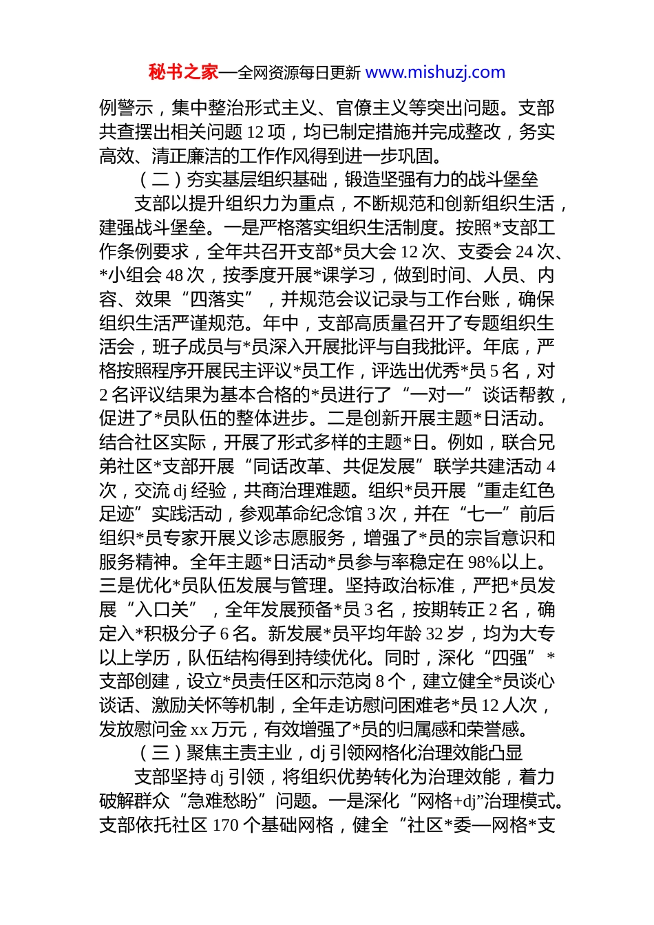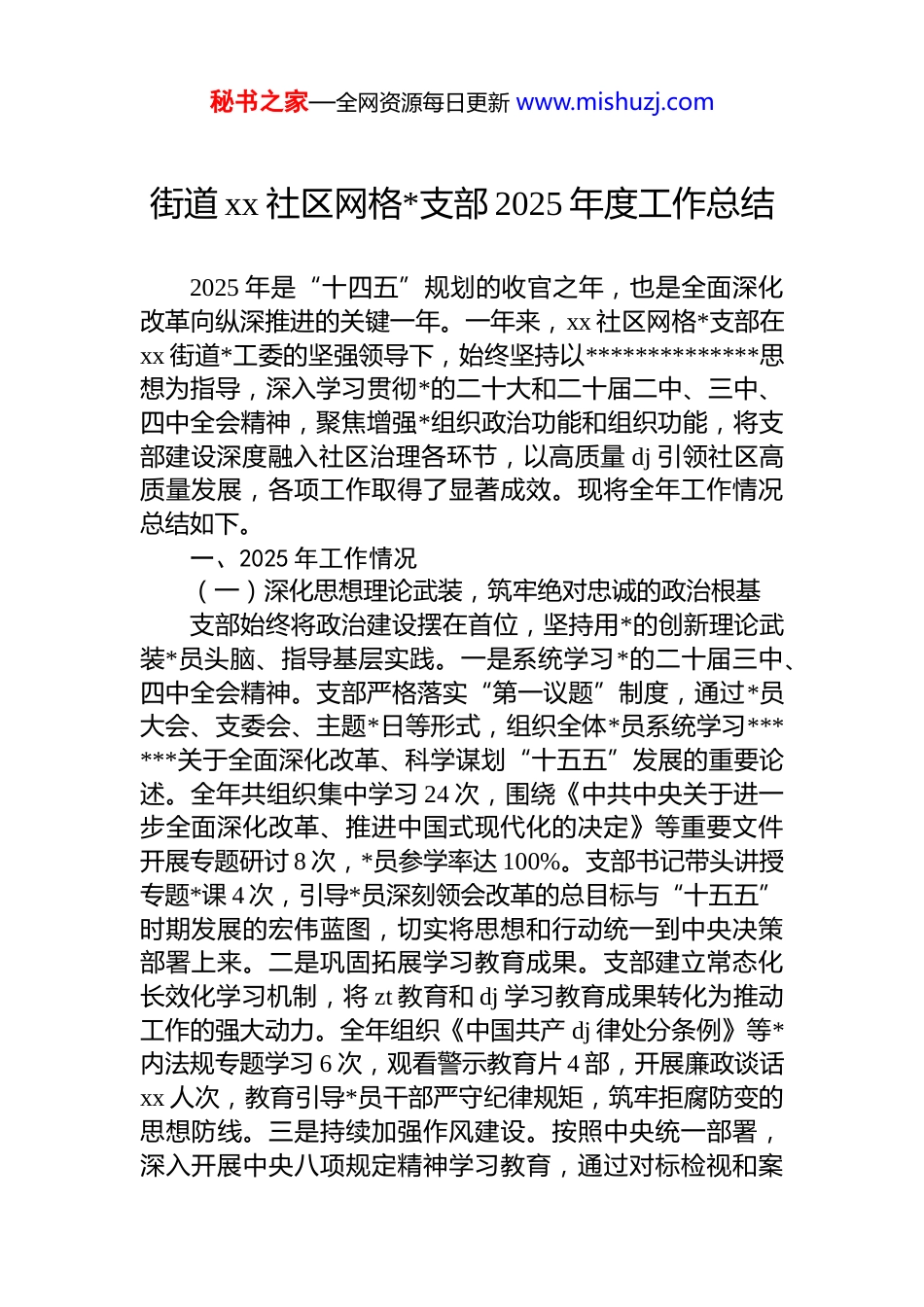 秘书之家—全网资源每日更新 www.mishuzj.com街道 xx 社区网格*支部 2025 年度工作总结2025 年是“十四五”规划的收官之年,也是全面深化改革向纵深推进的关键一年。一年来,xx 社区网格*支部在xx 街道*工委的坚强领导下,始终坚持以**************思想为指导,深入学习贯彻*的二十大和二十届二中、三中、四中全会精神,聚焦增强*组织政治功能和组织功能,将支部建设深度融入社区治理各环节,以高质量 dj 引领社区高质量发展,各项工作取得了显著成效。现将全年工作情况总结如下。一、2025 年工作情况(一)深化思想理论武装,筑牢绝对忠诚的政治根基支部始终将政治建设摆在首位,坚持用*的创新理论武装*员头脑、指导基层实践。一是系统学习*的二十届三中、四中全会精神。支部严格落实“第一议题”制度,通过*员大会、支委会、主题*日等形式,组织全体*员系统学习******关于全面深化改革、科学谋划“十五五”发展的重要论述。全年共组织集中学习 24 次,围绕《中共中央关于进一步全面深化改革、推进中国式现代化的决定》等重要文件开展专题研讨 8 次,*员参学率达 100%。支部书记带头讲授专题*课 4 次,引导*员深刻领会改革的总目标与“十五五”时期发展的宏伟蓝图,切实将思想和行动统一到中央决策部署上来。二是巩固拓展学习教育成果。支部建立常态化长效化学习机制,将 zt 教育和 dj 学习教育成果转化为推动工作的强大动力。全年组织《中国共产 dj 律处分条例》等*内法规专题学习 6 次,观看警示教育片 4 部,开展廉政谈话xx 人次,教育引导*员干部严守纪律规矩,筑牢拒腐防变的思想防线。三是持续加强作风建设。按照中央统一部署,深入开展中央八项规定精神学习教育,通过对标检视和案秘书之家—全网资源每日更新 www.mishuzj.com例警示,集中整治形式主义、官僚主义等突出问题。支部共查摆出相关问题 12 项,均已制定措施并完成整改,务实高效、清正廉洁的工作作风得到进一步巩固。(二)夯实基层组织基础,锻造坚强有力的战斗堡垒支部以提升组织力为重点,不断规范和创新组织生活,建强战斗堡垒。一是严格落实组织生活制度。按照*支部工作条例要求,全年共召开支部*员大会 12 次、支委会 24 次、*小组会 48 次,按季度开展*课学习,做到时间、人员、内容、效果“四落实”,并规范会议记录与工作台账,确保组织生活严谨规范。年中,支部高质量召开了专题组织生活会,班子成员与*员深入开展批评与自我批评。年底,严格按照程序开展民主评议*员工作,评选出优秀*员 5 名,对2 名评议结果为基本合格的*员进行了“一对一”谈话帮教,促进了*员队伍的整体进步。二是创新开展主题*日活动。结合社区实际,开展了形式多样的主题*日。例如,联合兄弟社区*支部开展“同话改革、共促发展”联学共建活动 4次,交流 dj 经验,共商治理难题。组织*员开展“重走红色足迹”实践活动,参观革命纪念馆 3 次,并在“七一”前后组织*员专家开展义诊志愿服务,增强了*员的宗旨意识和服务精神。全年主题*日活动*员参与率稳定在 98%以上。三是优化*员队伍发展与管理。坚持政治标准,严把*员发展“入口关”,全年发展预备*员 3 名,按期转正 2 名,确定入*积极分子 6 名。新发展*员平均年龄 32 岁,均为大专以上学历,队伍结构得到持续优化。同时,深化“四强”*支部创建,设立*员责任区和示范岗 8 个,建立健全*员谈心谈话、激励关怀等机制,全年走访慰问困难老*员 12 人次,发放慰问金 xx 万元,有效增强了*员的归属感和荣誉感。(三)聚焦主责主业,dj 引领网格化治理效能凸显支部坚持 dj 引领,将组织优势转化为治理效能,着力破解群众“急难愁盼”问题。一是深化“网格+dj”治理模式。支部依托社区 170 个基础网格,健全“社区*委—网格*支秘书之家—全网资源每日更新 www.mishuzj.com部—楼栋*小组—*员中心户”的四级组织体系,将*的工作触角延伸至社会治理的最末端。支部*员干部下沉网格,担任网格员或“网格治理合伙人”,亮身份、践承诺,通过“一日三巡”等方式,主动发现并解决问题。据不完全统计,全年通过网格化机...