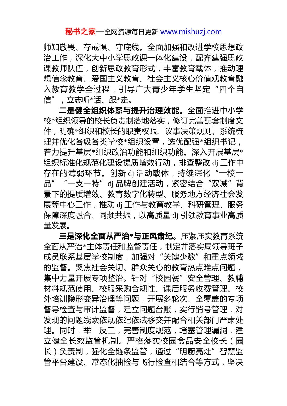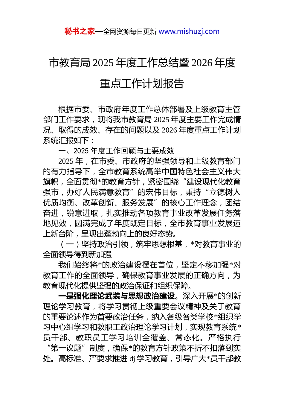 秘书之家—全网资源每日更新 www.mishuzj.com市教育局 2025 年度工作总结暨 2026 年度重点工作计划报告根据市委、市政府年度工作总体部署及上级教育主管部门工作要求,现将我市教育局 2025 年度主要工作完成情况、取得的成效、存在的问题以及 2026 年度重点工作计划系统汇报如下:一、2025 年度工作回顾与主要成效2025 年,在市委、市政府的坚强领导和上级教育部门的有力指导下,全市教育系统高举中国特色社会主义伟大旗帜,全面贯彻*的教育方针,紧密围绕“建设现代化教育强市,办好人民满意教育”的宏伟目标,秉持“立德树人优质均衡、改革创新、服务发展”的核心工作理念,团结奋进,锐意进取,扎实推动各项教育事业改革发展任务落地见效,圆满完成了年度既定目标,全市教育事业发展迈上新台阶,呈现出蓬勃向上的良好态势。(一)坚持政治引领,筑牢思想根基,*对教育事业的全面领导得到新加强我们始终将*的政治建设摆在首位,坚定不移加强*对教育工作的全面领导,确保教育事业发展的正确方向,为教育现代化提供坚强的政治保证和组织保障。一是强化理论武装与思想政治建设。深入开展*的创新理论学习教育,将学习贯彻上级重要会议精神及关于教育的重要论述作为首要政治任务,纳入各级各类学校*组织学习中心组学习和教职工政治理论学习计划,实现教育系统*员干部、教职员工学习培训全覆盖、常态化。严格执行“第一议题”制度,确保*的教育方针政策不折不扣落到实处。高标准、严要求推进 dj 学习教育,引导广大*员干部教秘书之家—全网资源每日更新 www.mishuzj.com师知敬畏、存戒惧、守底线。全面加强和改进学校思想政治工作,深化大中小学思政课一体化建设,配齐建强思政课教师队伍,创新思政教育形式,丰富教育载体,推动理想信念教育、爱国主义教育、社会主义核心价值观教育融入教育教学全过程,引导广大青少年学生坚定“四个自信”,立志听*话、跟*走。二是健全组织体系与提升治理效能。全面推进中小学校*组织领导的校长负责制落地落实,修订完善配套制度文件,明确*组织和校长的职责权限、议事决策规则。系统梳理并优化各级各类学校*组织设置,选优配强*组织书记,着力提升基层*组织政治功能和组织功能。深入开展基层*组织标准化规范化建设提质增效行动,排查整改 dj 工作中存在的薄弱环节。创新 dj 活动载体,持续深化“一校一品”“一支一特”dj 品牌创建活动,紧密结合“双减”背景下的提质增效、教育数字化转型、服务地方经济社会发展等中心工作,推动 dj 工作与教育教学、科研管理、服务保障深度融合、同频共振,以高质量 dj 引领教育事业高质量发展。三是深化全面从严治*与正风肃纪。压紧压实教育系统全面从严治*主体责任和监督责任,制定并落实局领导班子成员联系基层学校制度,加强对“关键少数”和重点领域的监督。聚焦社会关切、群众关心的教育热点难点问题,集中力量开展专项整治。针对“校园餐”安全管理、教辅材料规范使用、校服采购合规性、课后服务收费管理、校外培训隐形变异治理等问题,开展多轮次、全覆盖的专项督导检查与审计监督,建立问题台账,实行销号管理,对发现的问题线索依规依纪依法移交并配合相关部门严肃处理。同时,举一反三,完善制度规范,堵塞管理漏洞,建立健全长效监管机制。严格落实校园食品安全校长(园长)负责制,强化全链条监管,通过“明厨亮灶”智慧监管平台建设、常态化抽检与飞行检查相结合等方式,坚决秘书之家—全网资源每日更新 www.mishuzj.com守住师生“舌尖上的安全”。加强师德师风建设长效机制开展师德专题教育和警示教育,严肃查处师德失范行为,营造风清气正的育人环境。(二)优化资源配置,促进公平均衡,教育公共服务水平实现新提升我们始终坚持以人民为中心的发展思想,着力破解教育发展不平衡不充分问题,努力扩大优质教育资源覆盖面不断满足人民群众从“有学上”到“上好学”的美好期盼。一是持续加大教育资源供给力度。积极争取并优化财政教育投入结构,确保“两个只增不减”落实到位。全力推进学前教育普及普惠安全优质发展,新建、改扩建一批公办幼儿园,扶持认定一批普惠性民办幼...