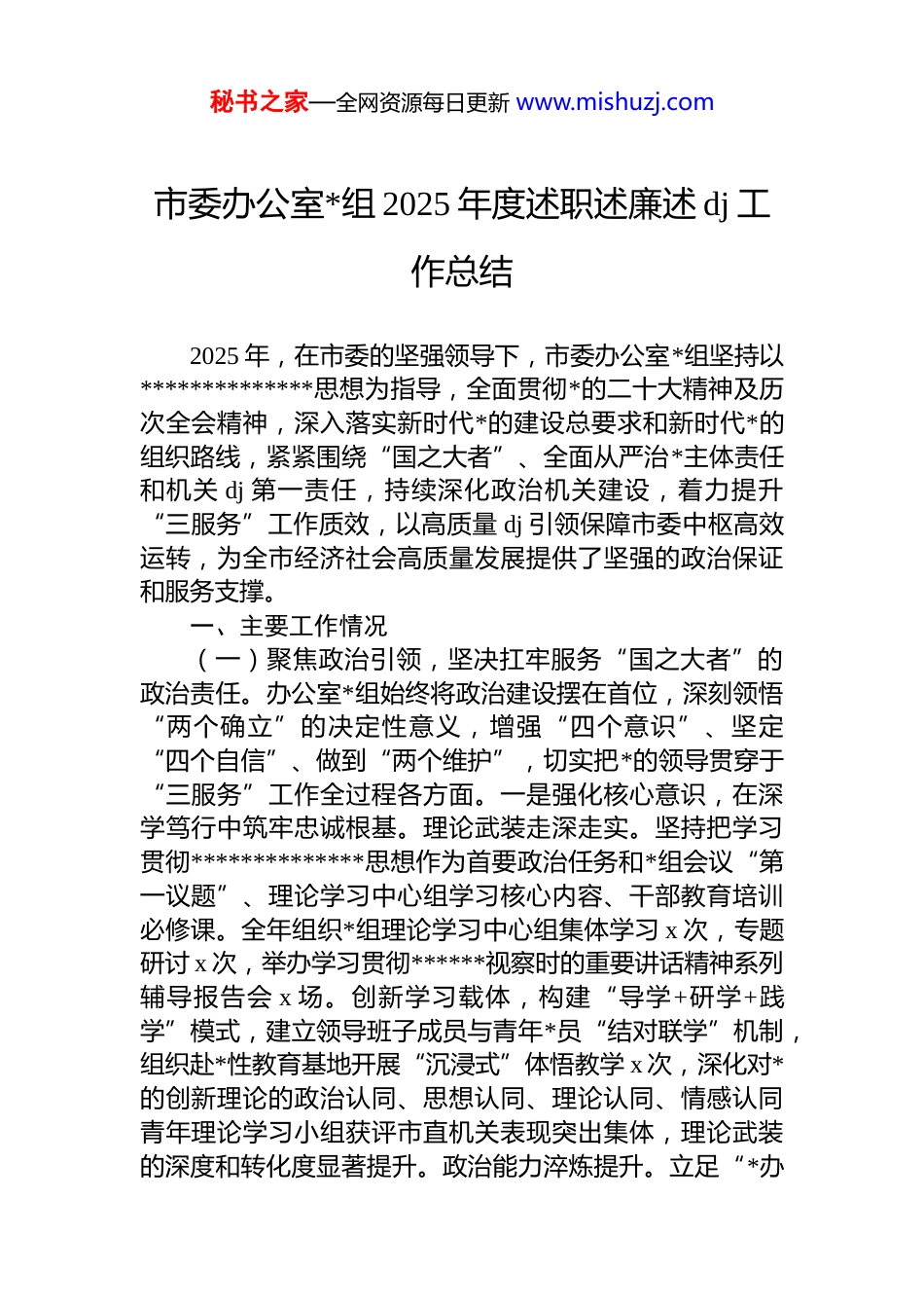 秘书之家—全网资源每日更新 www.mishuzj.com市委办公室*组 2025 年度述职述廉述 dj 工作总结2025 年,在市委的坚强领导下,市委办公室*组坚持以**************思想为指导,全面贯彻*的二十大精神及历次全会精神,深入落实新时代*的建设总要求和新时代*的组织路线,紧紧围绕“国之大者”、全面从严治*主体责任和机关 dj 第一责任,持续深化政治机关建设,着力提升“三服务”工作质效,以高质量 dj 引领保障市委中枢高效运转,为全市经济社会高质量发展提供了坚强的政治保证和服务支撑。一、主要工作情况(一)聚焦政治引领,坚决扛牢服务“国之大者”的政治责任。办公室*组始终将政治建设摆在首位,深刻领悟“两个确立”的决定性意义,增强“四个意识”、坚定“四个自信”、做到“两个维护”,切实把*的领导贯穿于“三服务”工作全过程各方面。一是强化核心意识,在深学笃行中筑牢忠诚根基。理论武装走深走实。坚持把学习贯彻**************思想作为首要政治任务和*组会议“第一议题”、理论学习中心组学习核心内容、干部教育培训必修课。全年组织*组理论学习中心组集体学习 x 次,专题研讨 x 次,举办学习贯彻******视察时的重要讲话精神系列辅导报告会 x 场。创新学习载体,构建“导学+研学+践学”模式,建立领导班子成员与青年*员“结对联学”机制,组织赴*性教育基地开展“沉浸式”体悟教学 x 次,深化对*的创新理论的政治认同、思想认同、理论认同、情感认同青年理论学习小组获评市直机关表现突出集体,理论武装的深度和转化度显著提升。政治能力淬炼提升。立足“*办秘书之家—全网资源每日更新 www.mishuzj.com姓*”根本属性,将绝对忠诚融入血脉、注入灵魂。严格执行重大事项请示报告制度,确保*中央决策部署和省委、市委工作要求在办公室不折不扣落到实处。教育引导全体干部胸怀“国之大者”,不断提高政治判断力、政治领悟力、政治执行力,以“时时放心不下”的责任感和“事事心中有底”的行动力,确保各项工作始终沿着正确政治方向前进,着力锻造让市委绝对放心的“精锐部队”,始终走在践行“两个维护”的第一方阵。二是紧扣中心大局,在服务保障中彰显政治担当。推动重大战略落地生根。紧紧围绕服务保障黄河重大国家战略实施这一核心任务,充分发挥统筹协调、参谋助手、督促检查作用。建立“攻坚指数”评价体系,将服务保障重大战略情况作为民主评议*员、干部考核的重要内容。实行清单化管理、项目化推进,细化分解落实******视察****要求的具体任务 x 项,梳理形成年度重点工作 x 项、重点项目 x 项,全部纳入“挂图作战”台账。强化闭环式督查问效,每半年组织综合督查评估,协调解决难点堵点问题 x 个,有力推动了 x 生态保护修复工程、x 高端石化产业基地建设等标志性项目取得突破性进展,以实干实绩书写服务“国之大者”的合格政治答卷。提升参谋辅政精准效能。聚焦全市改革发展稳定关键问题,深入开展“大学习、大调研、大服务”活动。*组班子成员带头深入基层一线开展专题调研 x 次,形成高质量调研报告 x篇,其中 x 篇获市委主要领导肯定性批示。优化信息工作机制,编报《我市信息》《要情专报》等 x 期,被上级采用 x条,为市委科学决策提供了重要参考。(二)聚力主责主业,坚决扛牢全面从严治*主体责任。办公室*组深刻认识履行全面从严治*协助职责和监督责任的极端重要性,切实当好市委的“参谋部”“协调部”和“督查部”,推动管*治*政治责任落地生根。一是健全责任体系,层层传导压实。清单明责。协助市委健全完善全面从严治*主体责任清单体系,制定办公室*组落实主体责秘书之家—全网资源每日更新 www.mishuzj.com任年度任务安排及班子成员“个性化”责任清单,明确任务书、时间表、责任人。全年组织召开全面从严治*专题*组会 x 次、会商研判会议 x 次、“四责协同”联席会议 x 次,确保责任链条环环相扣、无缝衔接。协同履责。切实履行好“设计员、提醒员、联络员、督导员”职责。协助市委谋划年度 dj 工作要点,推动各级*组织书记抓 dj 责任清单全覆盖。加强对全市面上全面从严治*工作的统筹协调和...