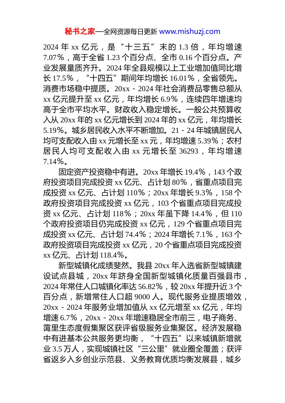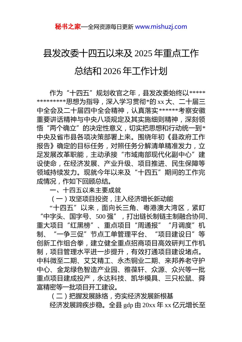 秘书之家—全网资源每日更新 www.mishuzj.com县发改委十四五以来及 2025 年重点工作总结和 2026 年工作计划作为“十四五”规划收官之年,县发改委始终以**************思想为指导,深入学习贯彻*的 xx 大、二十届三中全会及二十届四中全会精神,认真落实******考察安徽重要讲话精神与中央八项规定及其实施细则精神,深刻领悟“两个确立”的决定性意义,切实把思想和行动统一到*中央及省市县各项决策部署上来。围绕年初《县政府工作报告》确定的目标任务,对照任务分解清单精准发力,立足发展改革职能,主动承接“市域南部现代化副中心”建设使命,在经济发展、产业升级、项目推进、民生保障等领域持续发力。现就今年以来及“十四五”期间的工作完成情况,作如下回顾总结。一、十四五以来主要成就(一)攻坚项目投资,注入经济增长新动能“十四五”以来,面向长三角、粤港澳大湾区,紧盯“中字头、国字号、500 强”,打出链长制链主制融合协同、重大项目“红黑榜”、重点项目“周通报”“月调度”机制、“一争三促”节点工单管理平台、“项目建设日”等创新工作组合拳,建立健全重点招商项目高效研判工作机制,项目管理水平进一步提升,有效打通项目建设堵点。中科微至二期、艾艾精工、永杰铜业二期、来邦养老守护中心、金龙绿色智造产业园、雅葆轩、众源、众兴等一批重点项目建成投产,永达科技、凯华模具、三只松鼠、舜富精密等一批项目开工建设。(二)把握发展脉络,夯实经济发展新根基经济发展蹄疾步稳。全县 gdp 由 20xx 年 xx 亿元增长至秘书之家—全网资源每日更新 www.mishuzj.com2024 年 xx 亿元,是“十三五”末的 1.3 倍,年均增速7.07%,高于全省 1.23 个百分点、全市 0.16 个百分点。产业发展量质齐升。2024 年全县规模以上工业增加值同比增长 17.5%,“十四五”期间年均增长 16.01%,全省领先。消费市场稳中提质。20xx-2024 年社会消费品零售总额从xx 亿元提升至 xx 亿元,年均增长 6.9%,连续四年增速均高于全市平均水平。财政收入稳定增长。一般公共预算收入从 20xx 年的 xx 亿元增长到 2024 年的 xx 亿元,年均增长5.19%。城乡居民收入水平不断增加。21-24 年城镇居民人均可支配收入由 xx 元增长至 xx 元,年均增速 5.39%;农村居民人均可支配收入由 xx 元增长至 36293,年均增速7.14%。固定资产投资稳中有进。20xx 年增长 19.4%,143 个政府投资项目完成投资 xx 亿元、占计划 80%,省重点项目完成投资 xx 亿元、占计划 110%;20xx 年增长 9.3%,158 个政府投资项目完成投资 xx 亿元,103 个省重点项目完成投资 xx 亿元、占计划 118%;20xx 年虽下降 14.4%,但 110个政府投资项目仍完成投资 xx 亿元,129 个省重点项目完成投资 xx 亿元、占计划 74.4%;2024 年增长 7.1%,163 个政府投资项目完成投资 xx 亿元,20 个省重点项目完成投资xx 亿元、占计划 118.4%。新型城镇化成绩斐然。我县 20xx 年入选省新型城镇建设试点县城,20xx 年跻身全国新型城镇化质量百强县市,2024 年常住人口城镇化率达 56.82%,较 20xx 年提升近 3 个百分点,新增常住人口超 9000 人。现代服务业提质增效,20xx-2024 年服务业增加值从 xx 亿元增至 xx 亿元,年均增速 6.7%,20xx-20xx 年增速稳居全市前三,电子商务、霭里生态度假集聚区获评省级服务业集聚区。经济发展稳中有进基本公共服务更均衡,“十四五”以来城镇新增就业 3.5 万人,实现城镇社区“三公里”就业圈全覆盖;获评省返乡入乡创业示范县、义务教育优质均衡发展县,城乡秘书之家—全网资源每日更新 www.mishuzj.com居民养老保险人均缴费连续 4 年全省前列,医保参保率稳定在 95%以上。(三)聚焦民生福祉,彰显为民服务新温度十四五以来,发改委坚持以民生工程、暖民心行动为抓手,民生工作成效显著,20xx 年、20xx 年获全市考核第一,20xx 年获第三。教育领域,20xx-2025 年累计资助困难学生 xx 万元,全学段资助政策护航教育公平。医疗服务持续升级,基层能力提升,实现...