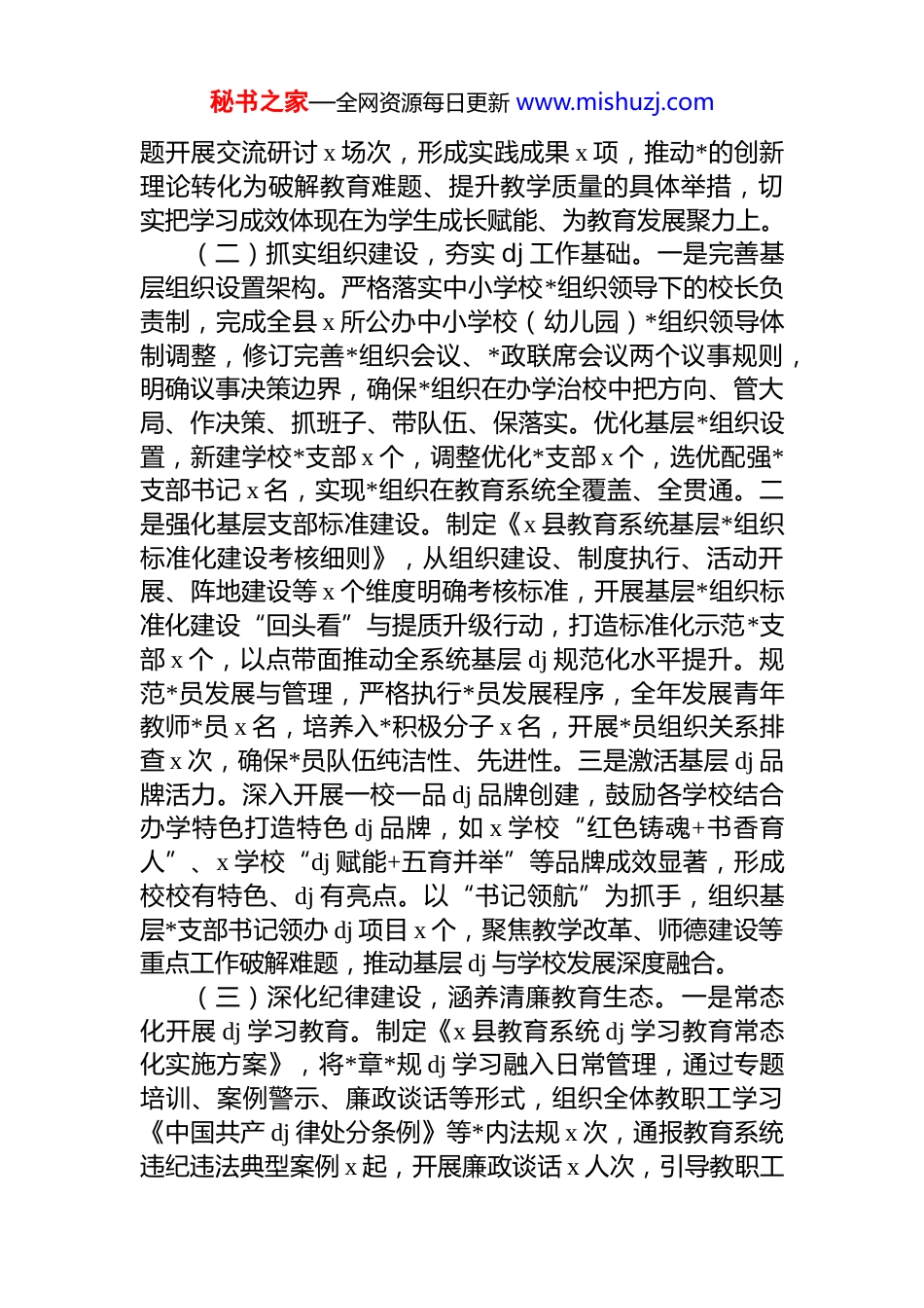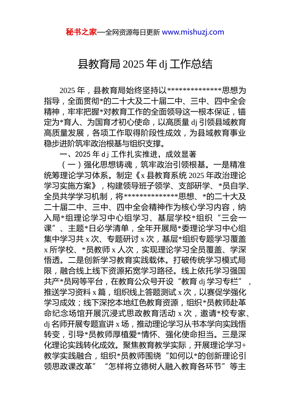 秘书之家—全网资源每日更新 www.mishuzj.com县教育局 2025 年 dj 工作总结2025 年,县教育局始终坚持以**************思想为指导,全面贯彻*的二十大及二十届二中、三中、四中全会精神,牢牢把握*对教育工作的全面领导这一根本保证,锚定为*育人、为国育才初心使命,以高质量 dj 引领县域教育高质量发展,各项工作取得阶段性成效,为县域教育事业稳步进阶筑牢政治根基与组织支撑。一、2025 年 dj 工作扎实推进,成效显著(一)强化思想铸魂,筑牢政治引领根基。一是精准统筹理论学习体系。制定《x 县教育系统 2025 年政治理论学习实施方案》,构建领导班子领学、支部研学、*员自学、全员共学学习机制,将**************思想、*的二十大及二十届二中、三中、四中全会精神作为核心学习内容,纳入局*组理论学习中心组学习、基层学校*组织“三会一课”、主题*日必学清单,全年开展局*委理论学习中心组集中学习共 x 次、专题研讨 x 次,基层*组织专题学习覆盖x 所学校、*员教师 x 人次,实现理论学习全员覆盖、学深悟透。二是创新学习教育实践载体。打破传统学习模式局限,融合线上线下资源拓宽学习路径。线上依托学习强国共产*员网等平台,在教育公众号开设“教育 dj 学习专栏”,推送学习资料 x 篇,组织线上答题测试 x 次,以赛促学强化学习成效;线下深挖本地红色教育资源,组织*员教师赴革命纪念场馆开展沉浸式思政教育活动 x 次,邀请*校专家、dj 名师开展专题宣讲 x 场,推动理论学习从书本学向实践悟转变,引导*员教师厚植爱*情怀、强化使命担当。三是深化理论实践转化成效。聚焦教育教学实际,开展理论学习+教学实践融合,组织*员教师围绕“如何以*的创新理论引领思政课改革”“怎样将立德树人融入教育各环节”等主秘书之家—全网资源每日更新 www.mishuzj.com题开展交流研讨 x 场次,形成实践成果 x 项,推动*的创新理论转化为破解教育难题、提升教学质量的具体举措,切实把学习成效体现在为学生成长赋能、为教育发展聚力上。(二)抓实组织建设,夯实 dj 工作基础。一是完善基层组织设置架构。严格落实中小学校*组织领导下的校长负责制,完成全县 x 所公办中小学校(幼儿园)*组织领导体制调整,修订完善*组织会议、*政联席会议两个议事规则,明确议事决策边界,确保*组织在办学治校中把方向、管大局、作决策、抓班子、带队伍、保落实。优化基层*组织设置,新建学校*支部 x 个,调整优化*支部 x 个,选优配强*支部书记 x 名,实现*组织在教育系统全覆盖、全贯通。二是强化基层支部标准建设。制定《x 县教育系统基层*组织标准化建设考核细则》,从组织建设、制度执行、活动开展、阵地建设等 x 个维度明确考核标准,开展基层*组织标准化建设“回头看”与提质升级行动,打造标准化示范*支部 x 个,以点带面推动全系统基层 dj 规范化水平提升。规范*员发展与管理,严格执行*员发展程序,全年发展青年教师*员 x 名,培养入*积极分子 x 名,开展*员组织关系排查 x 次,确保*员队伍纯洁性、先进性。三是激活基层 dj 品牌活力。深入开展一校一品 dj 品牌创建,鼓励各学校结合办学特色打造特色 dj 品牌,如 x 学校“红色铸魂+书香育人”、x 学校“dj 赋能+五育并举”等品牌成效显著,形成校校有特色、dj 有亮点。以“书记领航”为抓手,组织基层*支部书记领办 dj 项目 x 个,聚焦教学改革、师德建设等重点工作破解难题,推动基层 dj 与学校发展深度融合。(三)深化纪律建设,涵养清廉教育生态。一是常态化开展 dj 学习教育。制定《x 县教育系统 dj 学习教育常态化实施方案》,将*章*规 dj 学习融入日常管理,通过专题培训、案例警示、廉政谈话等形式,组织全体教职工学习《中国共产 dj 律处分条例》等*内法规 x 次,通报教育系统违纪违法典型案例 x 起,开展廉政谈话 x 人次,引导教职工秘书之家—全网资源每日更新 www.mishuzj.com知敬畏、存戒惧、守底线,推动 dj 学习教育从集中性向常态化延伸。二是严格落实中央八项规定精神。深入开展中央八项规定及其实施细则精神学习教育,...