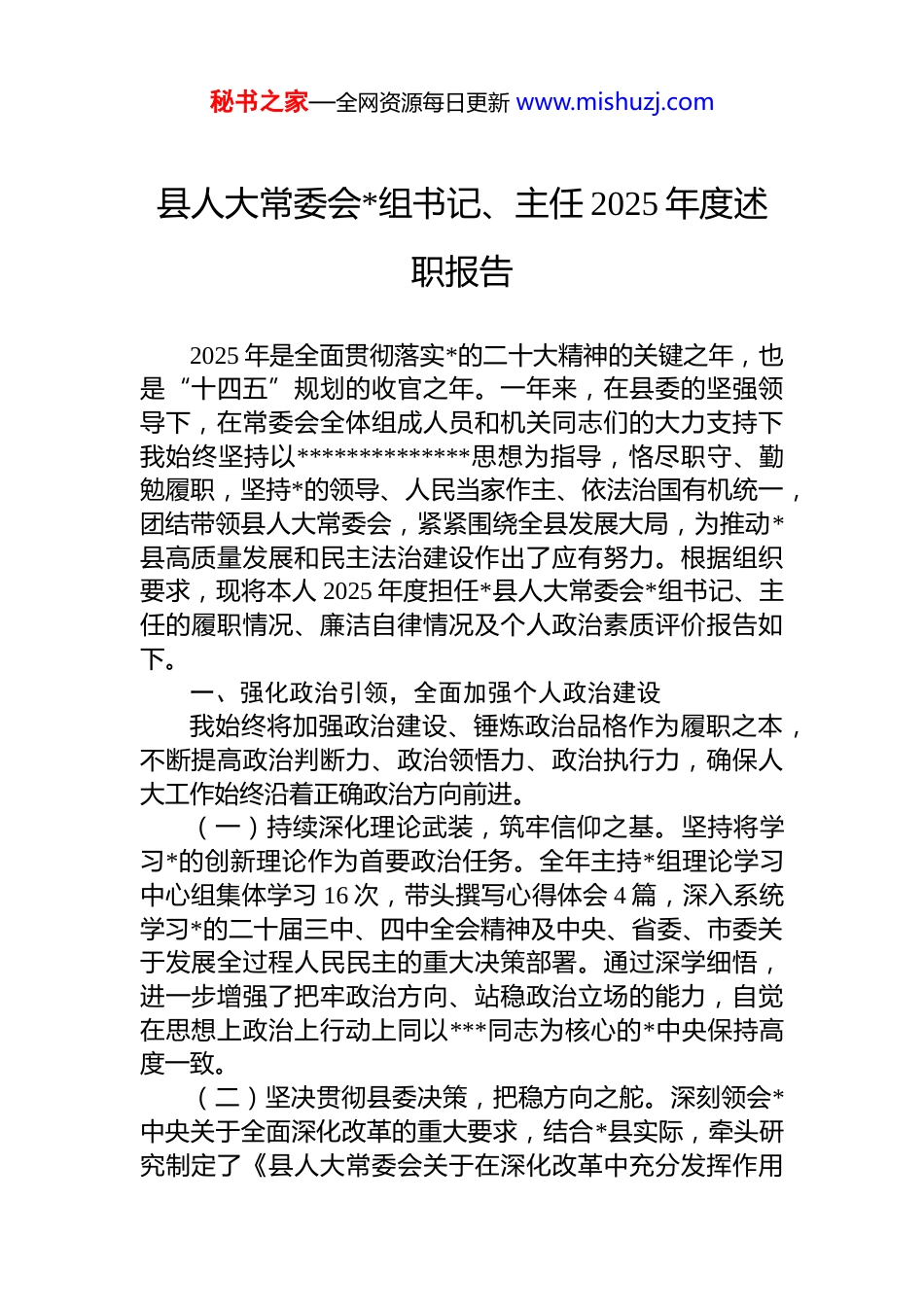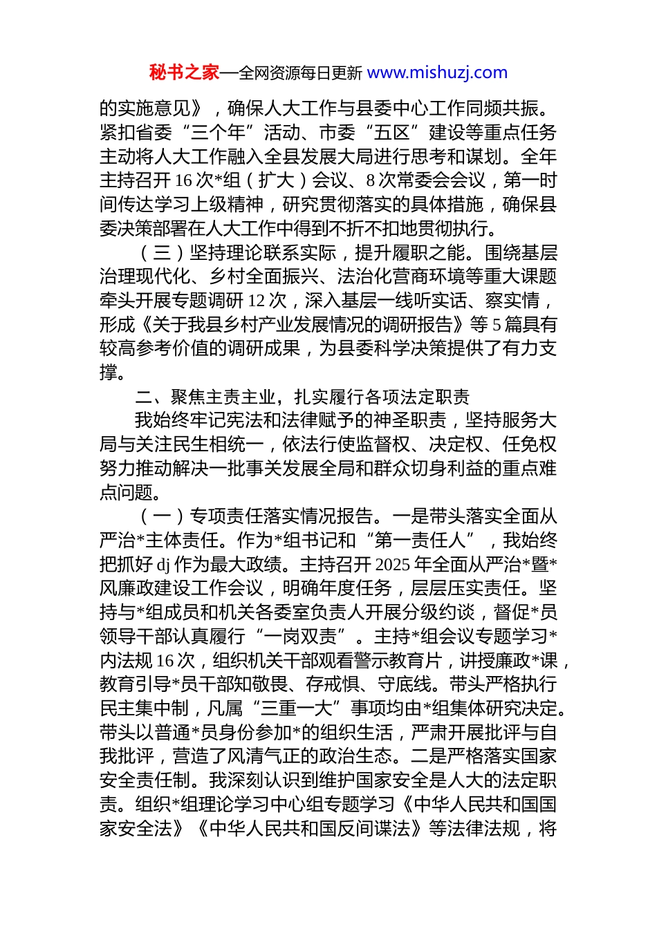 秘书之家—全网资源每日更新 www.mishuzj.com县人大常委会*组书记、主任 2025 年度述职报告2025 年是全面贯彻落实*的二十大精神的关键之年,也是“十四五”规划的收官之年。一年来,在县委的坚强领导下,在常委会全体组成人员和机关同志们的大力支持下我始终坚持以**************思想为指导,恪尽职守、勤勉履职,坚持*的领导、人民当家作主、依法治国有机统一,团结带领县人大常委会,紧紧围绕全县发展大局,为推动*县高质量发展和民主法治建设作出了应有努力。根据组织要求,现将本人 2025 年度担任*县人大常委会*组书记、主任的履职情况、廉洁自律情况及个人政治素质评价报告如下。一、强化政治引领,全面加强个人政治建设我始终将加强政治建设、锤炼政治品格作为履职之本,不断提高政治判断力、政治领悟力、政治执行力,确保人大工作始终沿着正确政治方向前进。(一)持续深化理论武装,筑牢信仰之基。坚持将学习*的创新理论作为首要政治任务。全年主持*组理论学习中心组集体学习 16 次,带头撰写心得体会 4 篇,深入系统学习*的二十届三中、四中全会精神及中央、省委、市委关于发展全过程人民民主的重大决策部署。通过深学细悟,进一步增强了把牢政治方向、站稳政治立场的能力,自觉在思想上政治上行动上同以***同志为核心的*中央保持高度一致。(二)坚决贯彻县委决策,把稳方向之舵。深刻领会*中央关于全面深化改革的重大要求,结合*县实际,牵头研究制定了《县人大常委会关于在深化改革中充分发挥作用秘书之家—全网资源每日更新 www.mishuzj.com的实施意见》,确保人大工作与县委中心工作同频共振。紧扣省委“三个年”活动、市委“五区”建设等重点任务主动将人大工作融入全县发展大局进行思考和谋划。全年主持召开 16 次*组(扩大)会议、8 次常委会会议,第一时间传达学习上级精神,研究贯彻落实的具体措施,确保县委决策部署在人大工作中得到不折不扣地贯彻执行。(三)坚持理论联系实际,提升履职之能。围绕基层治理现代化、乡村全面振兴、法治化营商环境等重大课题牵头开展专题调研 12 次,深入基层一线听实话、察实情,形成《关于我县乡村产业发展情况的调研报告》等 5 篇具有较高参考价值的调研成果,为县委科学决策提供了有力支撑。二、聚焦主责主业,扎实履行各项法定职责我始终牢记宪法和法律赋予的神圣职责,坚持服务大局与关注民生相统一,依法行使监督权、决定权、任免权努力推动解决一批事关发展全局和群众切身利益的重点难点问题。(一)专项责任落实情况报告。一是带头落实全面从严治*主体责任。作为*组书记和“第一责任人”,我始终把抓好 dj 作为最大政绩。主持召开 2025 年全面从严治*暨*风廉政建设工作会议,明确年度任务,层层压实责任。坚持与*组成员和机关各委室负责人开展分级约谈,督促*员领导干部认真履行“一岗双责”。主持*组会议专题学习*内法规 16 次,组织机关干部观看警示教育片,讲授廉政*课,教育引导*员干部知敬畏、存戒惧、守底线。带头严格执行民主集中制,凡属“三重一大”事项均由*组集体研究决定。带头以普通*员身份参加*的组织生活,严肃开展批评与自我批评,营造了风清气正的政治生态。二是严格落实国家安全责任制。我深刻认识到维护国家安全是人大的法定职责。组织*组理论学习中心组专题学习《中华人民共和国国家安全法》《中华人民共和国反间谍法》等法律法规,将秘书之家—全网资源每日更新 www.mishuzj.com总体国家安全观贯穿于人大履职全过程。将维护国家安全的要求融入各项监督工作。在听取审议法治政府建设报告时,重点关注了社会治安、风险防范等内容;在开展安全生产监督时,强调了防范化解重大安全风险对经济安全的重要性。高度重视人大常委会机关自身安全**工作,组织开展**知识专题培训,完善涉密文件管理制度,确保机关运转安全、高效,全年未发生失泄密事件。三是依法履行意识形态工作职责。我坚决扛起意识形态工作第一责任人责任,确保人大这块重要阵地牢牢掌握在*手中。加强阵地建设与管理。指导加强对县人大官方网站、“智慧人大”微信小程序等平台的管理,确保其成为传播*的声音、...