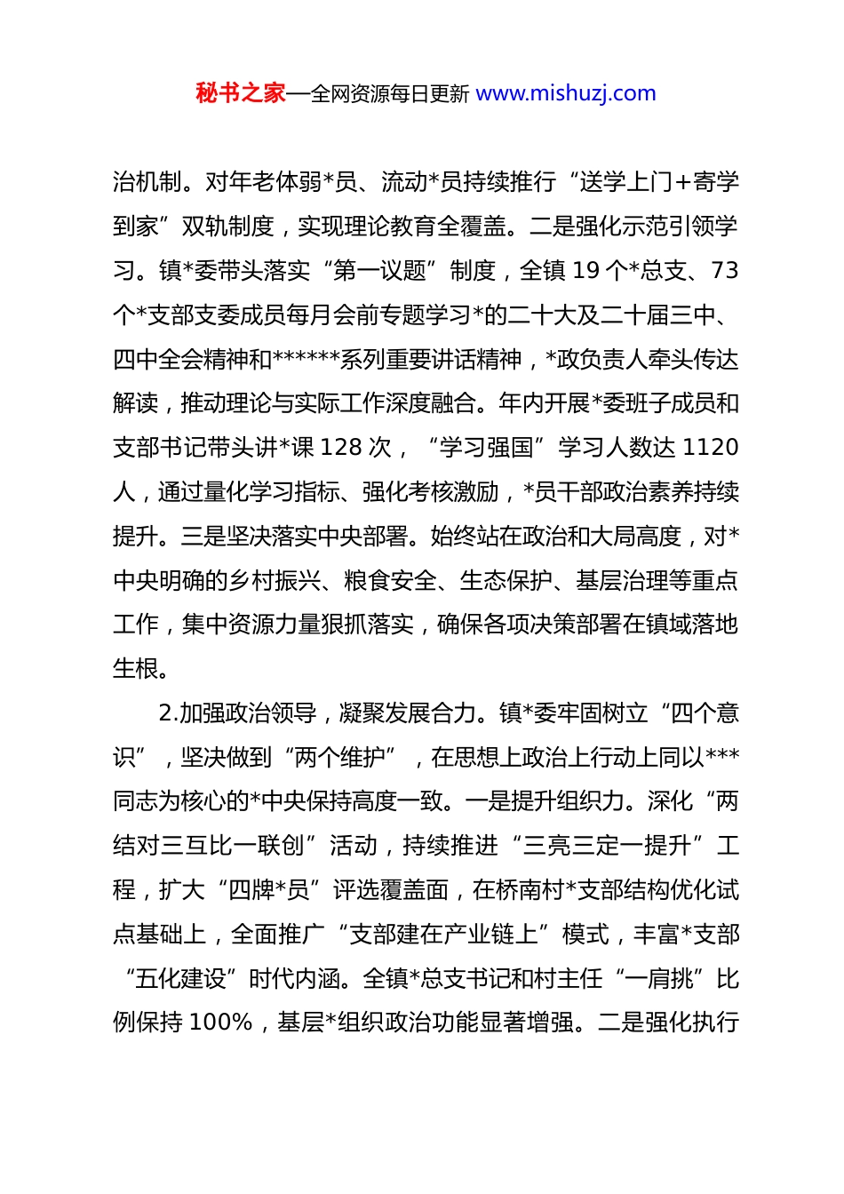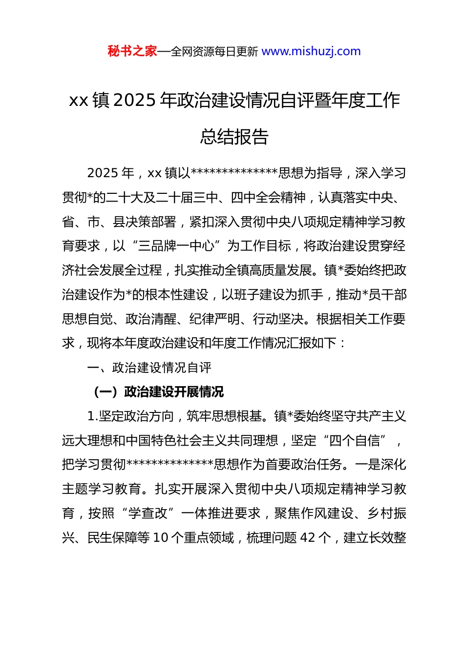 秘书之家—全网资源每日更新 www.mishuzj.comxx 镇 2025 年政治建设情况自评暨年度工作总结报告2025 年,xx 镇以**************思想为指导,深入学习贯彻*的二十大及二十届三中、四中全会精神,认真落实中央、省、市、县决策部署,紧扣深入贯彻中央八项规定精神学习教育要求,以“三品牌一中心”为工作目标,将政治建设贯穿经济社会发展全过程,扎实推动全镇高质量发展。镇*委始终把政治建设作为*的根本性建设,以班子建设为抓手,推动*员干部思想自觉、政治清醒、纪律严明、行动坚决。根据相关工作要求,现将本年度政治建设和年度工作情况汇报如下:一、政治建设情况自评(一)政治建设开展情况1.坚定政治方向,筑牢思想根基。镇*委始终坚守共产主义远大理想和中国特色社会主义共同理想,坚定“四个自信”,把学习贯彻**************思想作为首要政治任务。一是深化主题学习教育。扎实开展深入贯彻中央八项规定精神学习教育,按照“学查改”一体推进要求,聚焦作风建设、乡村振兴、民生保障等 10 个重点领域,梳理问题 42 个,建立长效整秘书之家—全网资源每日更新 www.mishuzj.com治机制。对年老体弱*员、流动*员持续推行“送学上门+寄学到家”双轨制度,实现理论教育全覆盖。二是强化示范引领学习。镇*委带头落实“第一议题”制度,全镇 19 个*总支、73个*支部支委成员每月会前专题学习*的二十大及二十届三中、四中全会精神和******系列重要讲话精神,*政负责人牵头传达解读,推动理论与实际工作深度融合。年内开展*委班子成员和支部书记带头讲*课 128 次,“学习强国”学习人数达 1120人,通过量化学习指标、强化考核激励,*员干部政治素养持续提升。三是坚决落实中央部署。始终站在政治和大局高度,对*中央明确的乡村振兴、粮食安全、生态保护、基层治理等重点工作,集中资源力量狠抓落实,确保各项决策部署在镇域落地生根。2.加强政治领导,凝聚发展合力。镇*委牢固树立“四个意识”,坚决做到“两个维护”,在思想上政治上行动上同以***同志为核心的*中央保持高度一致。一是提升组织力。深化“两结对三互比一联创”活动,持续推进“三亮三定一提升”工程,扩大“四牌*员”评选覆盖面,在桥南村*支部结构优化试点基础上,全面推广“支部建在产业链上”模式,丰富*支部“五化建设”时代内涵。全镇*总支书记和村主任“一肩挑”比例保持 100%,基层*组织政治功能显著增强。二是强化执行秘书之家—全网资源每日更新 www.mishuzj.com力。打造 12 个市级、25 个县级模范支部,建立先进支部与后进支部“一对一”帮带机制,形成基层*组织互帮互助常态化格局,确保各项部署不折不扣落实到位。三是锻造战斗力。组织全镇*员干部在乡村振兴、生态环保、安全生产等 12 项重点工作中亮身份、亮承诺、亮成绩,开展“*旗领航・攻坚争先”系列活动,让*徽在一线闪耀、*旗在基层飘扬,*组织战斗堡垒作用充分发挥。3.夯实政治根基,厚植为民情怀。镇*委紧扣民心这个最大的政治,始终站稳人民立场,践行群众路线。严格落实中央八项规定及其实施细则精神,坚决纠治形式主义、官僚主义,持续巩固*群干群血肉联系。把保障人民群众生命财产安全放在首位,在常态化疫情防控、防汛备汛、防灾减灾等工作中,*委统筹、支部动员、*员带头,累计组织*员群众义务值守 3200 余人次、应急处置演练 18 场次,发放慰问物资 46 批次。大力推行“一线工作法”,镇村干部下沉基层走访调研 1560 余人次,解决群众急难愁盼问题 382 件,群众满意度较上年提升8.5 个百分点。4.涵养政治生态,营造清风正气。镇*委严格执行新形势下*内政治生活若干准则,认真贯彻民主集中制,加强*内政治文化建设。一是坚持正确用人导向。以中央八项规定精神学习教秘书之家—全网资源每日更新 www.mishuzj.com育为契机,强化干部担当精神和大局意识,修订《xx 镇办点干部管理考核办法》,选派 28 名优秀青年干部到偏远村场、重点项目一线锻炼,树立“重实干、重实绩”的选人用人导向。二是严肃*内政治生活。高质量召开专题民主生活会和组织生活会,批评与自我批评“真点问题、点真问题”,杜绝“...