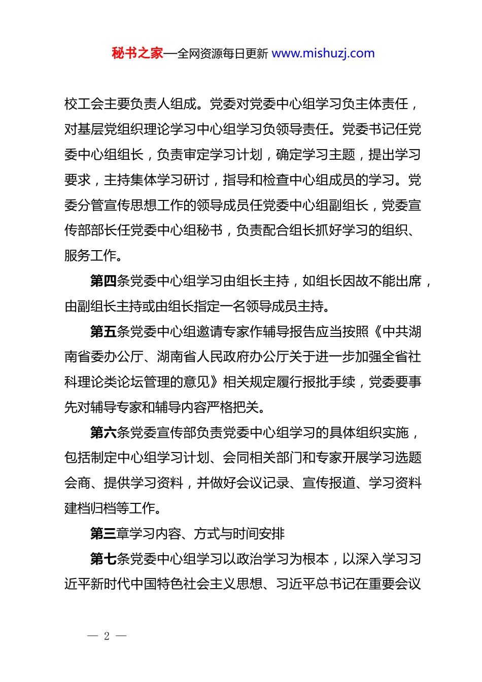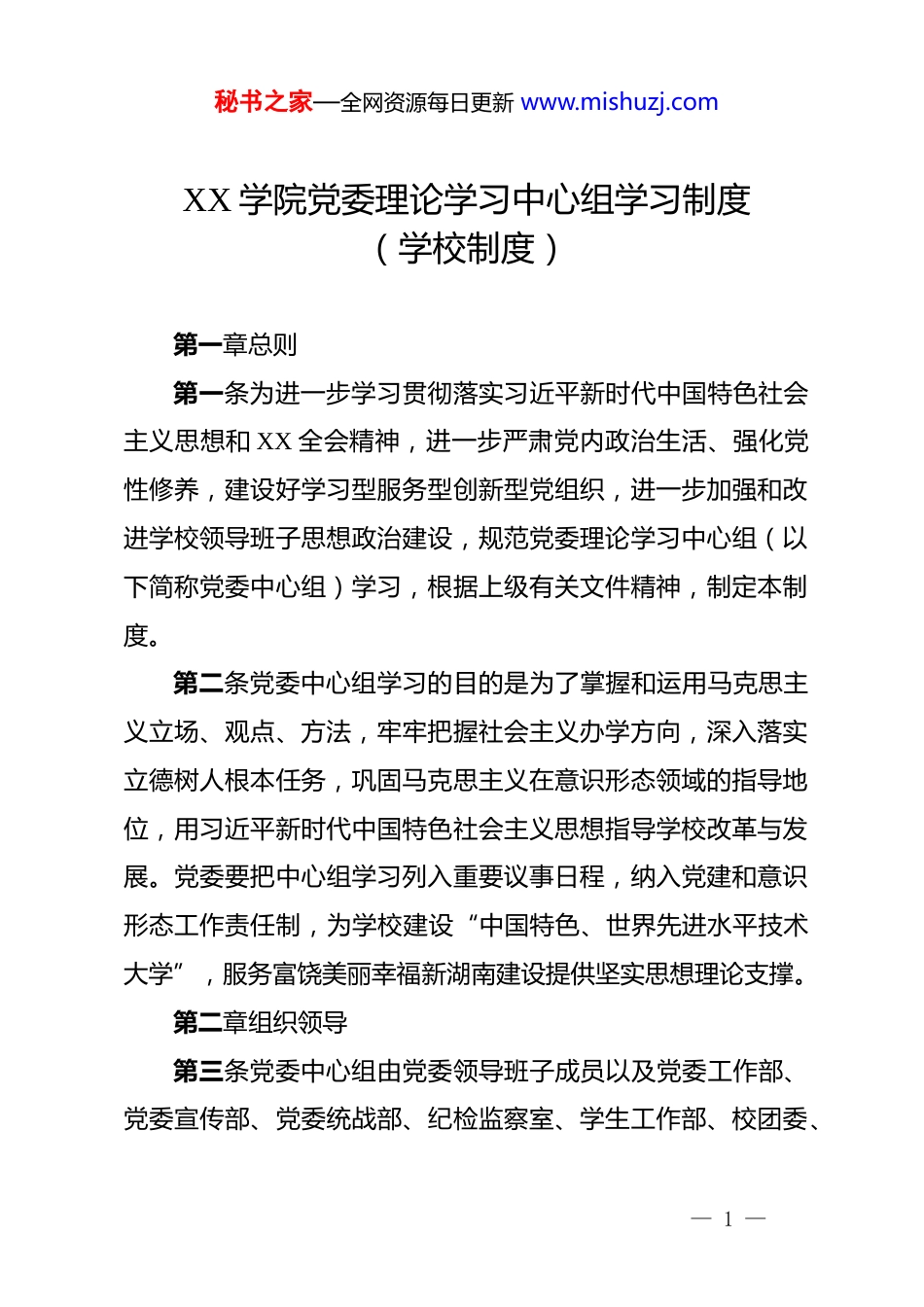 秘书之家—全网资源每日更新 www.mishuzj.comXX 学院党委理论学习中心组学习制度(学校制度)第一章总则第一条为进一步学习贯彻落实习近平新时代中国特色社会主义思想和 XX 全会精神,进一步严肃党内政治生活、强化党性修养,建设好学习型服务型创新型党组织,进一步加强和改进学校领导班子思想政治建设,规范党委理论学习中心组(以下简称党委中心组)学习,根据上级有关文件精神,制定本制度。第二条党委中心组学习的目的是为了掌握和运用马克思主义立场、观点、方法,牢牢把握社会主义办学方向,深入落实立德树人根本任务,巩固马克思主义在意识形态领域的指导地位,用习近平新时代中国特色社会主义思想指导学校改革与发展。党委要把中心组学习列入重要议事日程,纳入党建和意识形态工作责任制,为学校建设“中国特色、世界先进水平技术大学”,服务富饶美丽幸福新湖南建设提供坚实思想理论支撑。第二章组织领导第三条党委中心组由党委领导班子成员以及党委工作部、党委宣传部、党委统战部、纪检监察室、学生工作部、校团委、— 1 —秘书之家—全网资源每日更新 www.mishuzj.com校工会主要负责人组成。党委对党委中心组学习负主体责任,对基层党组织理论学习中心组学习负领导责任。党委书记任党委中心组组长,负责审定学习计划,确定学习主题,提出学习要求,主持集体学习研讨,指导和检查中心组成员的学习。党委分管宣传思想工作的领导成员任党委中心组副组长,党委宣传部部长任党委中心组秘书,负责配合组长抓好学习的组织、服务工作。第四条党委中心组学习由组长主持,如组长因故不能出席,由副组长主持或由组长指定一名领导成员主持。第五条党委中心组邀请专家作辅导报告应当按照《中共湖南省委办公厅、湖南省人民政府办公厅关于进一步加强全省社科理论类论坛管理的意见》相关规定履行报批手续,党委要事先对辅导专家和辅导内容严格把关。第六条党委宣传部负责党委中心组学习的具体组织实施,包括制定中心组学习计划、会同相关部门和专家开展学习选题会商、提供学习资料,并做好会议记录、宣传报道、学习资料建档归档等工作。第三章学习内容、方式与时间安排第七条党委中心组学习以政治学习为根本,以深入学习习近平新时代中国特色社会主义思想、习近平总书记在重要会议— 2 —秘书之家—全网资源每日更新 www.mishuzj.com和重大活动上发表的讲话、习近平总书记关于教育的重要论述、习近平总书记对湖南工作的重要指示精神作为学习重点,并根据新的形势和发展,开展党的重大方针政策、上级的重大决策、经济、法律、文化、教育、党风廉政建设理论、现代科技知识、现代管理理论及重要时事等方面的学习。坚持及时学、全面学、准确学、深入学,学以致用、学用结合,切实提高运用习近平新时代中国特色社会主义思想武装头脑、指导实践、推动工作的本领。第八条党委中心组学习应当将集体学习研讨作为主要形式,同时根据实际情况,每年开展 1—2 次体验式、情景式现场学习,将参观考察和研讨交流相结合,增强学习效果。坚持将集中学习与个人自学相结合,集中学习可以采取听辅导报告和专题讲座、观看录像和展览、社会考察、专题讨论等灵活多样的学习方式。要坚持目标导向、问题导向,紧密结合当前国内外形势与政策,针对学校改革发展中的重点难点问题,探索新思路、新举措、新方法,系统设计学习研讨主题。每次学习专题讨论由组长确定中心发言人。注重运用校内外的网络平台开展学习,积极开发网络学习产品。第九条党委中心组学习原则上每月开展 1 次,每次学习时间不少于半天,每年不少于 12 次。如遇重要内容须及时传达,— 3 —秘书之家—全网资源每日更新 www.mishuzj.com须随时安排学习。党委中心组成员要定期或不定期为干部、师生作学习辅导报告。第十条党委中心组应当按照档案管理要求,建立年度学习档案,对学习制度、学习计划和方案、学习通知、学习记录、学习资料、发言材料、调研报告、理论文章等建档归档。第四章考勤与考核第十一条党委中心组学习实行严格的签到考勤制度。中心组成员必须准时参加学习,确因特殊情况不能参加学习的,必须提前向组长请假...