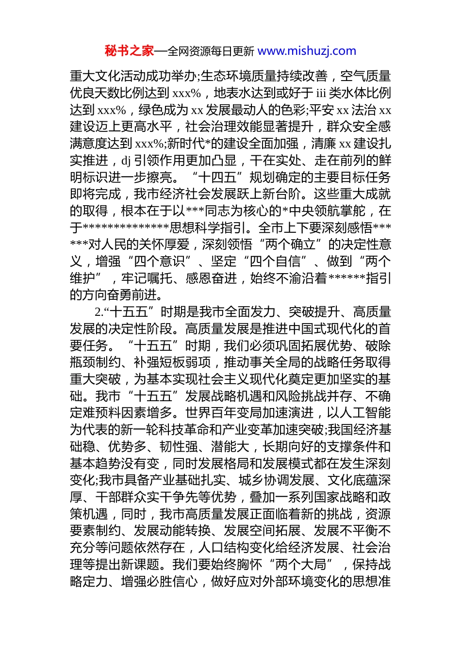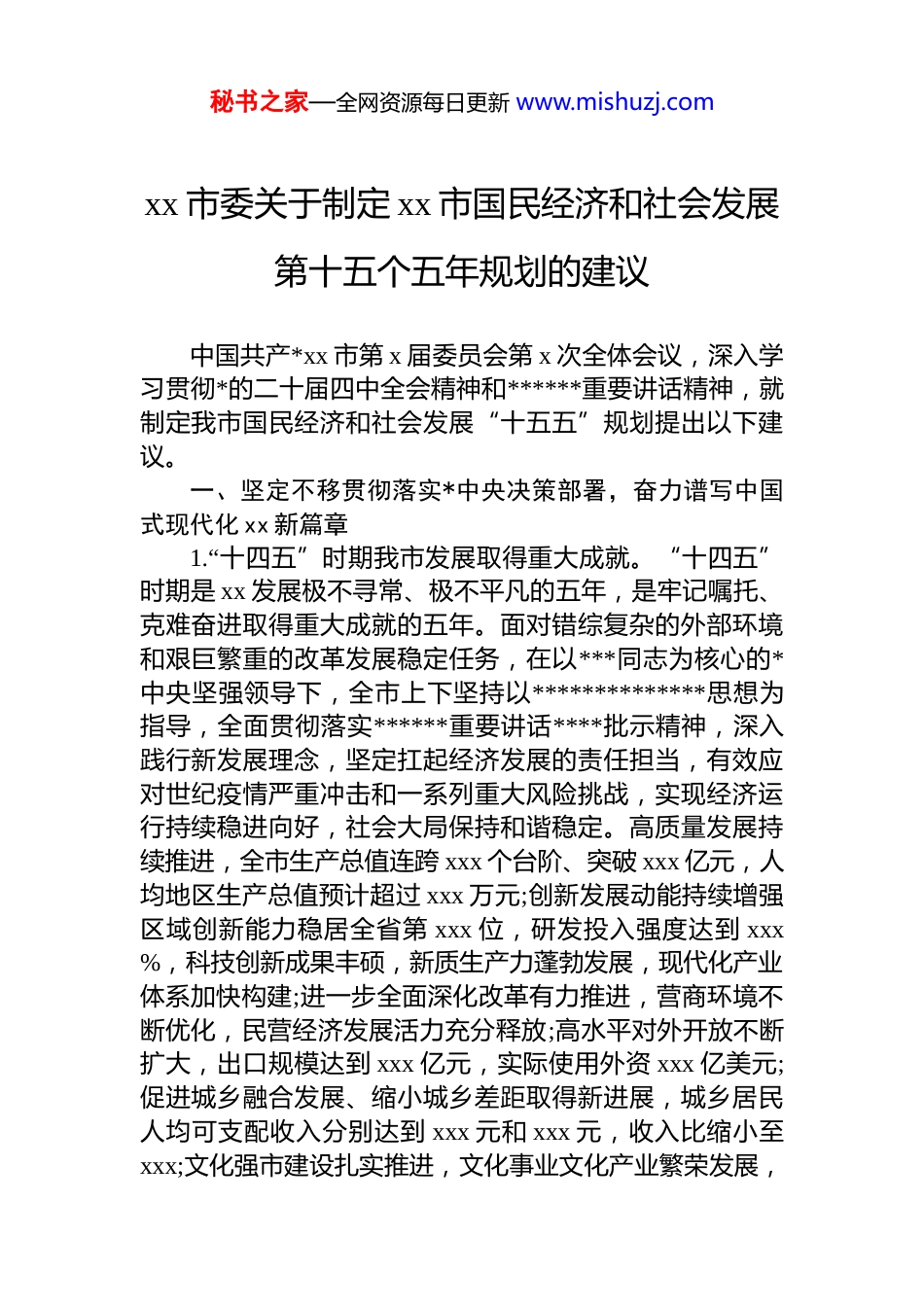 秘书之家—全网资源每日更新 www.mishuzj.comxx 市委关于制定 xx 市国民经济和社会发展第十五个五年规划的建议中国共产*xx 市第 x 届委员会第 x 次全体会议,深入学习贯彻*的二十届四中全会精神和******重要讲话精神,就制定我市国民经济和社会发展“十五五”规划提出以下建议。一、坚定不移贯彻落实*中央决策部署,奋力谱写中国式现代化 xx 新篇章1.“十四五”时期我市发展取得重大成就。“十四五”时期是 xx 发展极不寻常、极不平凡的五年,是牢记嘱托、克难奋进取得重大成就的五年。面对错综复杂的外部环境和艰巨繁重的改革发展稳定任务,在以***同志为核心的*中央坚强领导下,全市上下坚持以**************思想为指导,全面贯彻落实******重要讲话****批示精神,深入践行新发展理念,坚定扛起经济发展的责任担当,有效应对世纪疫情严重冲击和一系列重大风险挑战,实现经济运行持续稳进向好,社会大局保持和谐稳定。高质量发展持续推进,全市生产总值连跨 xxx 个台阶、突破 xxx 亿元,人均地区生产总值预计超过 xxx 万元;创新发展动能持续增强区域创新能力稳居全省第 xxx 位,研发投入强度达到 xxx%,科技创新成果丰硕,新质生产力蓬勃发展,现代化产业体系加快构建;进一步全面深化改革有力推进,营商环境不断优化,民营经济发展活力充分释放;高水平对外开放不断扩大,出口规模达到 xxx 亿元,实际使用外资 xxx 亿美元;促进城乡融合发展、缩小城乡差距取得新进展,城乡居民人均可支配收入分别达到 xxx 元和 xxx 元,收入比缩小至xxx;文化强市建设扎实推进,文化事业文化产业繁荣发展,秘书之家—全网资源每日更新 www.mishuzj.com重大文化活动成功举办;生态环境质量持续改善,空气质量优良天数比例达到 xxx%,地表水达到或好于 iii 类水体比例达到 xxx%,绿色成为 xx 发展最动人的色彩;平安 xx 法治 xx建设迈上更高水平,社会治理效能显著提升,群众安全感满意度达到 xxx%;新时代*的建设全面加强,清廉 xx 建设扎实推进,dj 引领作用更加凸显,干在实处、走在前列的鲜明标识进一步擦亮。“十四五”规划确定的主要目标任务即将完成,我市经济社会发展跃上新台阶。这些重大成就的取得,根本在于以***同志为核心的*中央领航掌舵,在于**************思想科学指引。全市上下要深刻感悟******对人民的关怀厚爱,深刻领悟“两个确立”的决定性意义,增强“四个意识”、坚定“四个自信”、做到“两个维护”,牢记嘱托、感恩奋进,始终不渝沿着******指引的方向奋勇前进。2.“十五五”时期是我市全面发力、突破提升、高质量发展的决定性阶段。高质量发展是推进中国式现代化的首要任务。“十五五”时期,我们必须巩固拓展优势、破除瓶颈制约、补强短板弱项,推动事关全局的战略任务取得重大突破,为基本实现社会主义现代化奠定更加坚实的基础。我市“十五五”发展战略机遇和风险挑战并存、不确定难预料因素增多。世界百年变局加速演进,以人工智能为代表的新一轮科技革命和产业变革加速突破;我国经济基础稳、优势多、韧性强、潜能大,长期向好的支撑条件和基本趋势没有变,同时发展格局和发展模式都在发生深刻变化;我市具备产业基础扎实、城乡协调发展、文化底蕴深厚、干部群众实干争先等优势,叠加一系列国家战略和政策机遇,同时,我市高质量发展正面临着新的挑战,资源要素制约、发展动能转换、发展空间拓展、发展不平衡不充分等问题依然存在,人口结构变化给经济发展、社会治理等提出新课题。我们要始终胸怀“两个大局”,保持战略定力、增强必胜信心,做好应对外部环境变化的思想准秘书之家—全网资源每日更新 www.mishuzj.com备和工作准备,积极识变应变求变,敢于斗争、善于斗争迎难而上、攻坚克难,集中力量办好自己的事,努力在变局中赢得优势和主动,奋力谱写中国式现代化 xx 新篇章。3.“十五五”时期 xx 市经济社会发展指导思想。坚持以**************思想为指导,全面贯彻落实*的二十大和二十届历次全会精神,深入学习贯彻******重要讲话****批示精神,统筹推进“五位一体”总体布局,协调推进“四个全面”战略布局,完整...