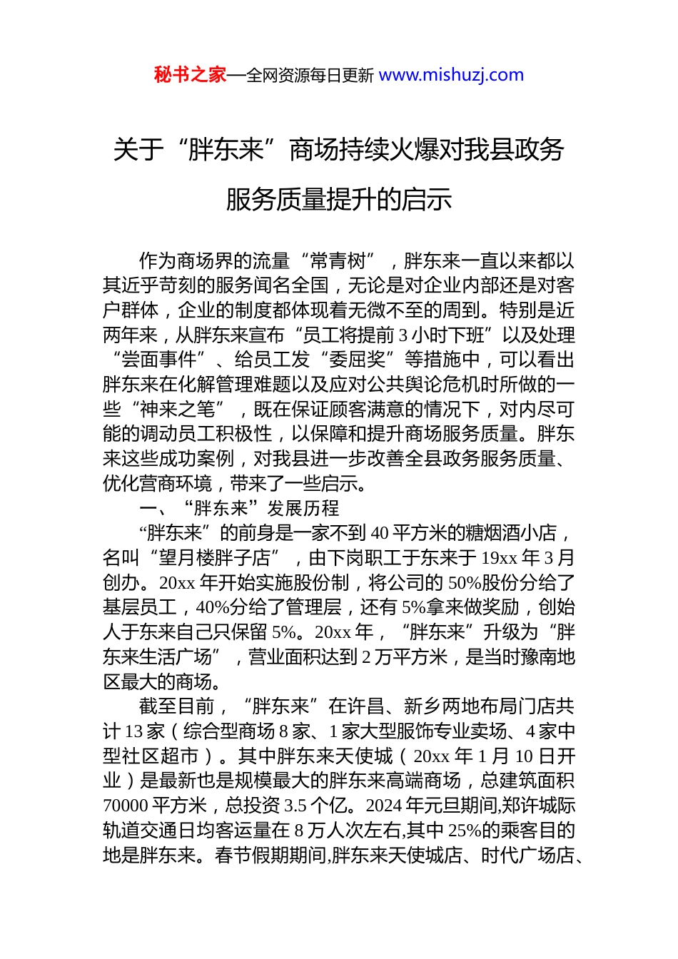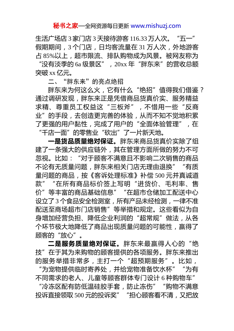 秘书之家—全网资源每日更新 www.mishuzj.com关于“胖东来”商场持续火爆对我县政务服务质量提升的启示作为商场界的流量“常青树”,胖东来一直以来都以其近乎苛刻的服务闻名全国,无论是对企业内部还是对客户群体,企业的制度都体现着无微不至的周到。特别是近两年来,从胖东来宣布“员工将提前 3 小时下班”以及处理“尝面事件”、给员工发“委屈奖”等措施中,可以看出胖东来在化解管理难题以及应对公共舆论危机时所做的一些“神来之笔”,既在保证顾客满意的情况下,对内尽可能的调动员工积极性,以保障和提升商场服务质量。胖东来这些成功案例,对我县进一步改善全县政务服务质量、优化营商环境,带来了一些启示。一、“胖东来”发展历程“胖东来”的前身是一家不到 40 平方米的糖烟酒小店,名叫“望月楼胖子店”,由下岗职工于东来于 19xx 年 3 月创办。20xx 年开始实施股份制,将公司的 50%股份分给了基层员工,40%分给了管理层,还有 5%拿来做奖励,创始人于东来自己只保留 5%。20xx 年,“胖东来”升级为“胖东来生活广场”,营业面积达到 2 万平方米,是当时豫南地区最大的商场。截至目前,“胖东来”在许昌、新乡两地布局门店共计 13 家(综合型商场 8 家、1 家大型服饰专业卖场、4 家中型社区超市)。其中胖东来天使城(20xx 年 1 月 10 日开业)是最新也是规模最大的胖东来高端商场,总建筑面积70000 平方米,总投资 3.5 个亿。2024 年元旦期间,郑许城际轨道交通日均客运量在 8 万人次左右,其中 25%的乘客目的地是胖东来。春节假期期间,胖东来天使城店、时代广场店、秘书之家—全网资源每日更新 www.mishuzj.com生活广场店 3 家门店 3 天接待游客 116.33 万人次。“五一”假期期间,3 个门店,日均客流量在 31 万人次,外地游客占 85%以上,超市限流、排队购物成为风景。被网友称为“没有淡季的 6a 级景区”,20xx 年“胖东来”的营收总额突破 xx 亿元。二、“胖东来”的亮点绝招胖东来为何这么火,它有什么“绝招”值得我们借鉴?通过调研发现,胖东来正是凭借商品货真价实、服务精益求精、尊重员工权益这“三板斧”,不惜用一些“反商业”的手段,去创造更完善的体验,从而不知不觉地积累了更强的用户黏性,完成了用户的“全面体验管理”,在“千店一面”的零售业“砍出”了一片新天地。一是货品质量绝对保证。胖东来商品货真价实除了组建了一条强大的供应链外,其在管理方面所做的努力不可忽视。比如:“对于顾客不满意且不影响二次销售的商品不论有无质量问题,胖东来相关门店无理由退换”“有质量问题的商品,按《客诉处理标准》补偿 500 元并真诚道款”“在所有商品标价签上写明“进货价、毛利率、售价”等丰富的商品基础信息”“在超市仓储加工配送中心设立了 3 个食品安全检测室,所有产品未经检测,一律不准配送至商场超市门店销售”等举措和规定。这些看似为自身增加经营负担、降低企业利润的“超常规”做法,从各个环节极大地降低了商品出现质量问题的可能性,赢得了顾客的“放心”。二是服务质量绝对保证。胖东来最赢得人心的“绝技”在于其为来购物的顾客提供的各项服务。胖东来推出的服务举措非常多,主打一个“超预期服务”。比如,“为宠物提供临时寄养处,并给宠物准备饮水杯”“为有不同需求的老人、儿童等顾客群体专门设计 6 种购物车”“冷冻区配有防低温硅胶手套,防止冻伤”“购物不满意投诉直接领取 500 元的投诉奖”“担心顾客看不清,又把放秘书之家—全网资源每日更新 www.mishuzj.com大镜放在一边”“旗下每个商场超市门店都建立了双重安全预防体系,配备有专业的安全管理人员,如发现险情或安全隐患,做到快速反应”“实行去皮(去除外包装物重量)称重和沥水称重”“开通急购热线,只要顾客有特殊原因电话联系急需商品的,按顾客要求配送到位”等等。这些举措的核心宗旨就是提前想到一切在顾客购物中可能遇到的情况,并提供超出同期其他商场甚至是消费者心里预期的服务,既“想都不敢想”,赢得顾客的“舒心”。三是员工身心质量绝对保证。在对待员工上,“胖东来”秉承左手...