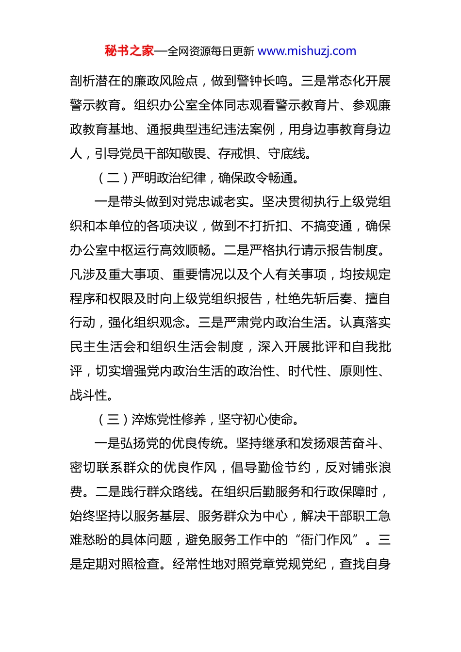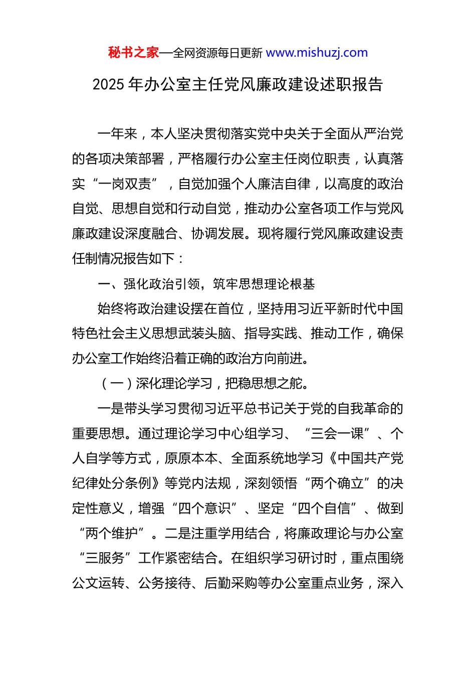 秘书之家—全网资源每日更新 www.mishuzj.com2025 年办公室主任党风廉政建设述职报告 一年来,本人坚决贯彻落实党中央关于全面从严治党的各项决策部署,严格履行办公室主任岗位职责,认真落实“一岗双责”,自觉加强个人廉洁自律,以高度的政治自觉、思想自觉和行动自觉,推动办公室各项工作与党风廉政建设深度融合、协调发展。现将履行党风廉政建设责任制情况报告如下:一、强化政治引领,筑牢思想理论根基始终将政治建设摆在首位,坚持用习近平新时代中国特色社会主义思想武装头脑、指导实践、推动工作,确保办公室工作始终沿着正确的政治方向前进。(一)深化理论学习,把稳思想之舵。一是带头学习贯彻习近平总书记关于党的自我革命的重要思想。通过理论学习中心组学习、“三会一课”、个人自学等方式,原原本本、全面系统地学习《中国共产党纪律处分条例》等党内法规,深刻领悟“两个确立”的决定性意义,增强“四个意识”、坚定“四个自信”、做到“两个维护”。二是注重学用结合,将廉政理论与办公室“三服务”工作紧密结合。在组织学习研讨时,重点围绕公文运转、公务接待、后勤采购等办公室重点业务,深入秘书之家—全网资源每日更新 www.mishuzj.com剖析潜在的廉政风险点,做到警钟长鸣。三是常态化开展警示教育。组织办公室全体同志观看警示教育片、参观廉政教育基地、通报典型违纪违法案例,用身边事教育身边人,引导党员干部知敬畏、存戒惧、守底线。(二)严明政治纪律,确保政令畅通。一是带头做到对党忠诚老实。坚决贯彻执行上级党组织和本单位的各项决议,做到不打折扣、不搞变通,确保办公室中枢运行高效顺畅。二是严格执行请示报告制度。凡涉及重大事项、重要情况以及个人有关事项,均按规定程序和权限及时向上级党组织报告,杜绝先斩后奏、擅自行动,强化组织观念。三是严肃党内政治生活。认真落实民主生活会和组织生活会制度,深入开展批评和自我批评,切实增强党内政治生活的政治性、时代性、原则性、战斗性。(三)淬炼党性修养,坚守初心使命。一是弘扬党的优良传统。坚持继承和发扬艰苦奋斗、密切联系群众的优良作风,倡导勤俭节约,反对铺张浪费。二是践行群众路线。在组织后勤服务和行政保障时,始终坚持以服务基层、服务群众为中心,解决干部职工急难愁盼的具体问题,避免服务工作中的“衙门作风”。三是定期对照检查。经常性地对照党章党规党纪,查找自身秘书之家—全网资源每日更新 www.mishuzj.com在思想觉悟、纪律作风上的差距,及时纠偏正向,保持共产党员的先进性和纯洁性。二、压紧压实责任,构建廉政防控体系作为办公室主任,深知“一岗双责”是政治责任,坚持把党风廉政建设要求融入分管工作全过程,做到业务工作和廉政建设同谋划、同部署、同落实。(一)明晰责任链条,层层传导压力。一是完善责任清单。年初结合办公室工作特点,制定并细化党风廉政建设责任清单,明确办公室各岗位、各层级在廉政建设中的具体任务和要求,实现压力传导横向到边、纵向到底。二是定期专题研究。在部署办公室重点工作时,同步分析研判潜在的廉政风险,针对性提出防控措施,确保风险意识始终贯穿工作始终。三是强化述责述廉。组织办公室内部科室负责人开展述责述廉,对发现的问题及时提醒、督促整改,推动管党治党责任落实落细。(二)坚持制度先行,规范权力运行。一是健全内控制度体系。针对办公室在公务接待、车辆管理、资产采购、印章使用等权力集中、风险较高的领域,全面梳理现有制度,及时堵塞漏洞,修订完善了《公务接待管理办法》《行政资产采购规范》等一系列内控制度。二是严格执行规章制度。要求全体人员严格按照制度秘书之家—全网资源每日更新 www.mishuzj.com流程办事,做到程序合法、手续完备,坚决杜绝“人情代替制度”的现象,用制度的刚性约束规范自由裁量权。三是加强监督检查。采取不定期抽查、交叉检查等方式,对制度执行情况进行监督,对发现的违规行为严肃批评教育,限期整改。(三)强化日常监督,抓早抓小、防微杜渐。一是常态化开展谈心谈话。对新入职、转岗或岗位变动的同志,及时进行廉政提醒谈话,帮助其绷紧纪律之弦。二是...