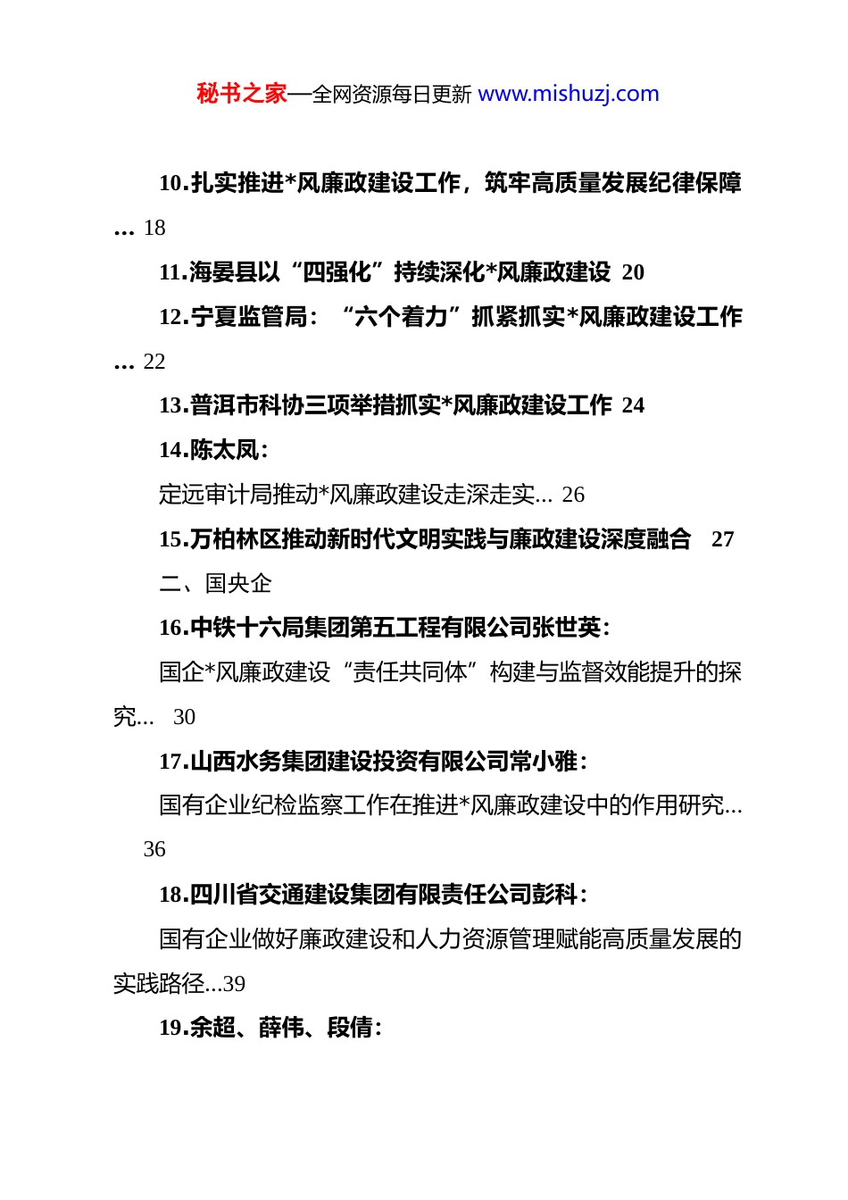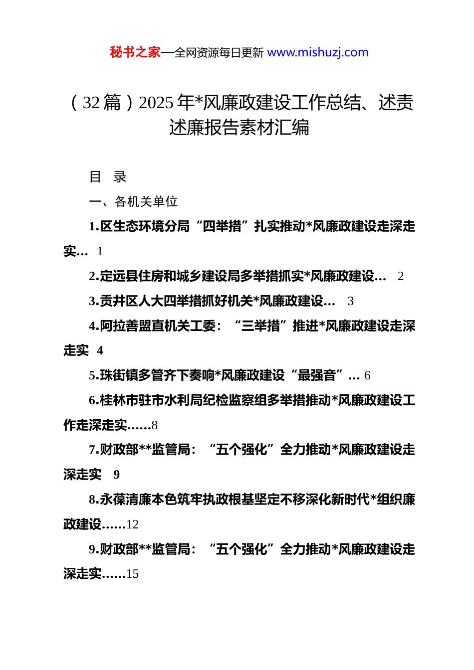 秘书之家—全网资源每日更新 www.mishuzj.com(32 篇)2025 年*风廉政建设工作总结、述责述廉报告素材汇编目录一、各机关单位1.区生态环境分局“四举措”扎实推动*风廉政建设走深走实… 12.定远县住房和城乡建设局多举措抓实*风廉政建设…23.贡井区人大四举措抓好机关*风廉政建设…34.阿拉善盟直机关工委:“三举措”推进*风廉政建设走深走实 45.珠街镇多管齐下奏响*风廉政建设“最强音”… 66.桂林市驻市水利局纪检监察组多举措推动*风廉政建设工作走深走实……87.财政部**监管局:“五个强化”全力推动*风廉政建设走深走实98.永葆清廉本色筑牢执政根基坚定不移深化新时代*组织廉政建设……129.财政部**监管局:“五个强化”全力推动*风廉政建设走深走实……15秘书之家—全网资源每日更新 www.mishuzj.com10.扎实推进*风廉政建设工作,筑牢高质量发展纪律保障… 1811.海晏县以“四强化”持续深化*风廉政建设 2012.宁夏监管局:“六个着力”抓紧抓实*风廉政建设工作… 2213.普洱市科协三项举措抓实*风廉政建设工作 2414.陈太凤:定远审计局推动*风廉政建设走深走实… 2615.万柏林区推动新时代文明实践与廉政建设深度融合27二、国央企16.中铁十六局集团第五工程有限公司张世英:国企*风廉政建设“责任共同体”构建与监督效能提升的探究…3017.山西水务集团建设投资有限公司常小雅:国有企业纪检监察工作在推进*风廉政建设中的作用研究…3618.四川省交通建设集团有限责任公司彭科:国有企业做好廉政建设和人力资源管理赋能高质量发展的实践路径…3919.余超、薛伟、段倩:秘书之家—全网资源每日更新 www.mishuzj.com加强*风廉政建设夯实国企作风根基…4320.山西冀中能源集团矿业有限责任公司曹彩芳:加强企业纪检监察推动*风廉政建设…4721.中共中央*校(国家行政学院)李露莹:论国有企业*风廉政建设工作的创新路径… 5122.卓霞:企业*风廉政建设在企业形象塑造中的作用…5423.天津海河设计集团有限公司郑宝军:提高政治站位强化使命担当推动*风廉政建设反腐败工作走深走实…5924.南通大学朱奕霖:新时代国有企业*风廉政建设探赜…6225.山西晋非投资有限公司宿书浩:新时代企业*风廉政建设的有效策略探讨… 6826.中交资产管理有限公司曹园园:新形势下加强交通建设行业国有企业*风廉政建设策略研究… 7127.陈立峰:以“3534”全周期管理推进国企*风廉政建设… 7528.中国石油长庆油田分公司第一采油厂曹世忠:以高质量*风廉政建设推动国有企业行稳致远…80秘书之家—全网资源每日更新 www.mishuzj.com三、其他29.上海市胸科医院吴锦华:持续推进*风廉政建设制度化、常态化、长效化… 8430.晏婷婷:*风廉政建设融入高校清廉文化建设路径研究8631.西安外国语大学孙雅菲:加强高校*风廉政建设不断筑牢思想防线 9232.李云飞:新形势下驻保高校推进*风廉政建设和反腐败斗争的对策研究 95区生态环境分局“四举措”扎实推动*风廉政建设走深走实(2025 年 6 月 11 日)今年以来,区生态环境分局坚决贯彻落实全面从严治*要求,大力弘扬“六干”作风,纵深推进清廉生态环保建设,推动*风廉政建设走深走实。一是高位谋划,把稳“廉洁舵”。研究制定《*风廉政建设专项整治实施方案》,召开全面从严治*专题会议,传达上级有关精神,第一时间研究部署*风廉政建设工作,谋划 2025 年*风廉政工作任务,坚决落实全面从严治*主体责任。更新完善考勤、外出等各类制度,进一步强化对干部的日常管理。二是以学促廉,勤念“紧箍咒”。开展*风廉政专题学习、秘书之家—全网资源每日更新 www.mishuzj.com理论学习中心组学习、*支部专题*课等活动,通过领导领学、*员深学、集中研讨等相结合的方式,深入学习《中国共产*廉洁自律准则》、《中国共产 dj 律处分条例》、违法违纪典型案例等内容,进一步深化对*规 dj 的理解和认识。三是以责践廉,筑牢“防火墙”。更新完善廉政信息,动态掌握廉政档案,助力精准监督。围绕是否存在违规违纪问题开展自查排查,发现和主动上报各类问题,对 4 名干部存在的问题进行了批评教育。严格落实谈心谈话制度,“一把手”与班子成员,班子...
